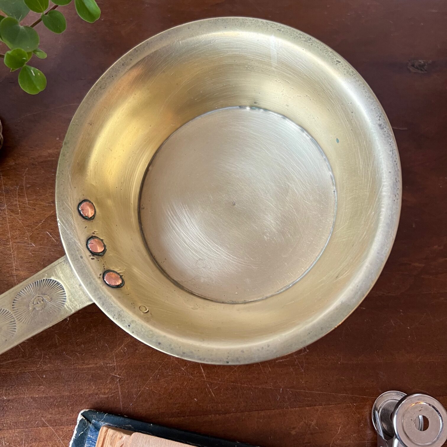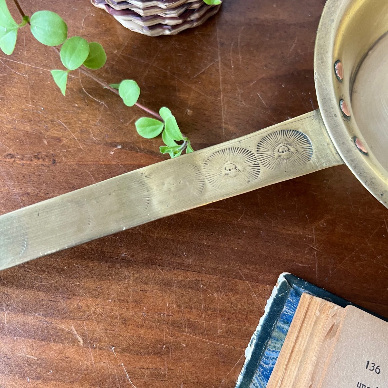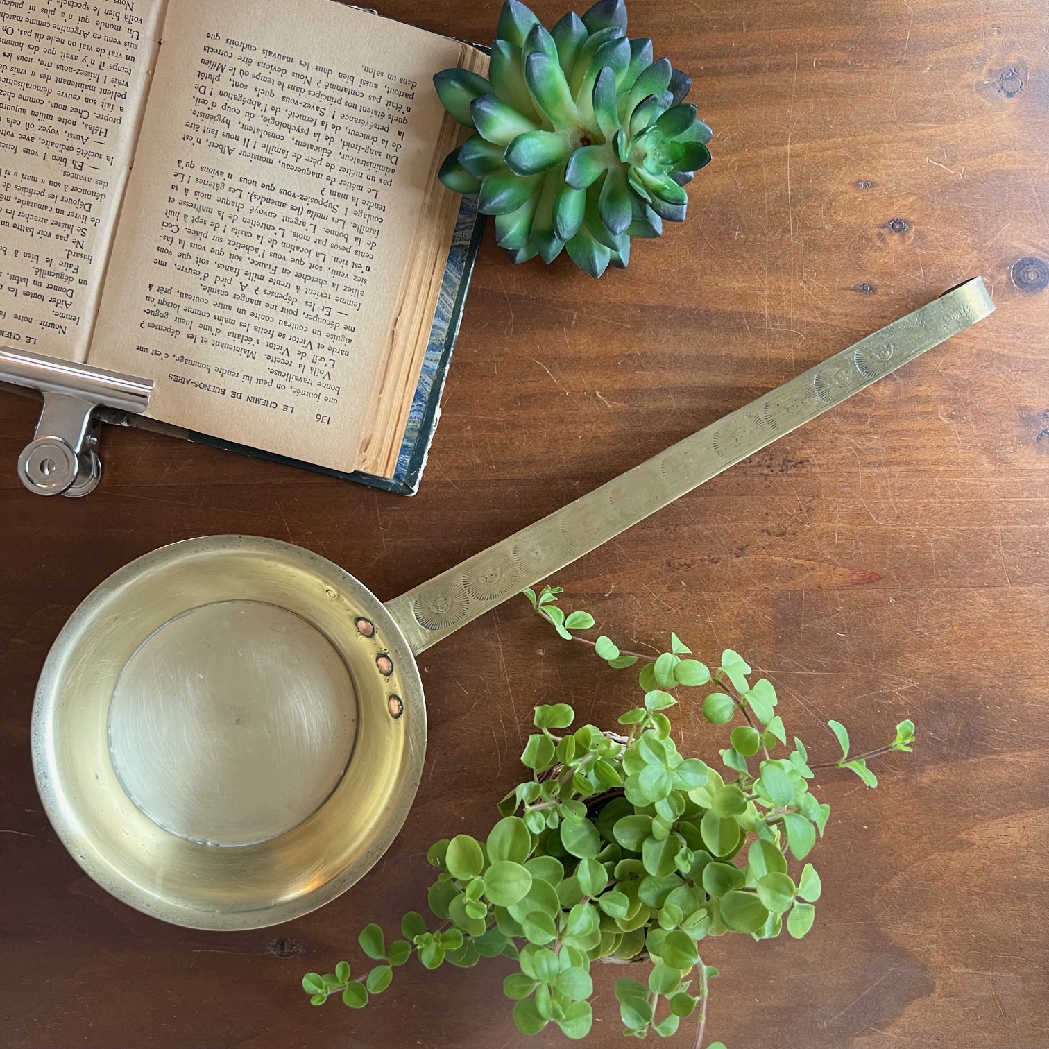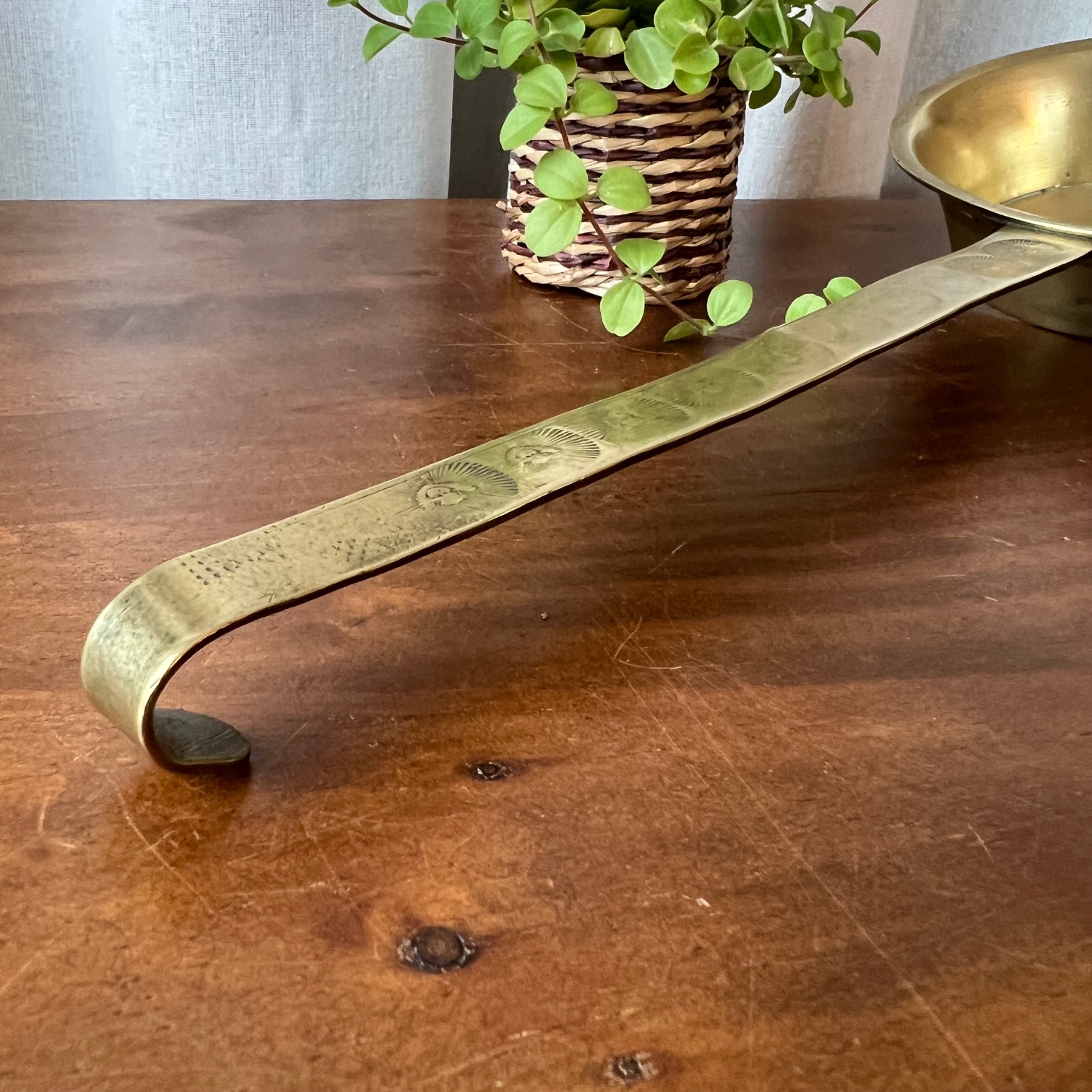 Grande louche en laiton doré avec son manche joliment ciselé : beaucoup de charme pour cet ustensile d’un autre temps qui se plaira en décoration dans votre cuisine !