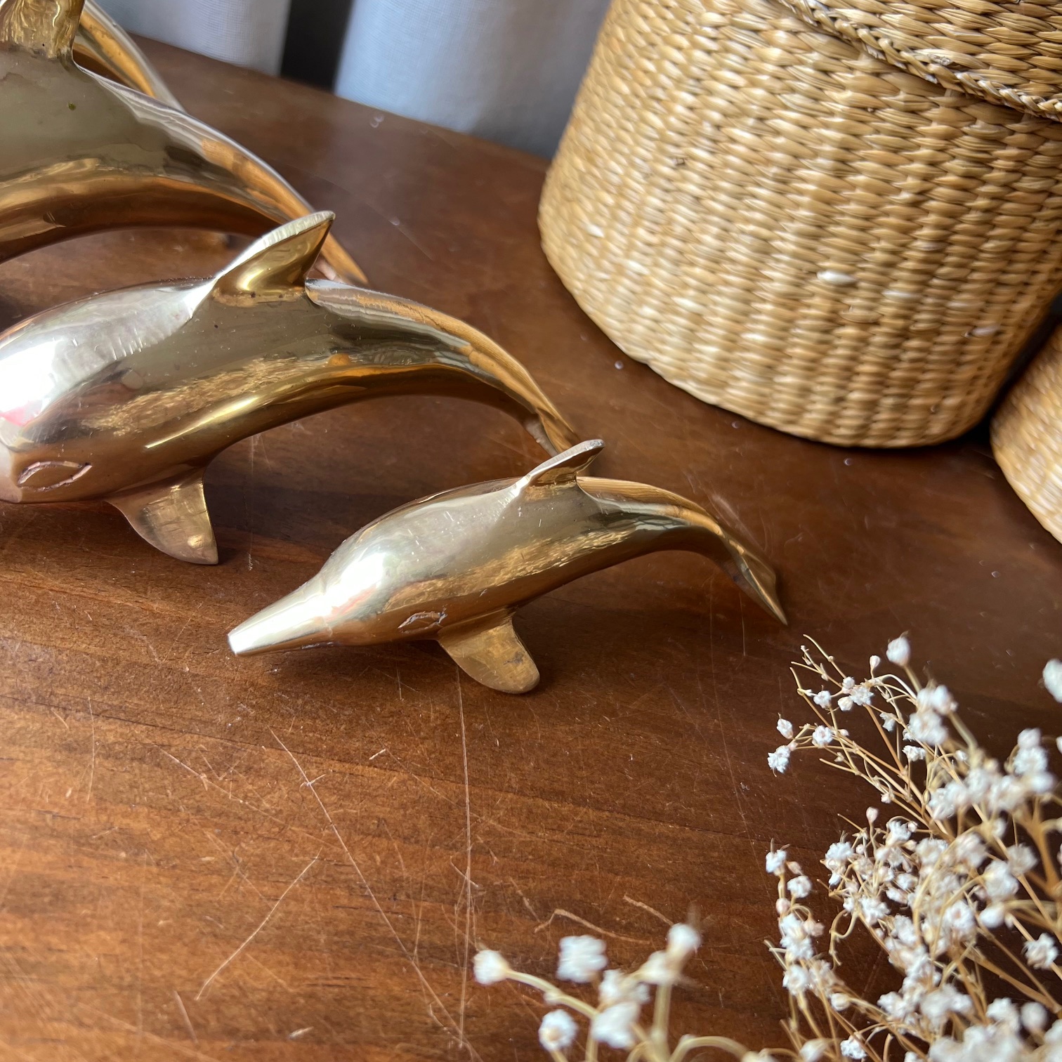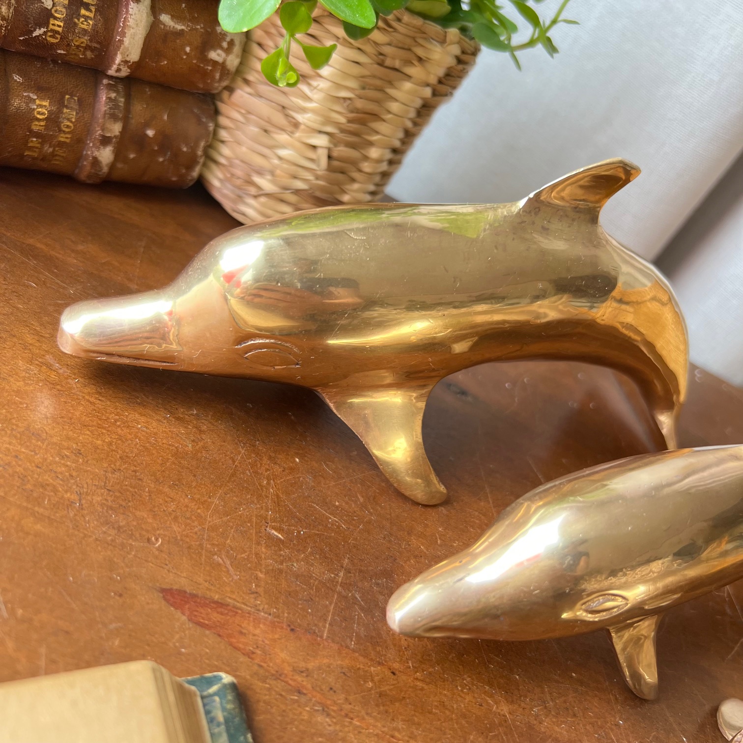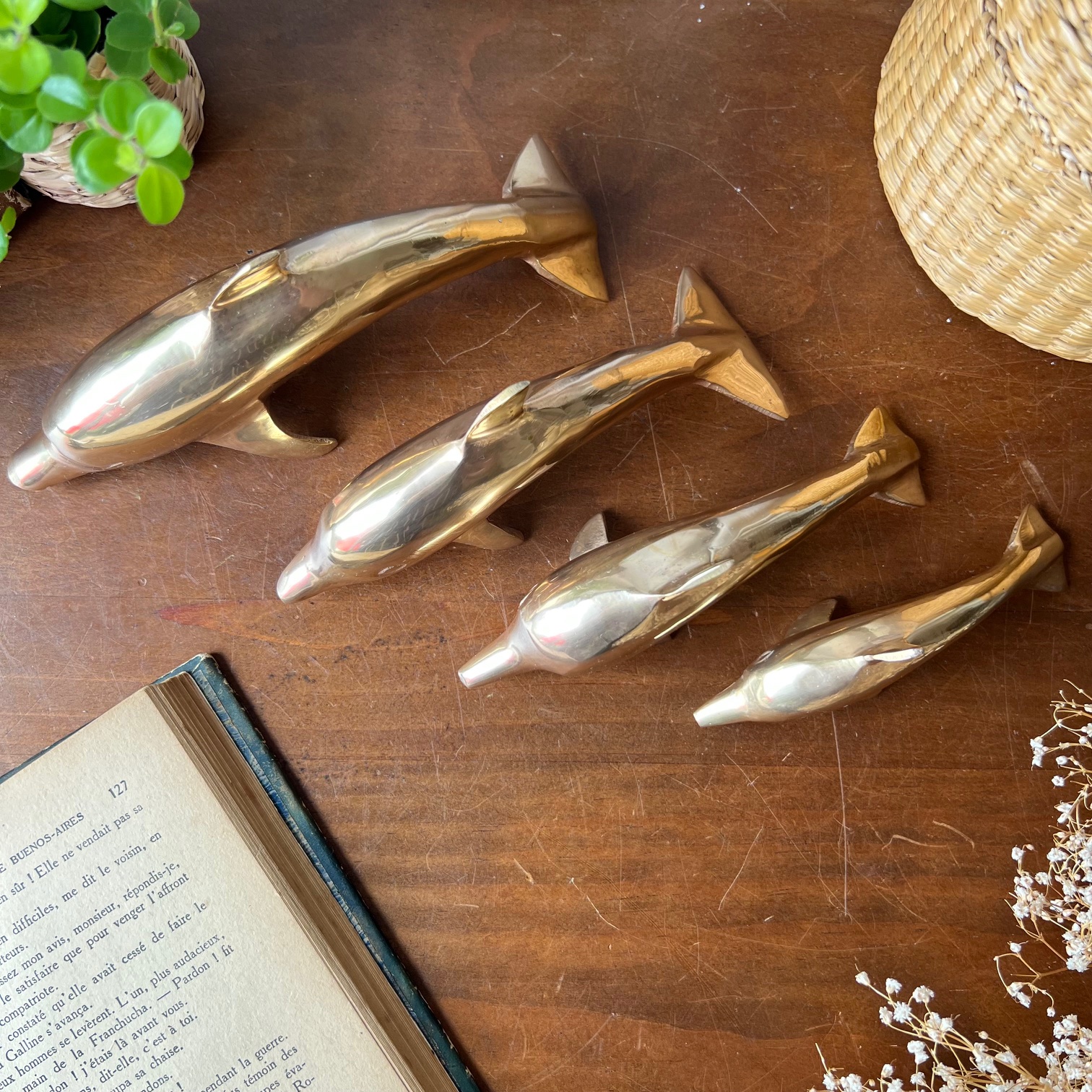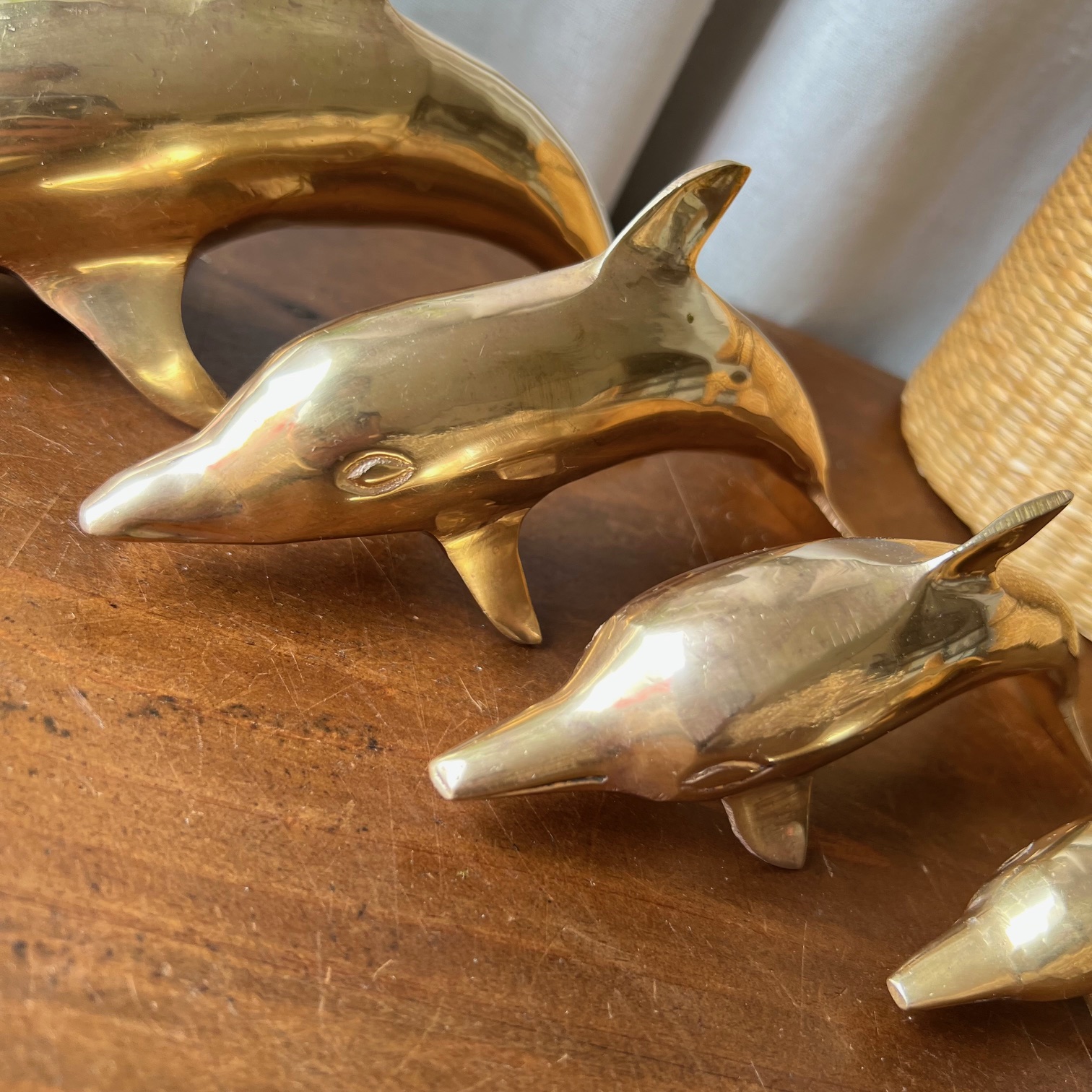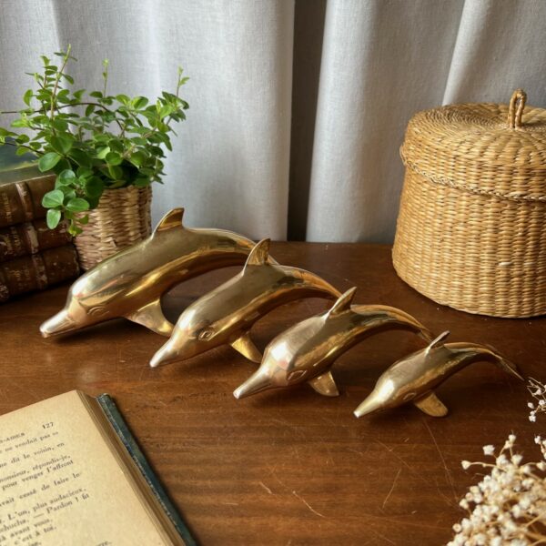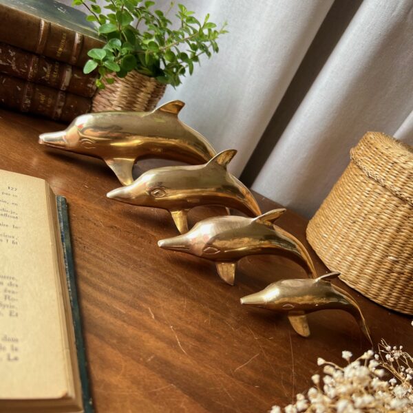Ils nagent à l’unisson, comme pris dans un élan figé : une famille de quatre dauphins en laiton doré, chinée ensemble, inséparable et joyeusement vintage.