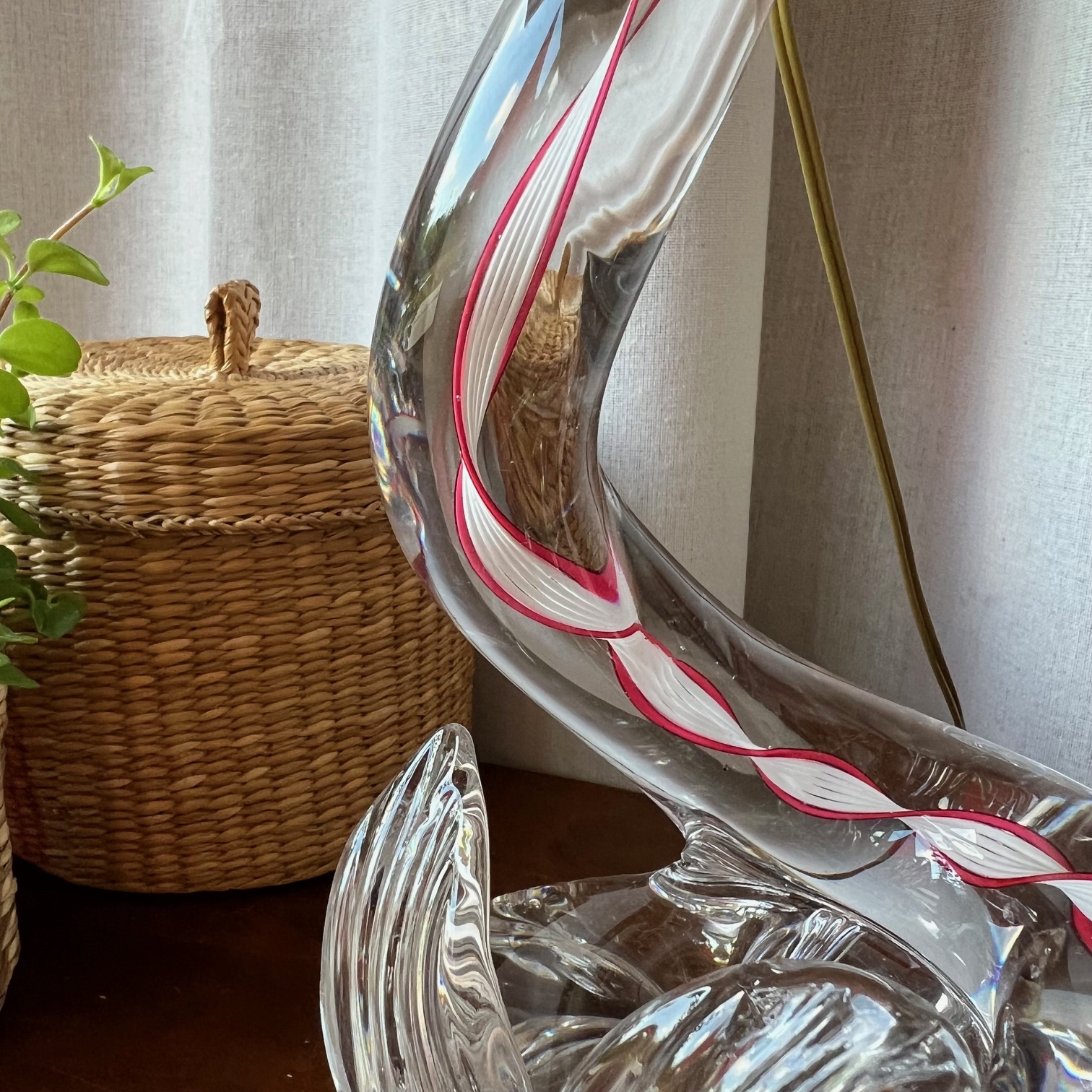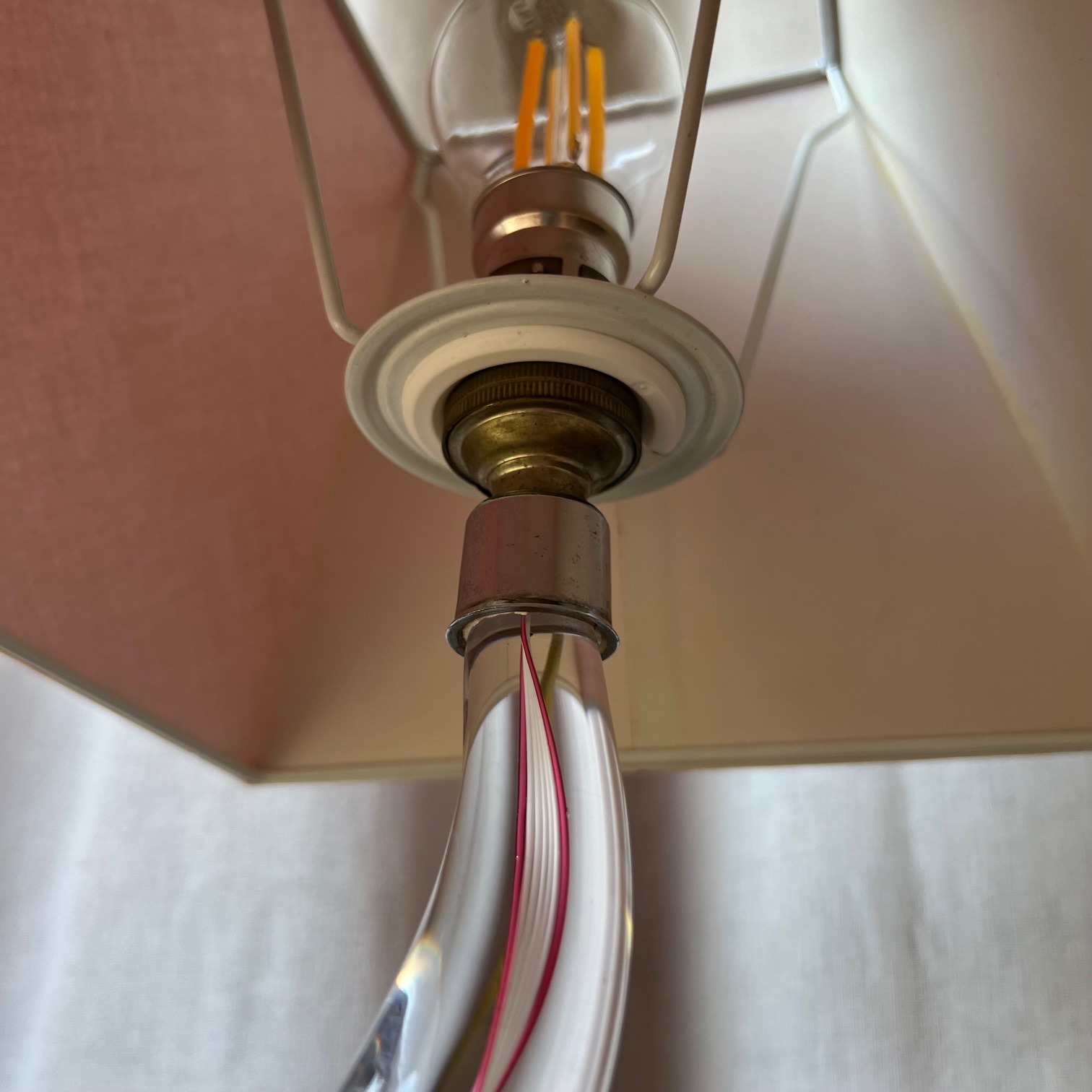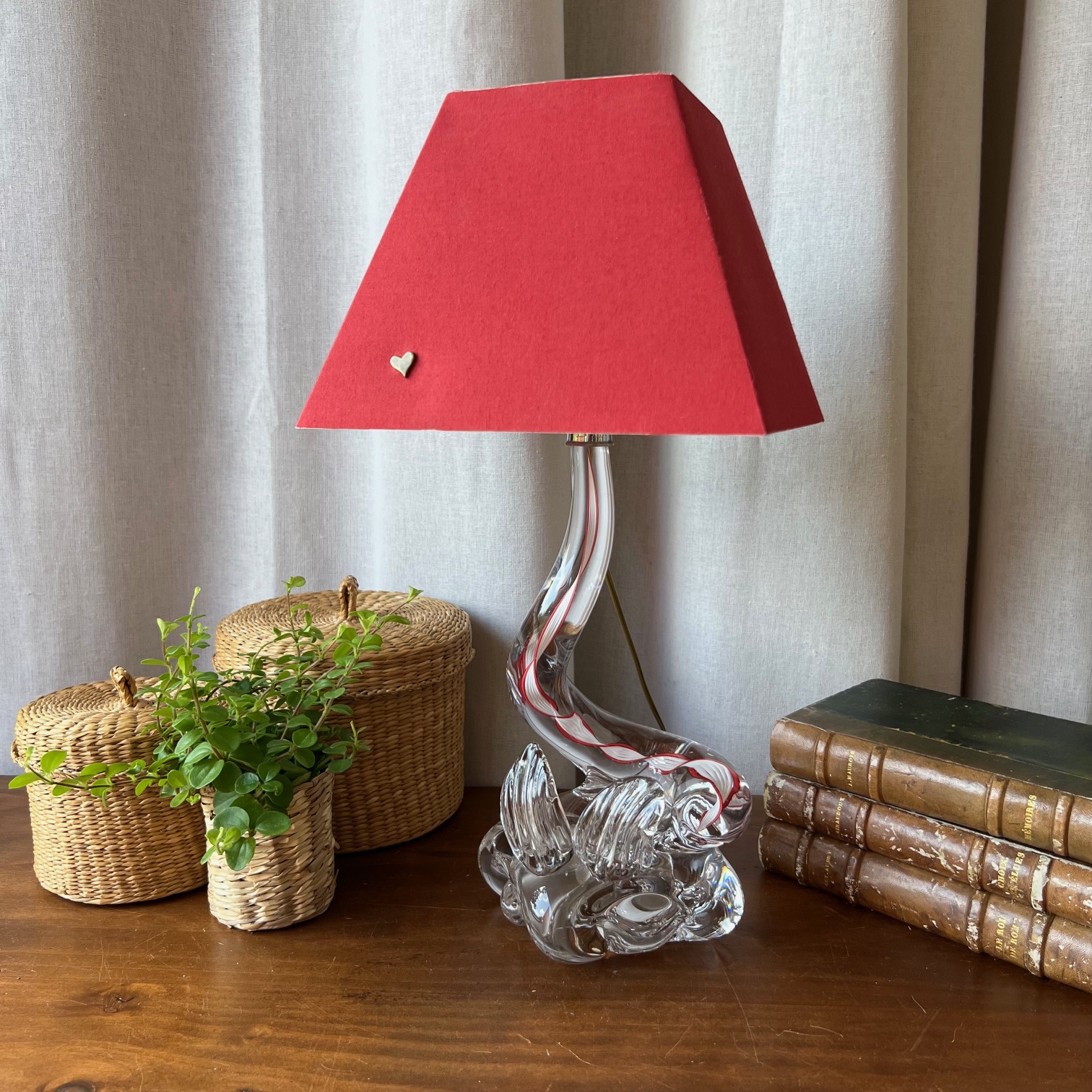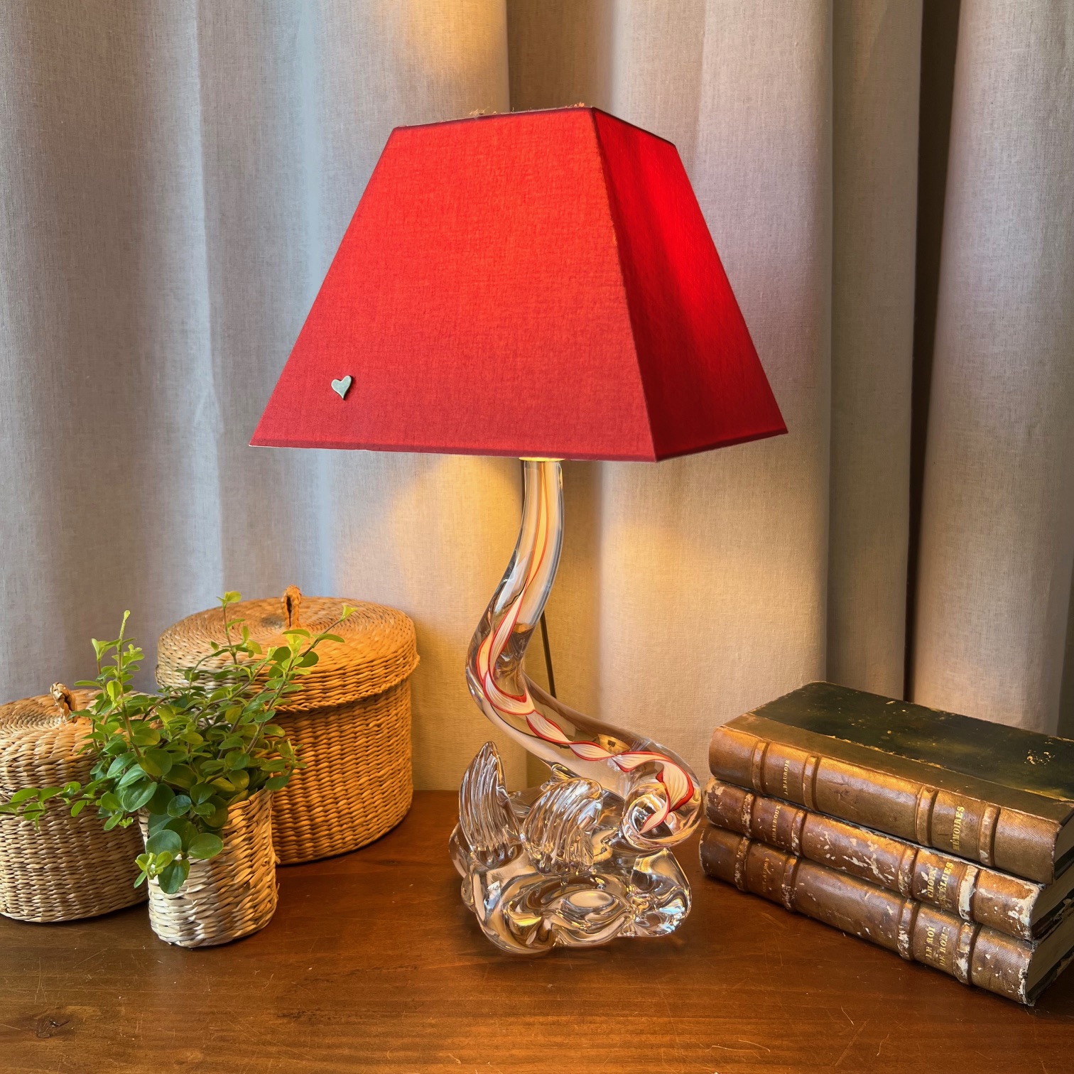 Le cristal clair est habité d’un ruban rouge et blanc, comme une spirale figée dans le temps, discrète mais joyeuse. Toute l’électricité a été soigneusement révisée pour permettre une utilisation quotidienne en toute sécurité (cordon et prise changés, ampoule neuve offerte).