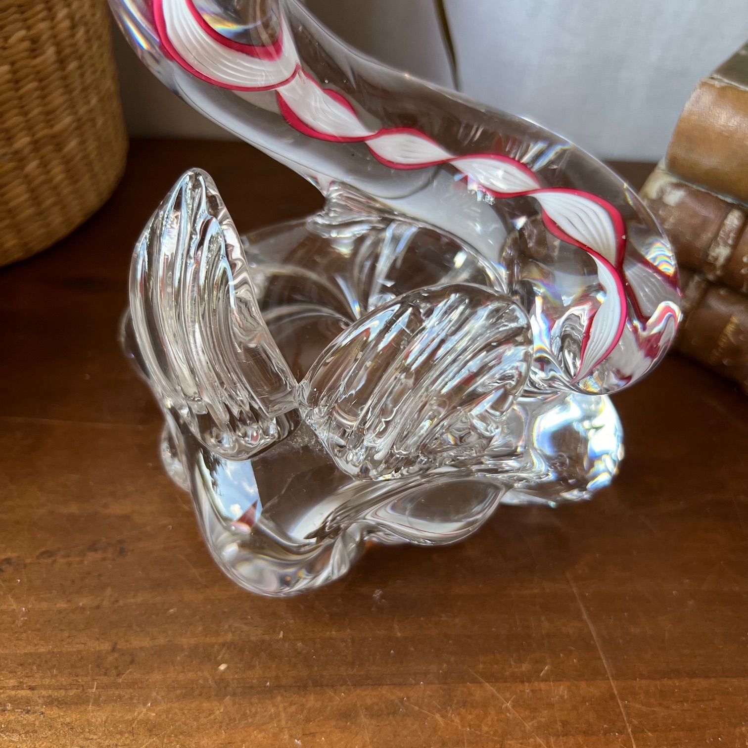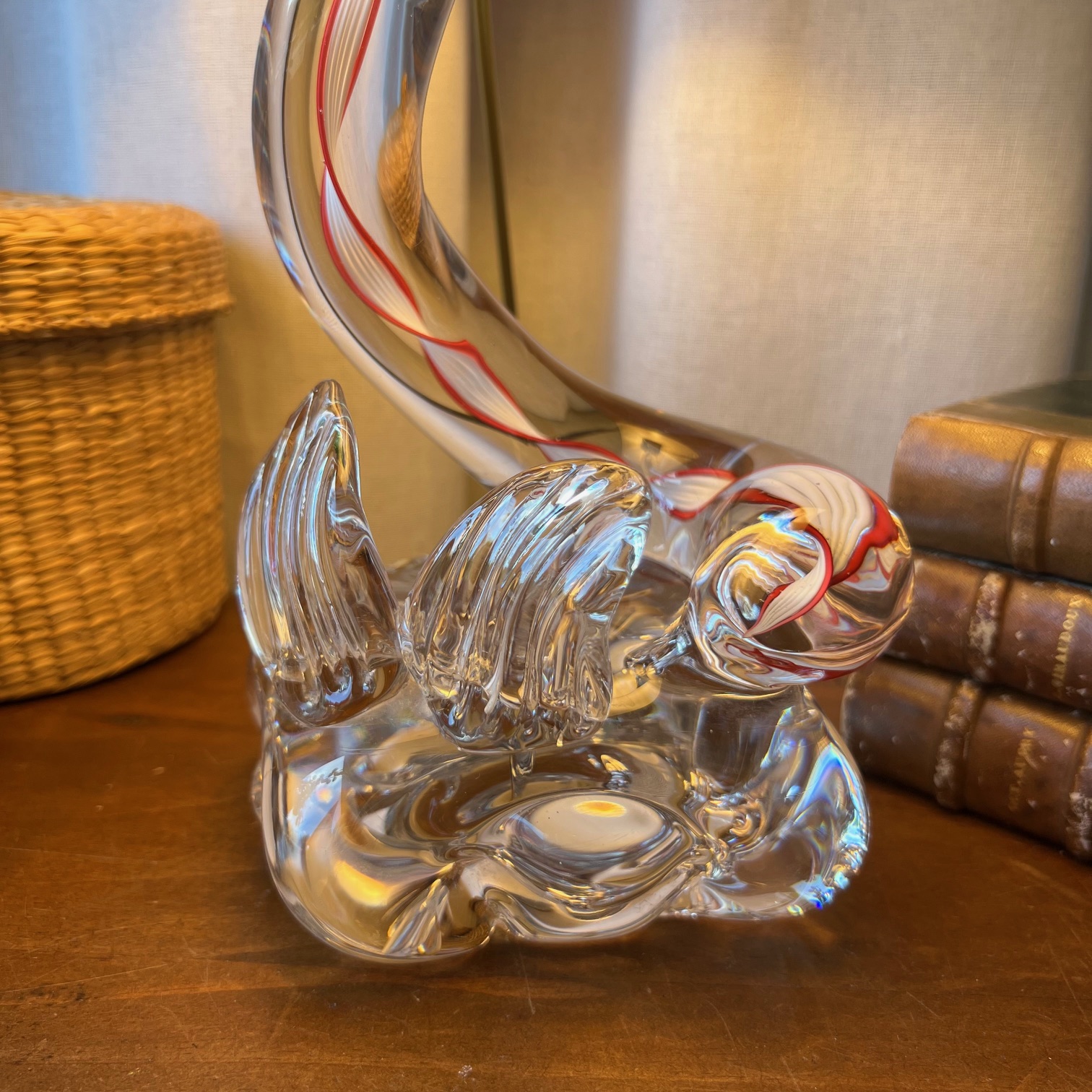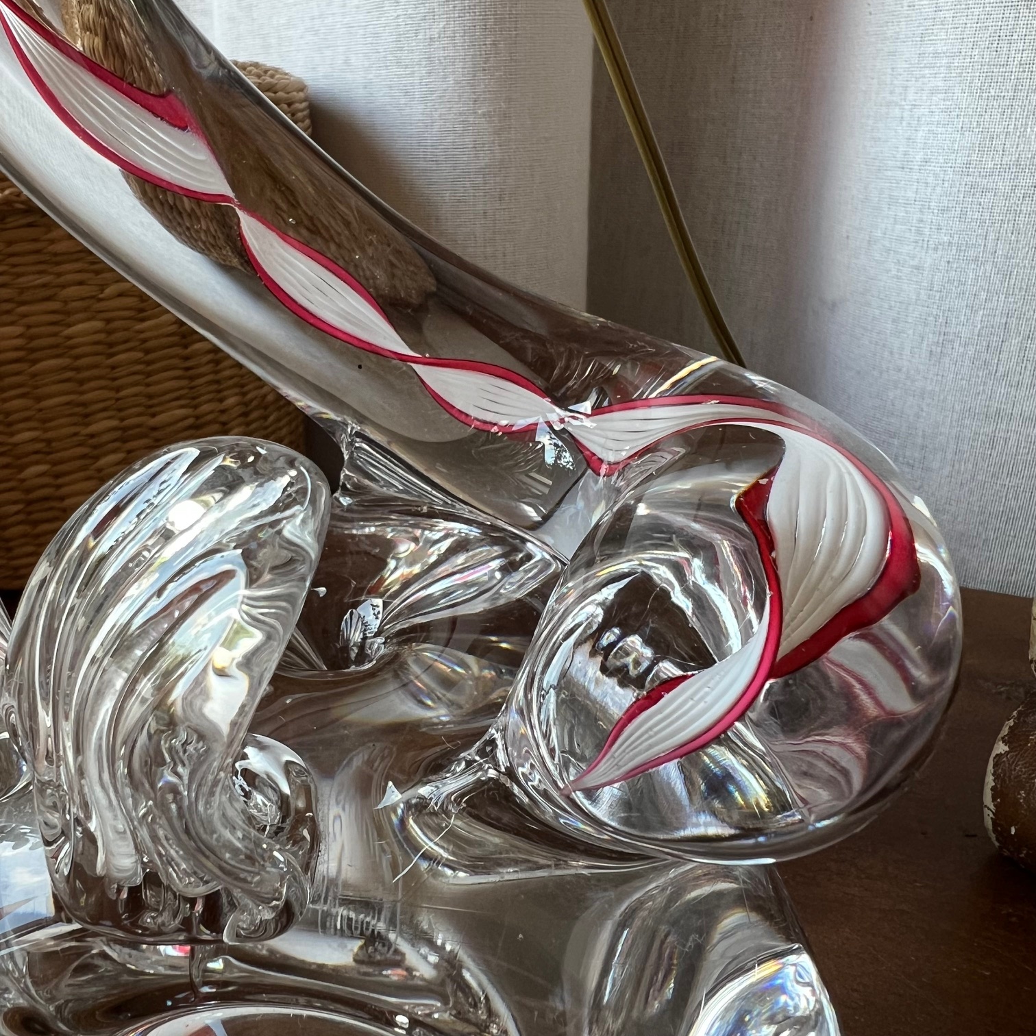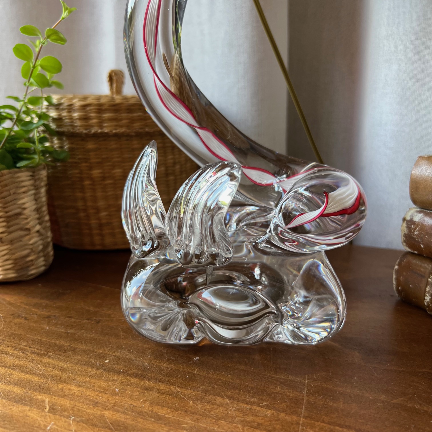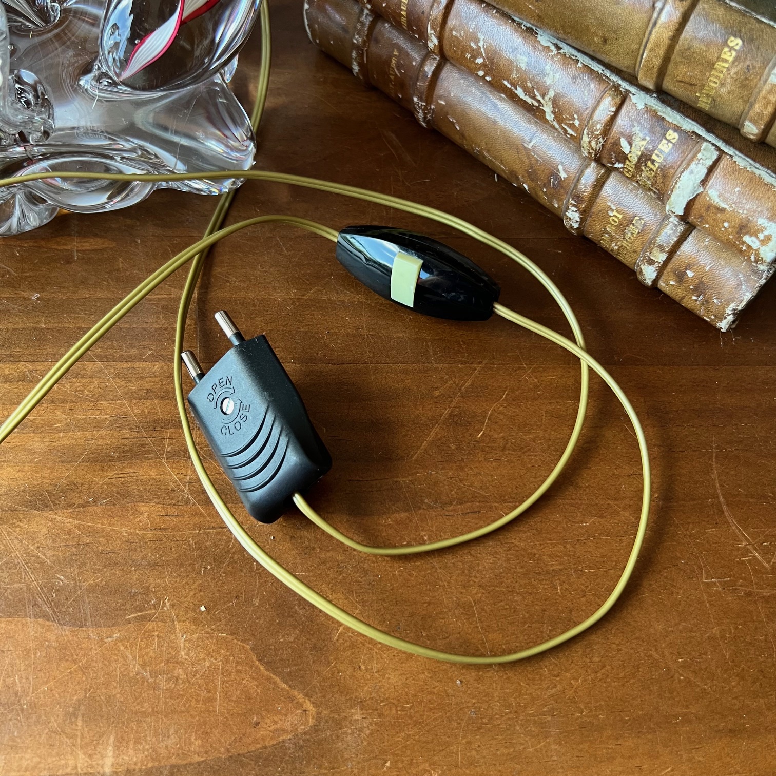 Le cristal clair est habité d’un ruban rouge et blanc, comme une spirale figée dans le temps, discrète mais joyeuse. Toute l’électricité a été soigneusement révisée pour permettre une utilisation quotidienne en toute sécurité (cordon et prise changés, ampoule neuve offerte).
