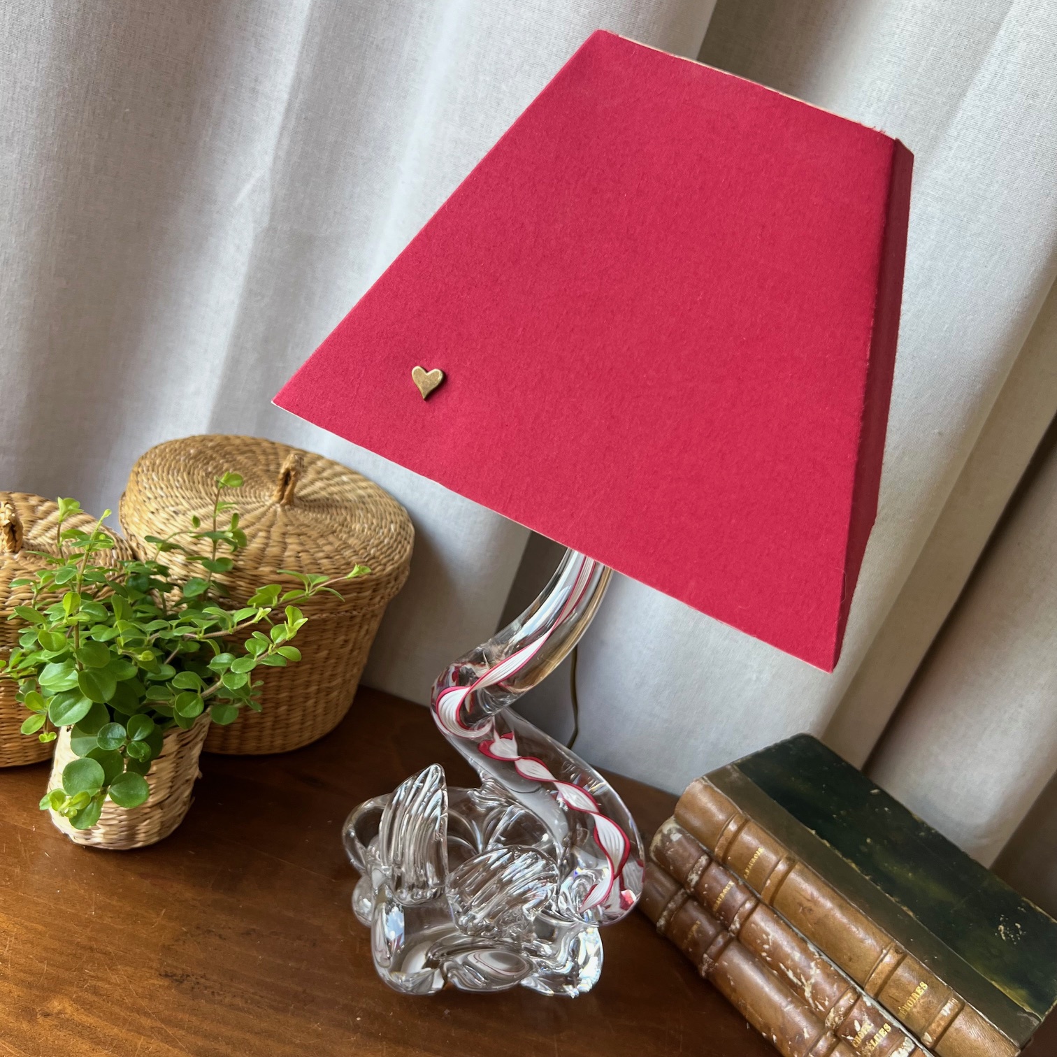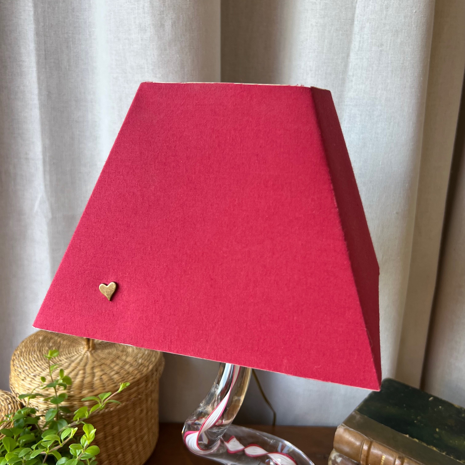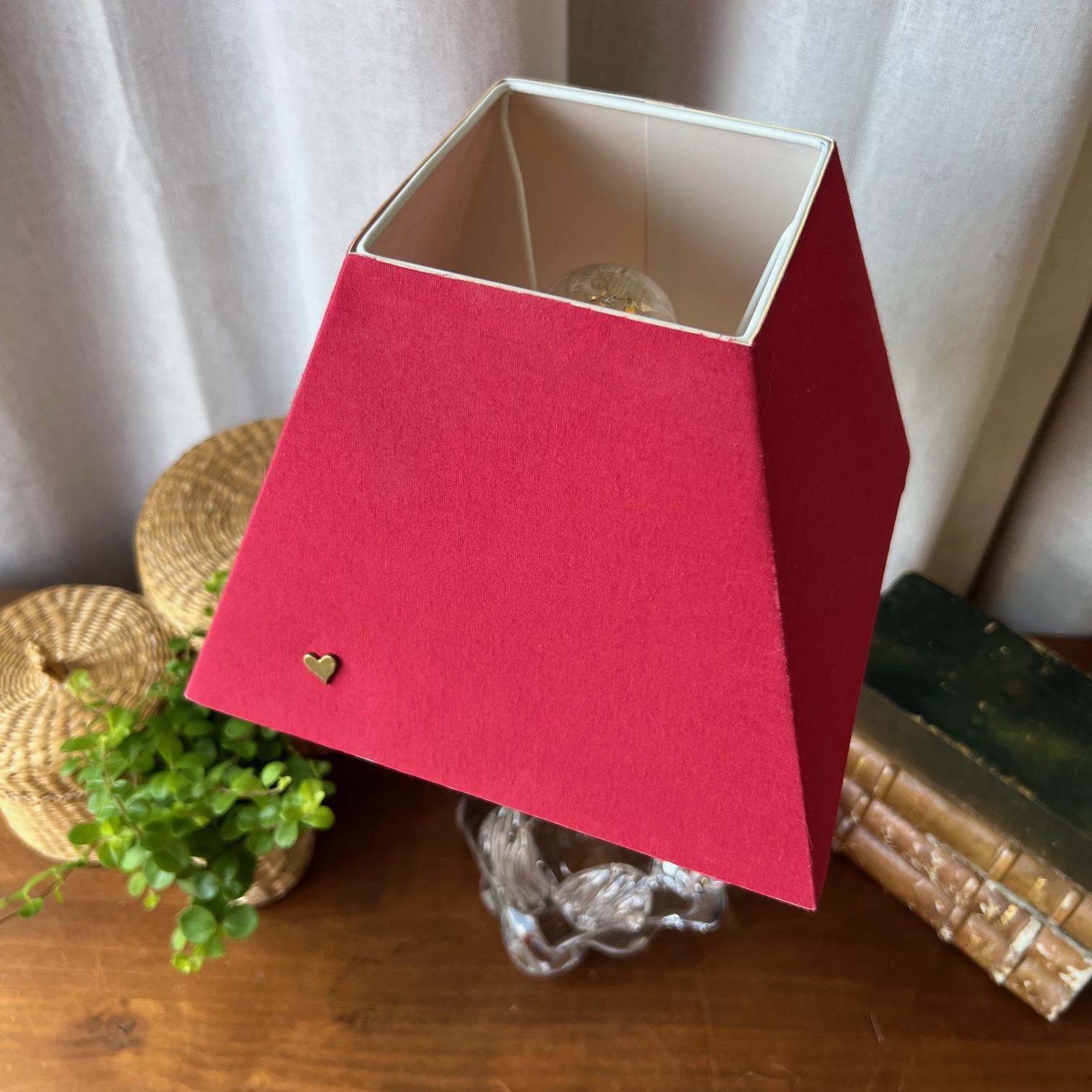Pour chapeauter cet étrange totem lumineux, j’ai choisi un abat-jour pyramidal de seconde main, dans un rouge profond qui joue avec la lumière. Un petit cœur doré s’y est glissé, pour masquer une imperfection devenue signature.