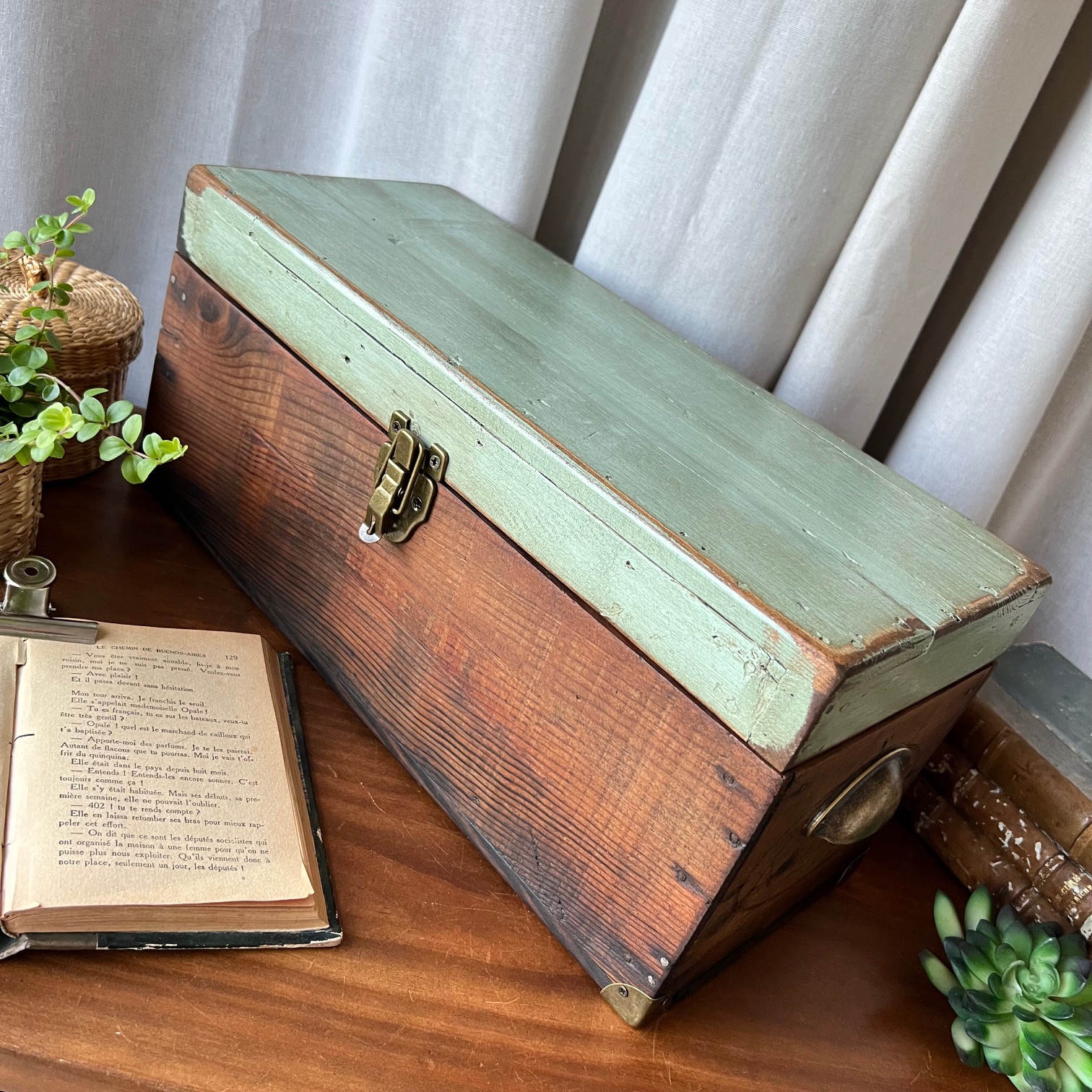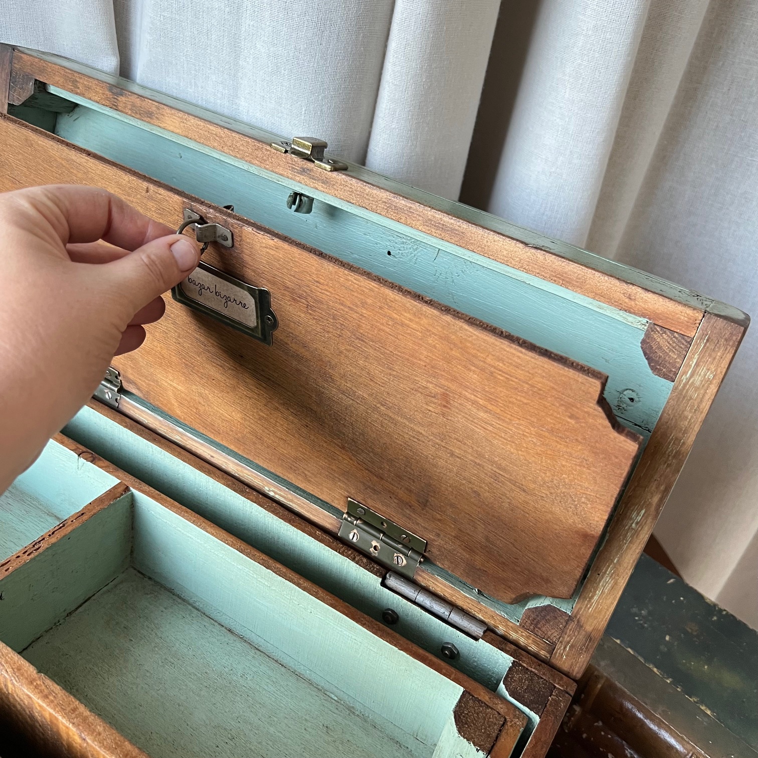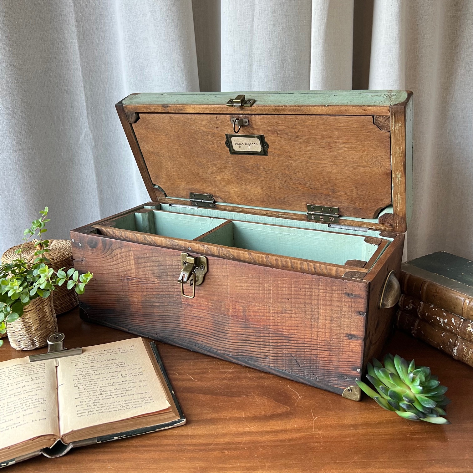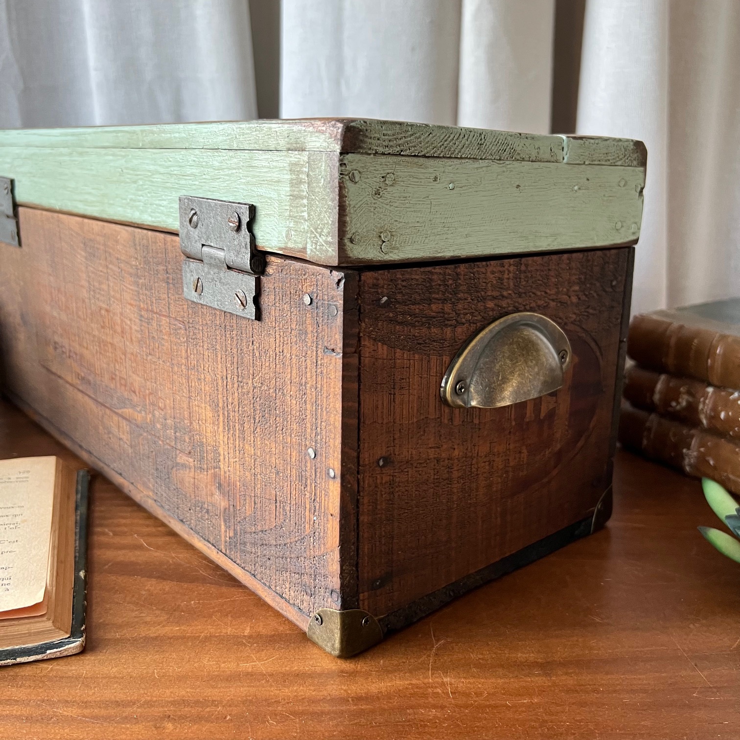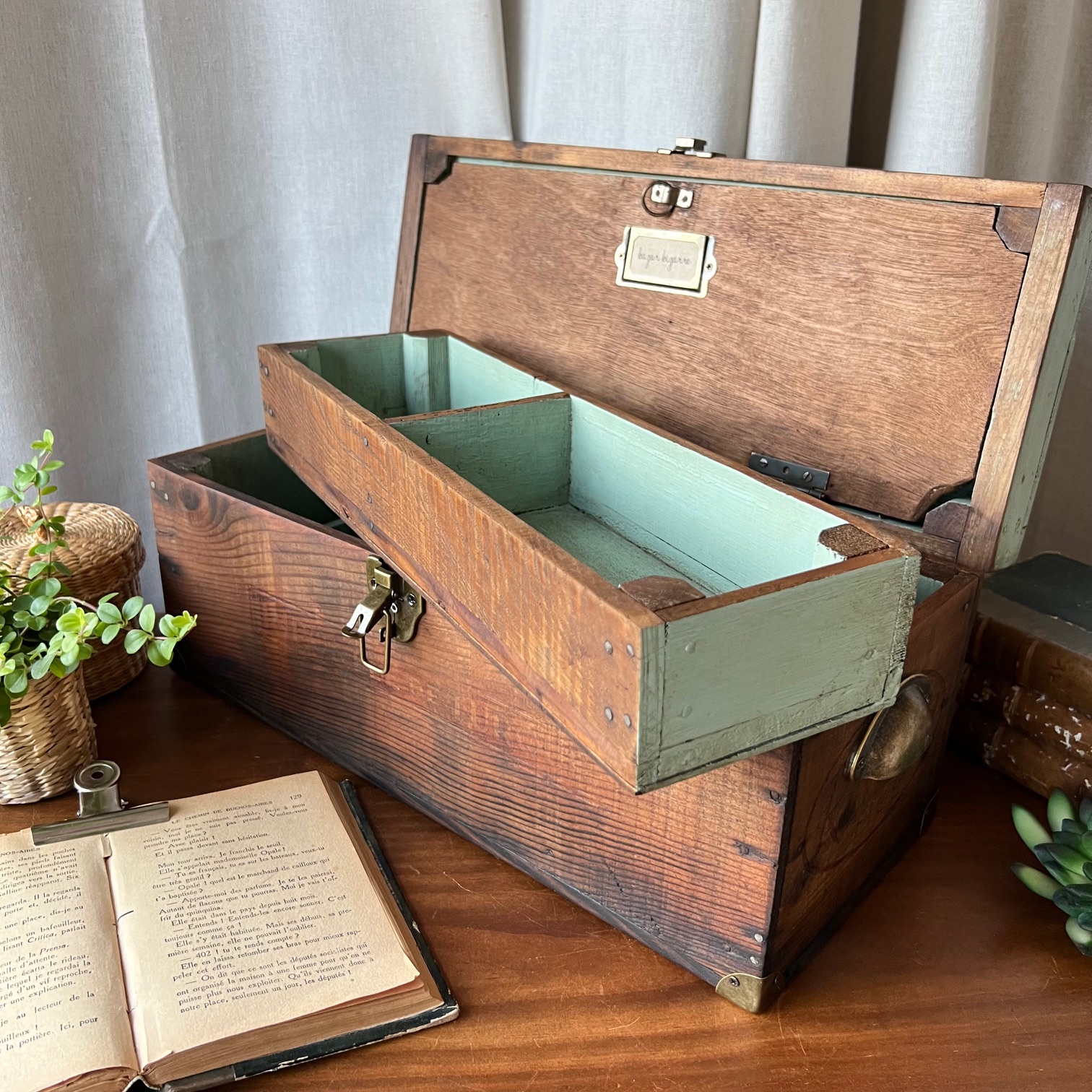 En amour pour cet ancien coffret de cireur fabriqué artisanalement ! Du bois patiné, une couleur verte d’origine rehaussée, des compartiments, de jolis détails… Idéal pour y ranger mille et un trésors