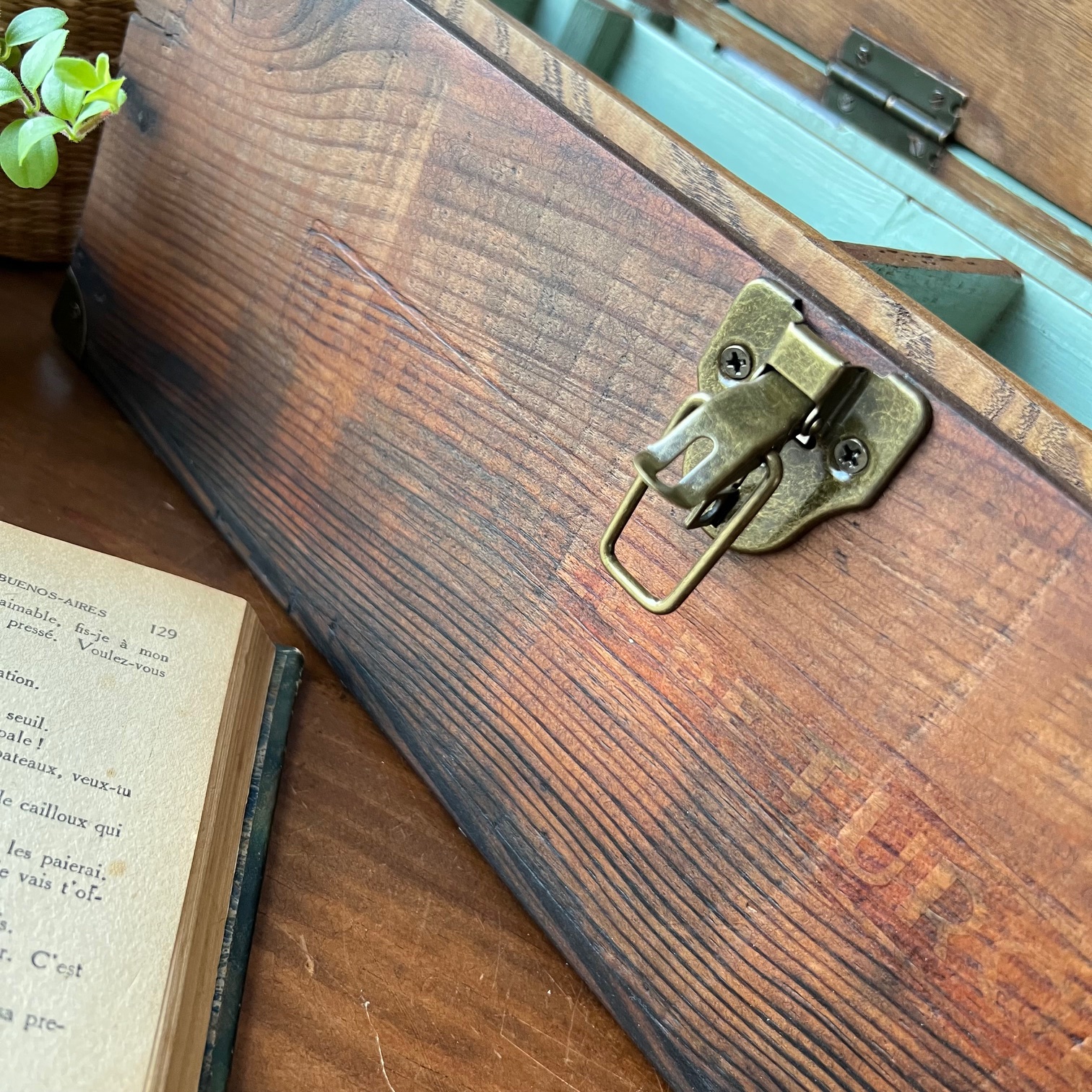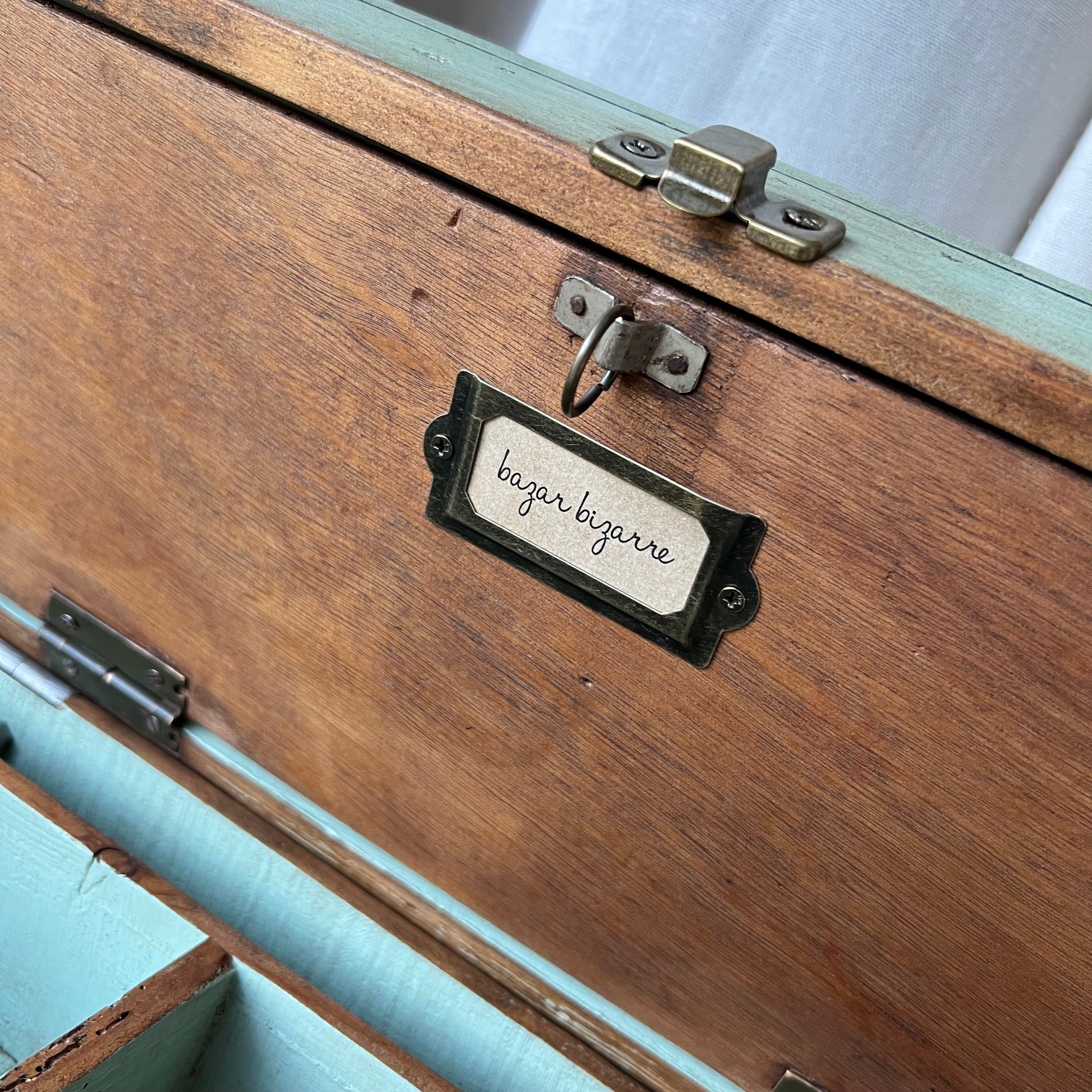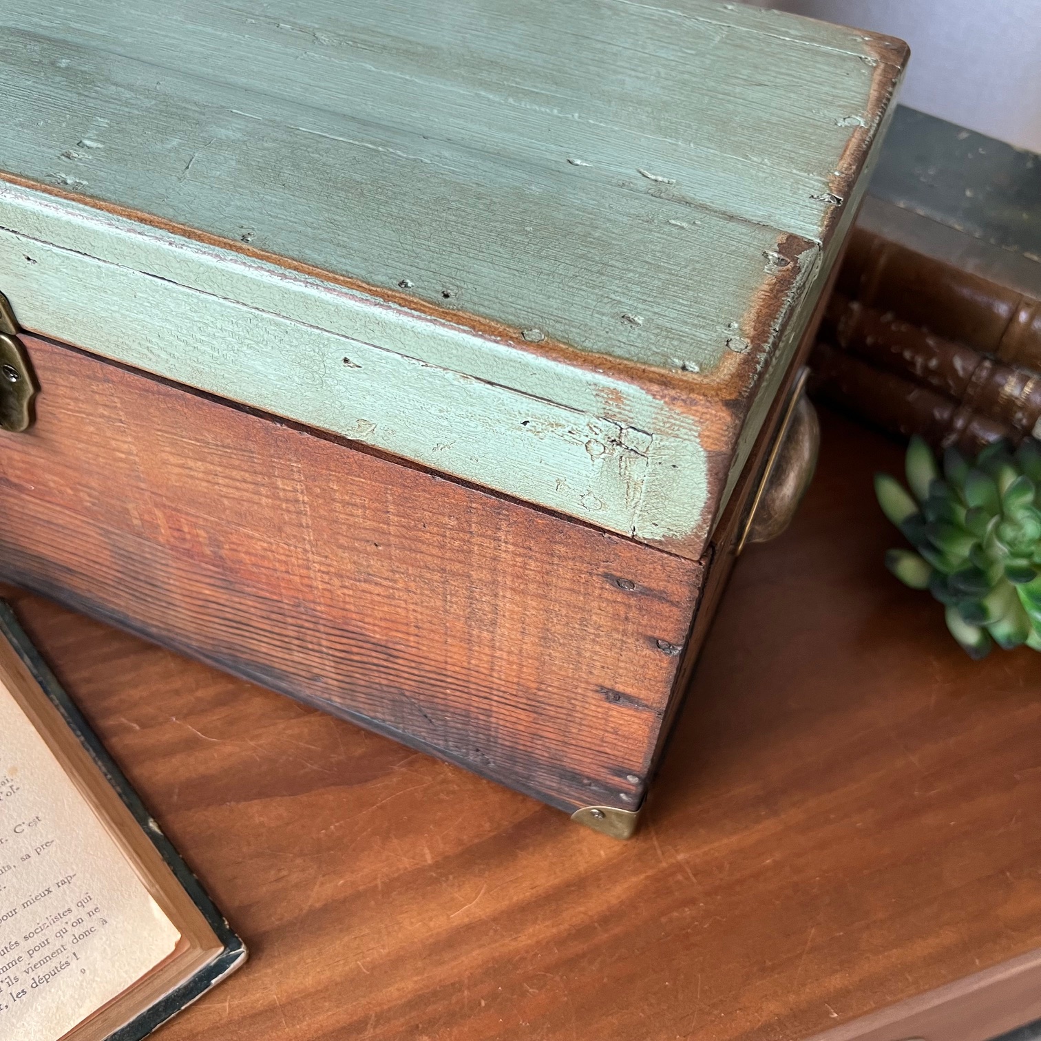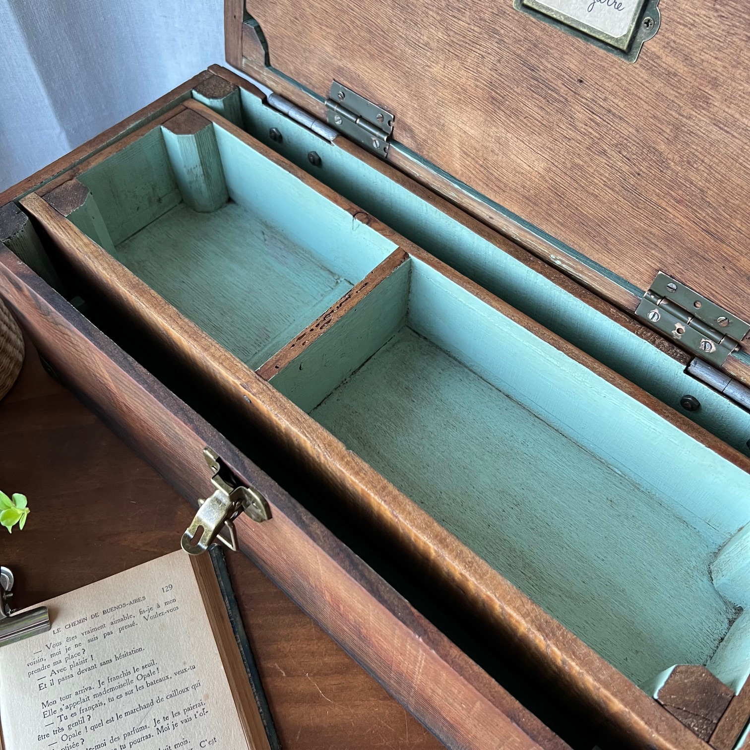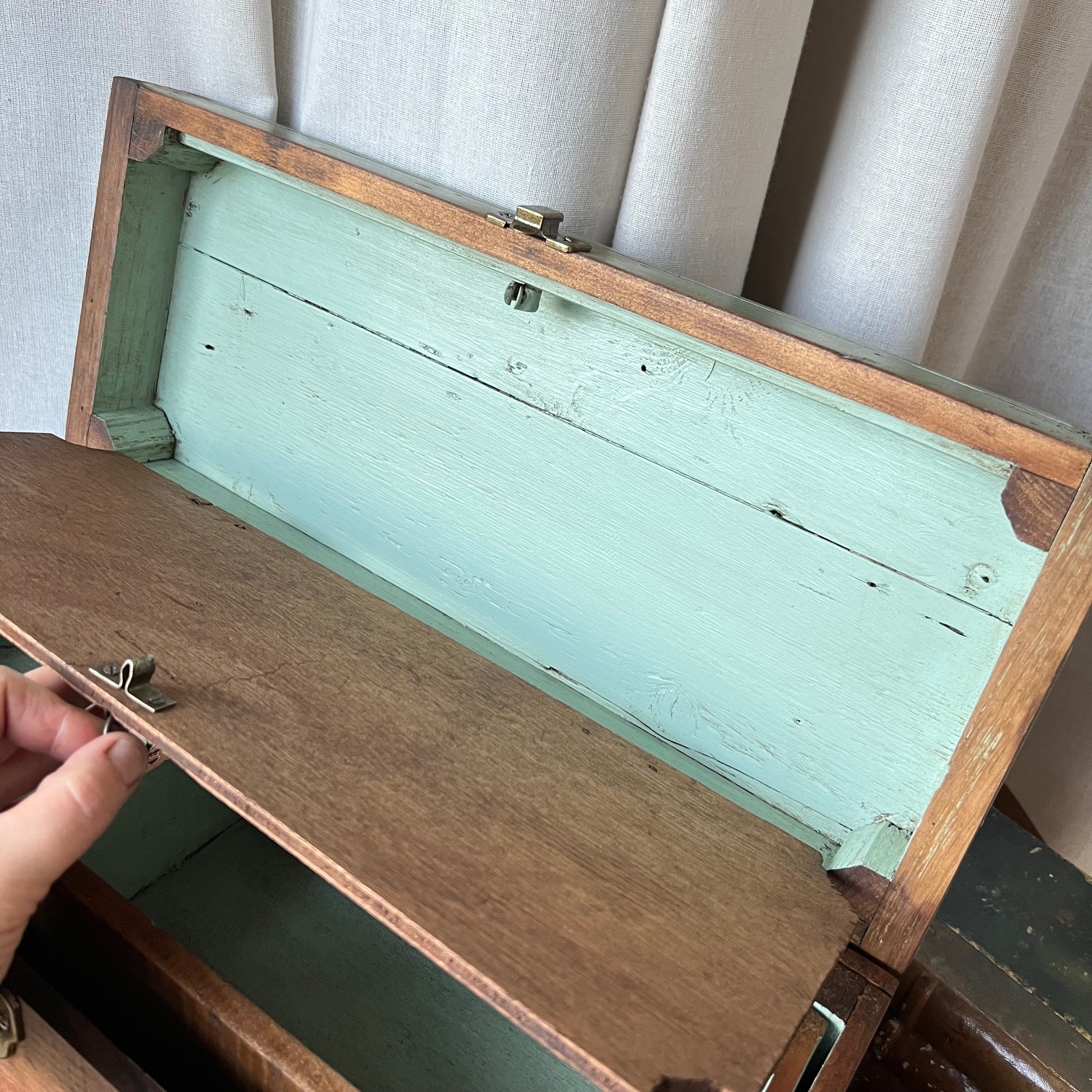 En amour pour cet ancien coffret de cireur fabriqué artisanalement ! Du bois patiné, une couleur verte d’origine rehaussée, des compartiments, de jolis détails… Idéal pour y ranger mille et un trésors