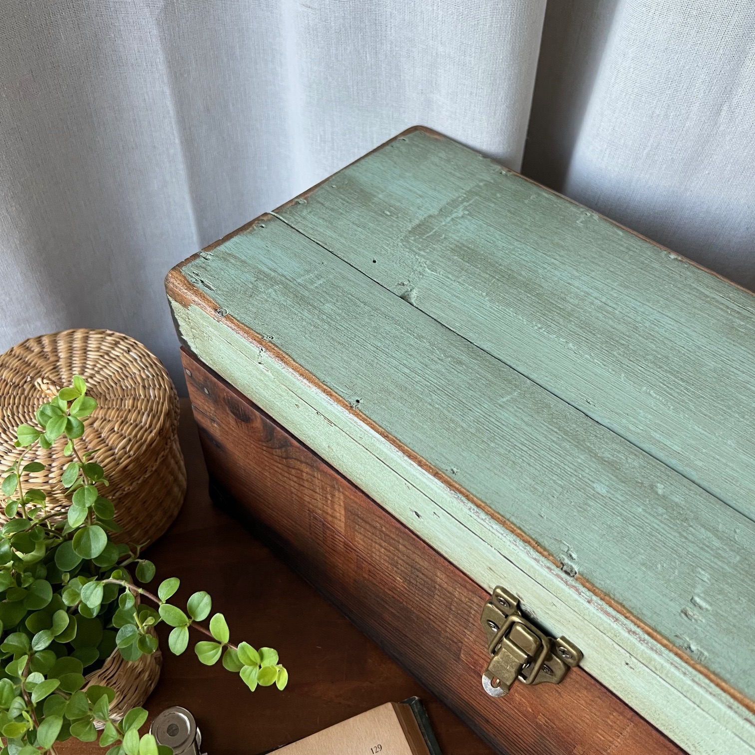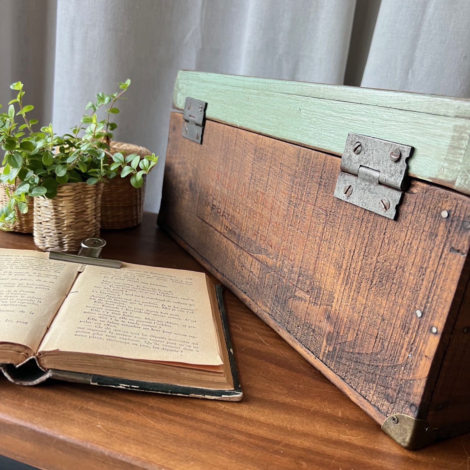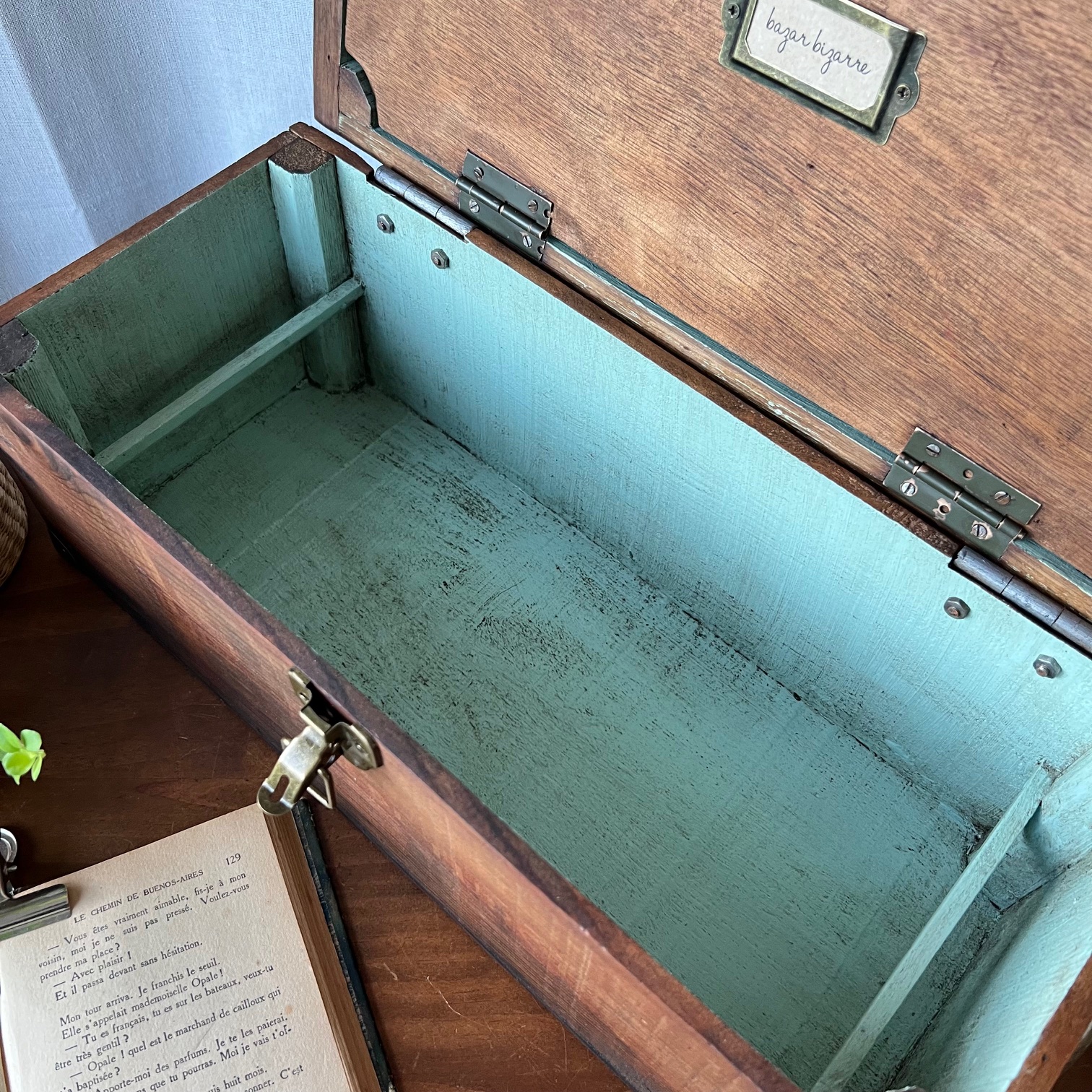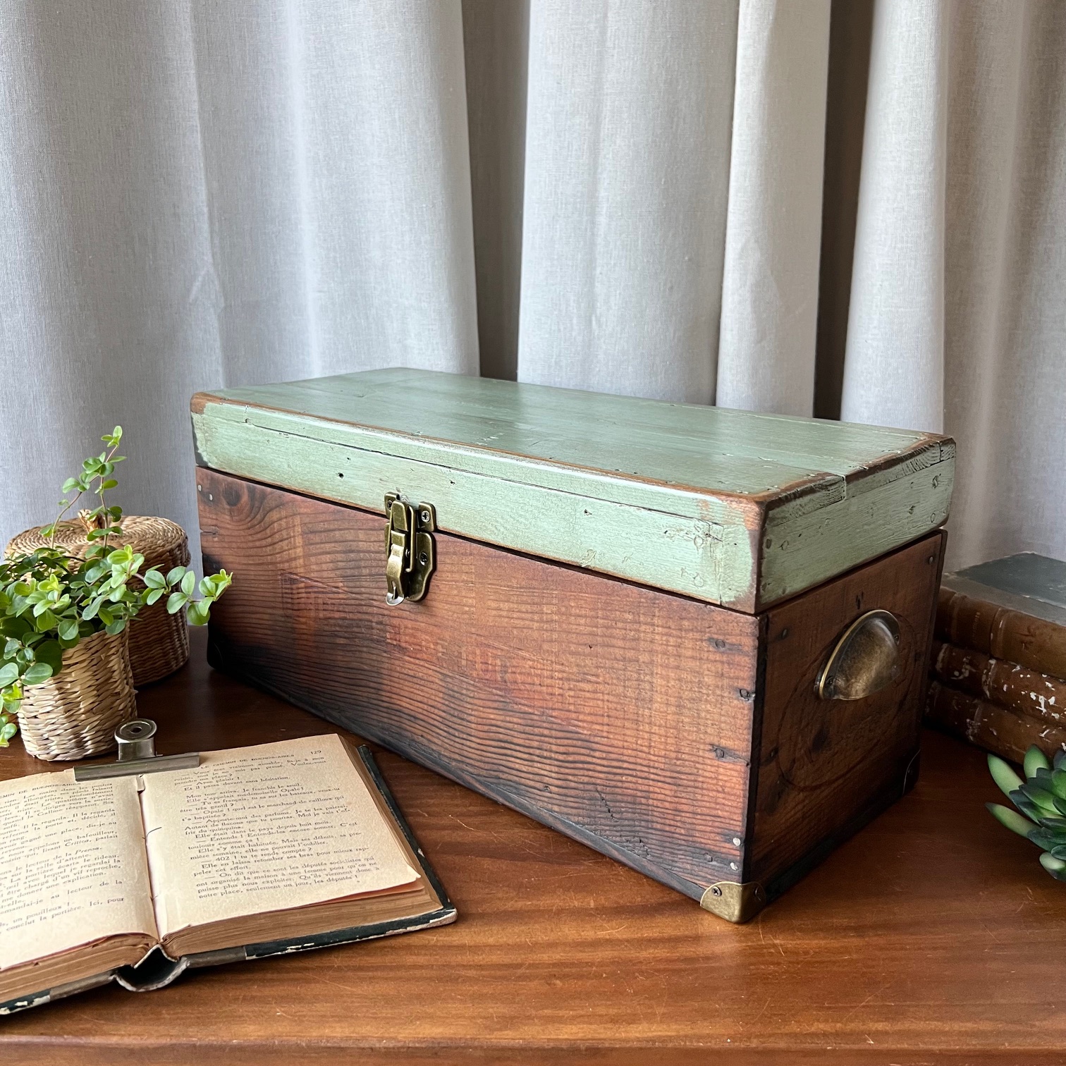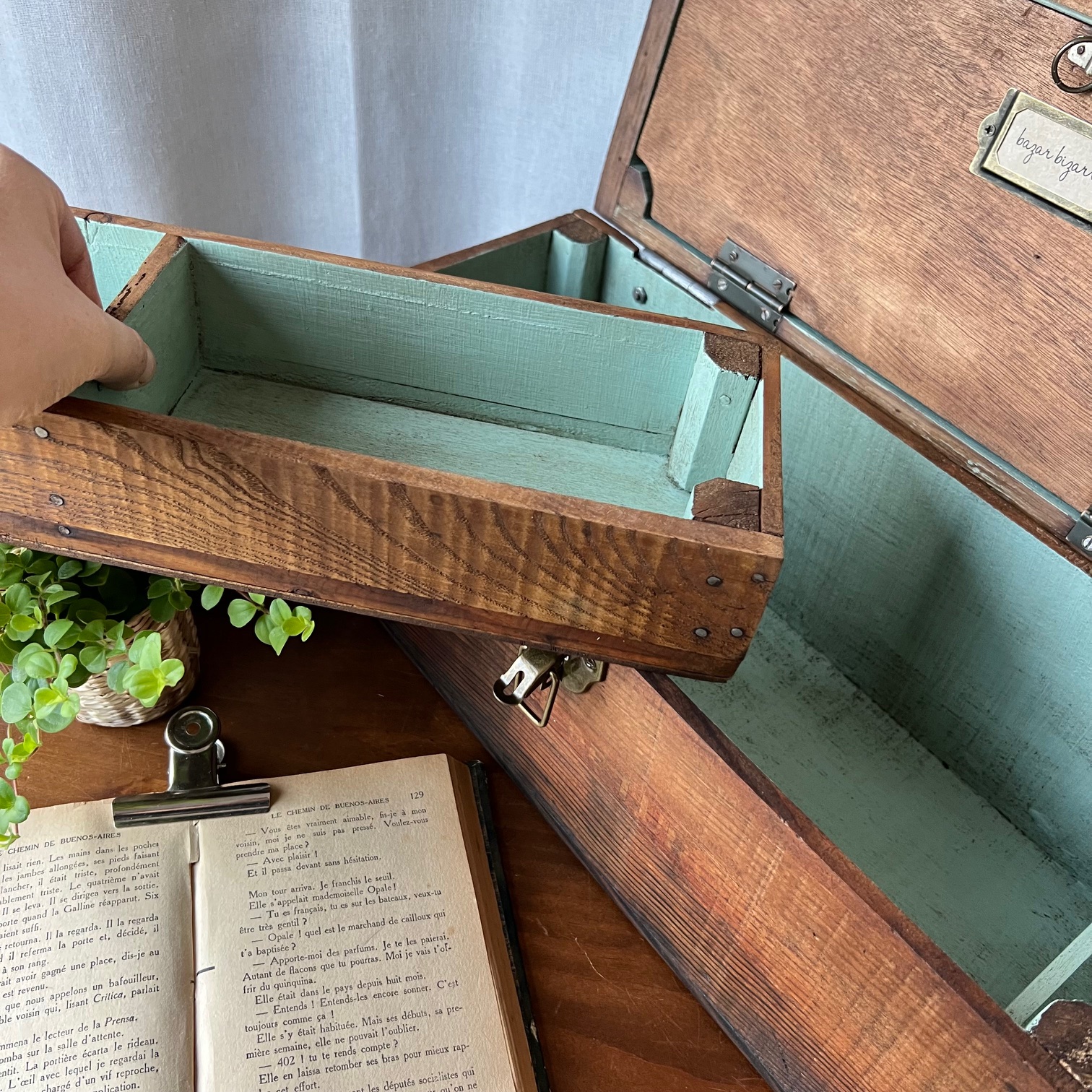 En amour pour cet ancien coffret de cireur fabriqué artisanalement ! Du bois patiné, une couleur verte d’origine rehaussée, des compartiments, de jolis détails… Idéal pour y ranger mille et un trésors