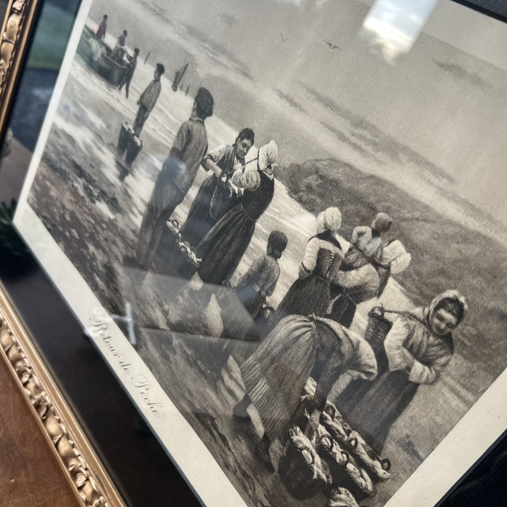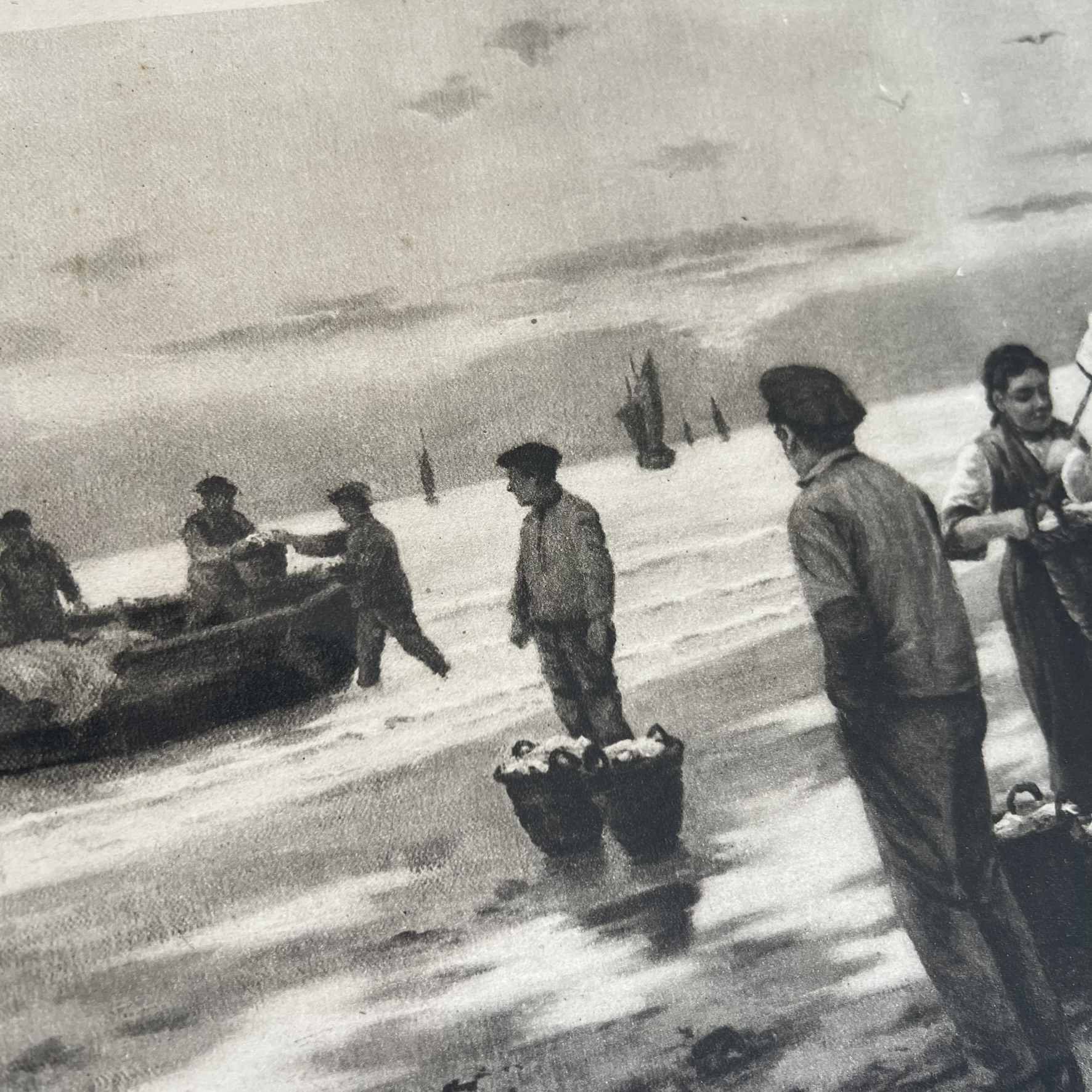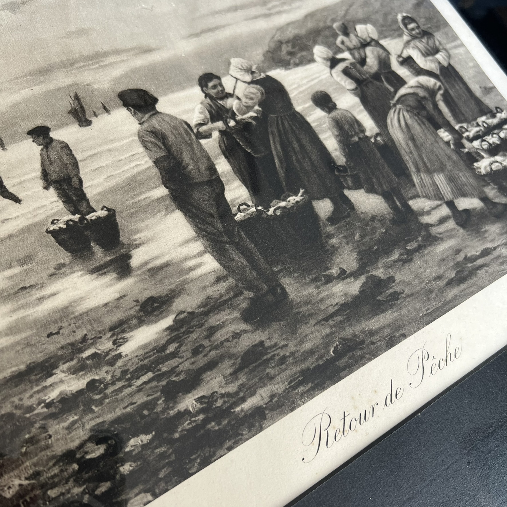 Cette lithographie intitulée « Retour de pêche » nous plonge dans une scène de vie maritime typique de la fin du XIXᵉ siècle. Sur le rivage, hommes, femmes et enfants se retrouvent autour des paniers pleins, dans ce moment précis où la mer rend ce qu’elle a donné — ni plus, ni moins. Rien de spectaculaire, mais tout est là : l’effort, la solidarité, la transmission.