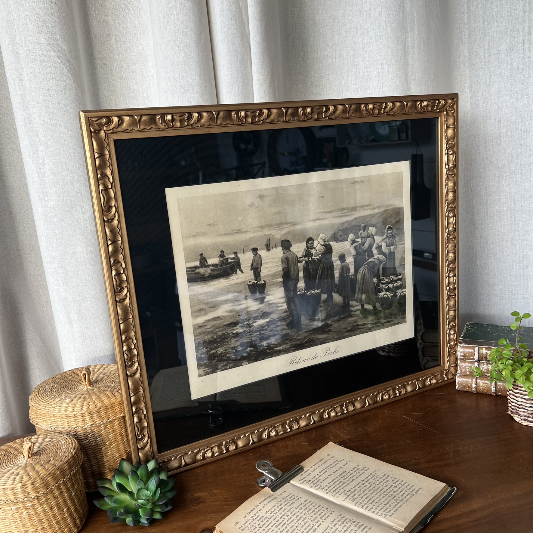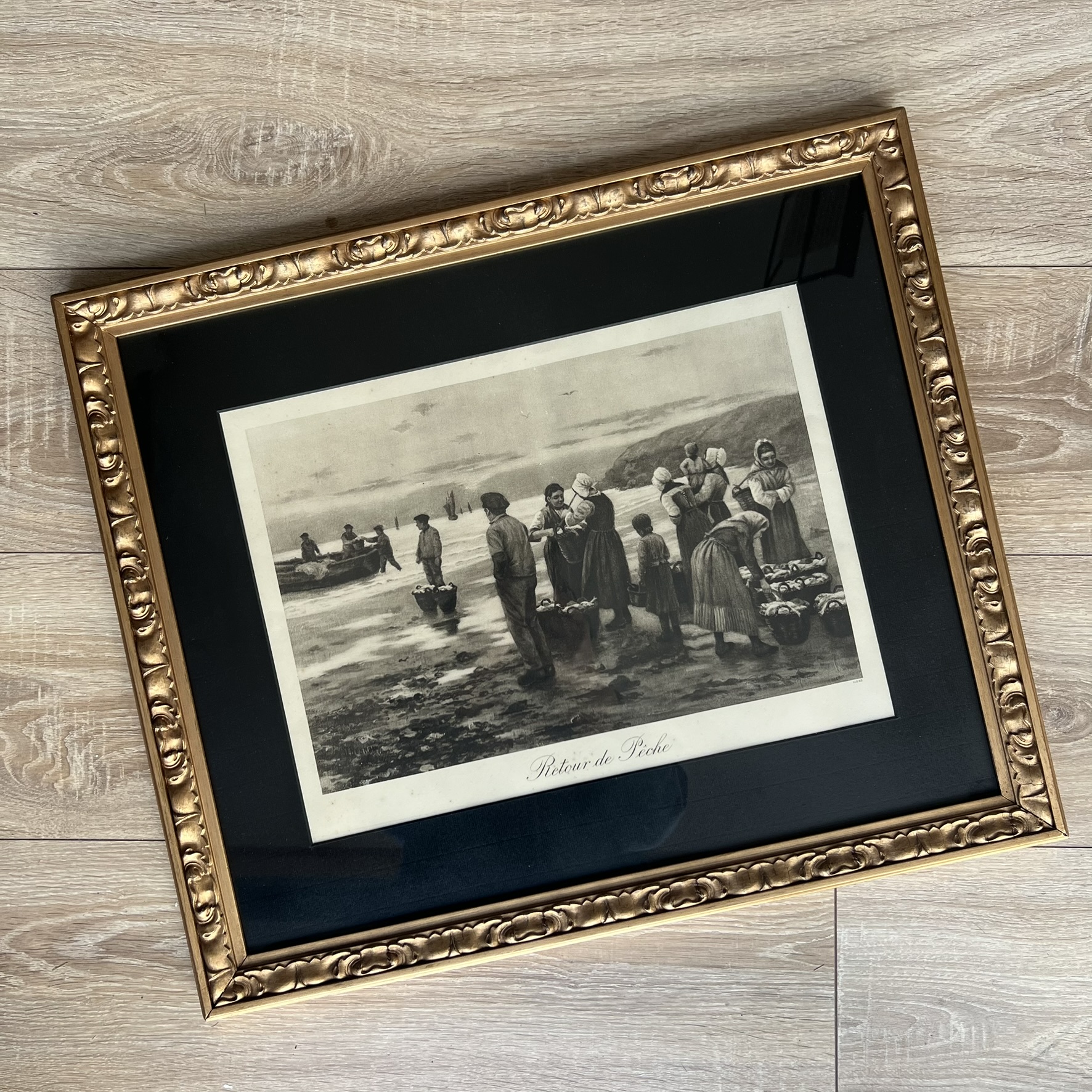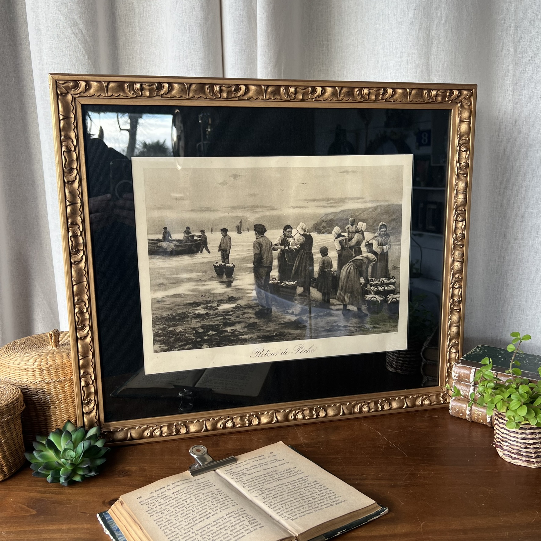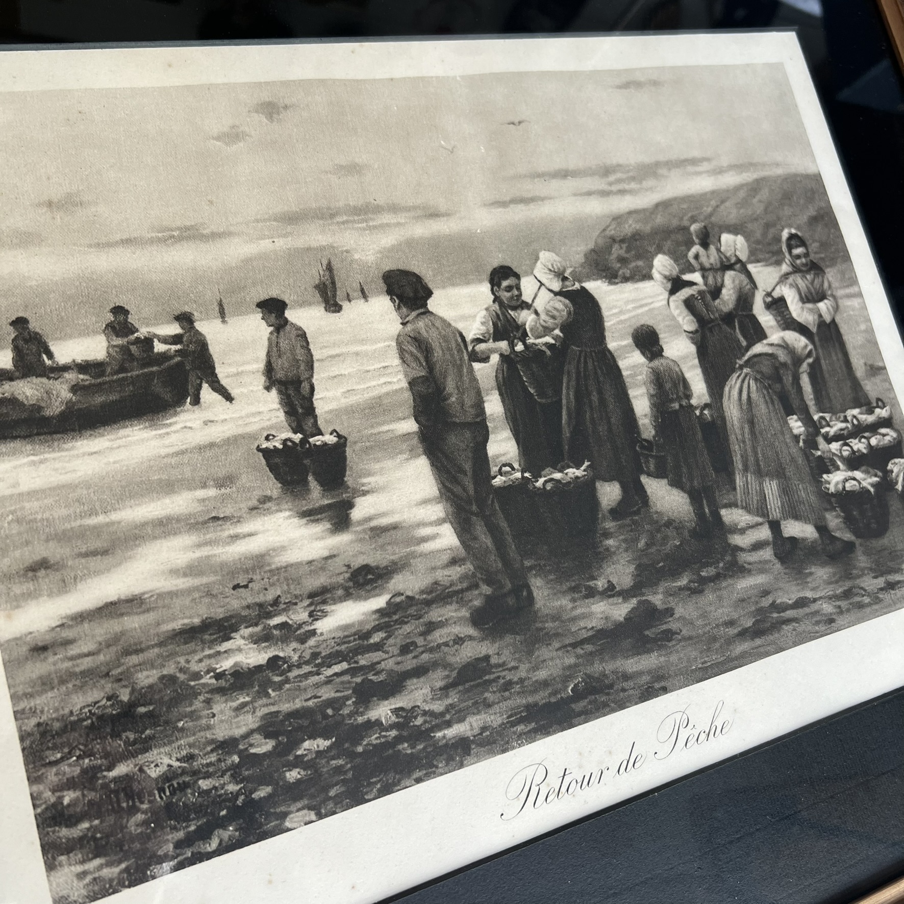 Cette lithographie intitulée « Retour de pêche » nous plonge dans une scène de vie maritime typique de la fin du XIXᵉ siècle. Sur le rivage, hommes, femmes et enfants se retrouvent autour des paniers pleins, dans ce moment précis où la mer rend ce qu’elle a donné — ni plus, ni moins. Rien de spectaculaire, mais tout est là : l’effort, la solidarité, la transmission.