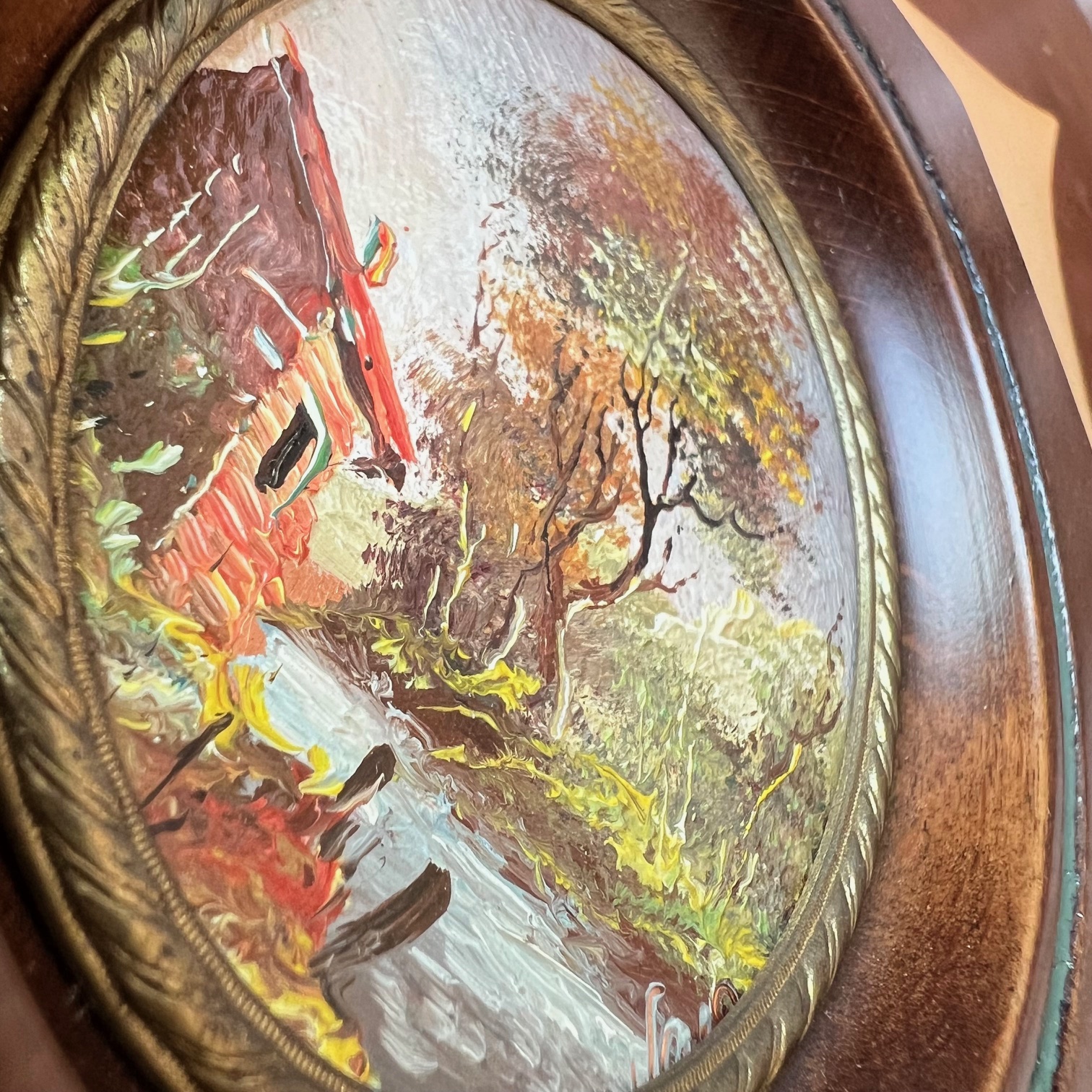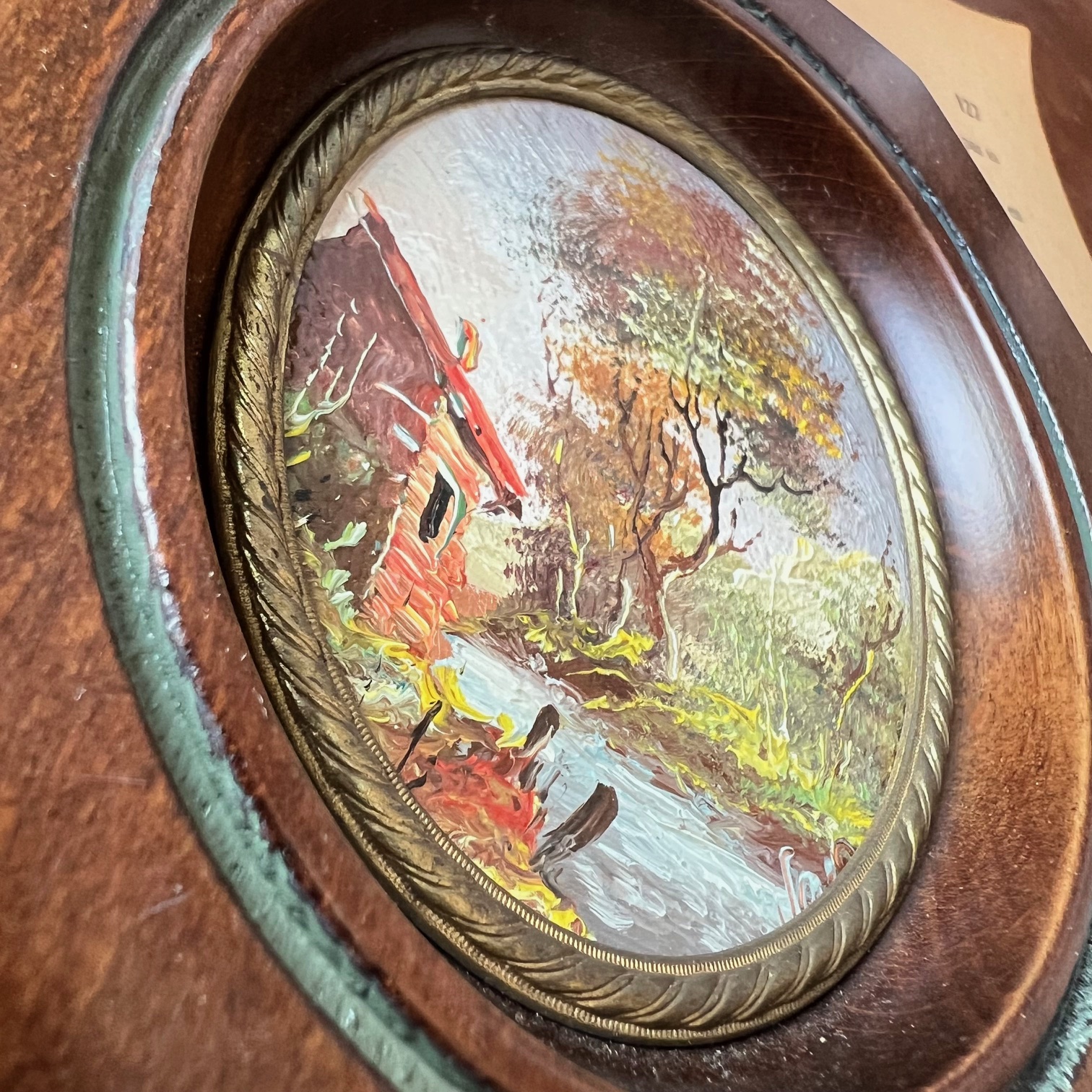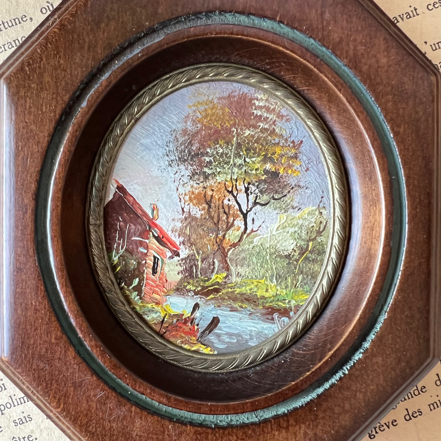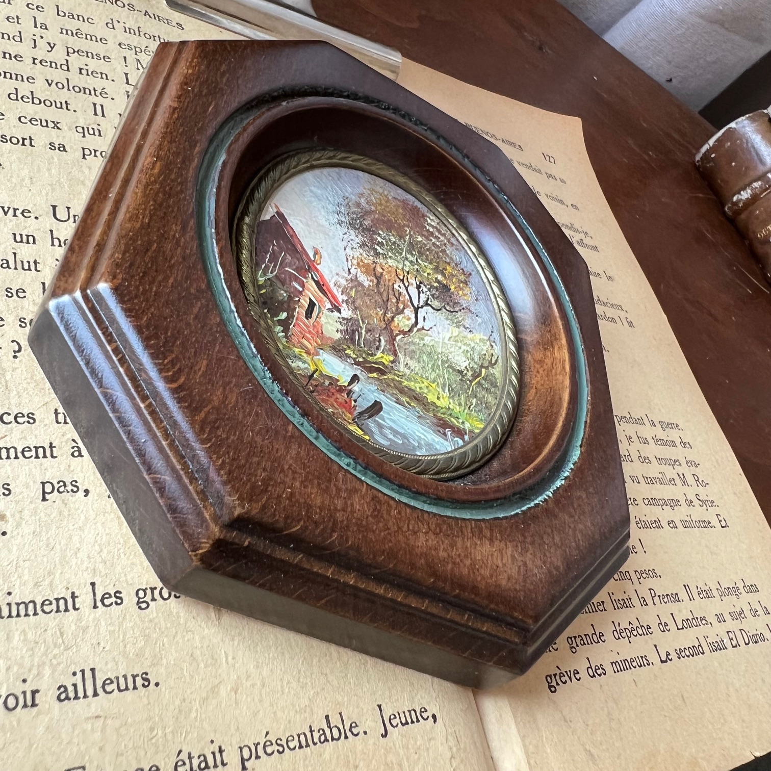 Petit trésor au charme délicat, soigneusement préservé dans son cadre hexagonal en bois à la patine chaleureuse. À l’intérieur, une miniature peinte à la main sur cuivre, représentant une scène paisible de campagne : une maison au bord de l’eau, entourée d’arbres.