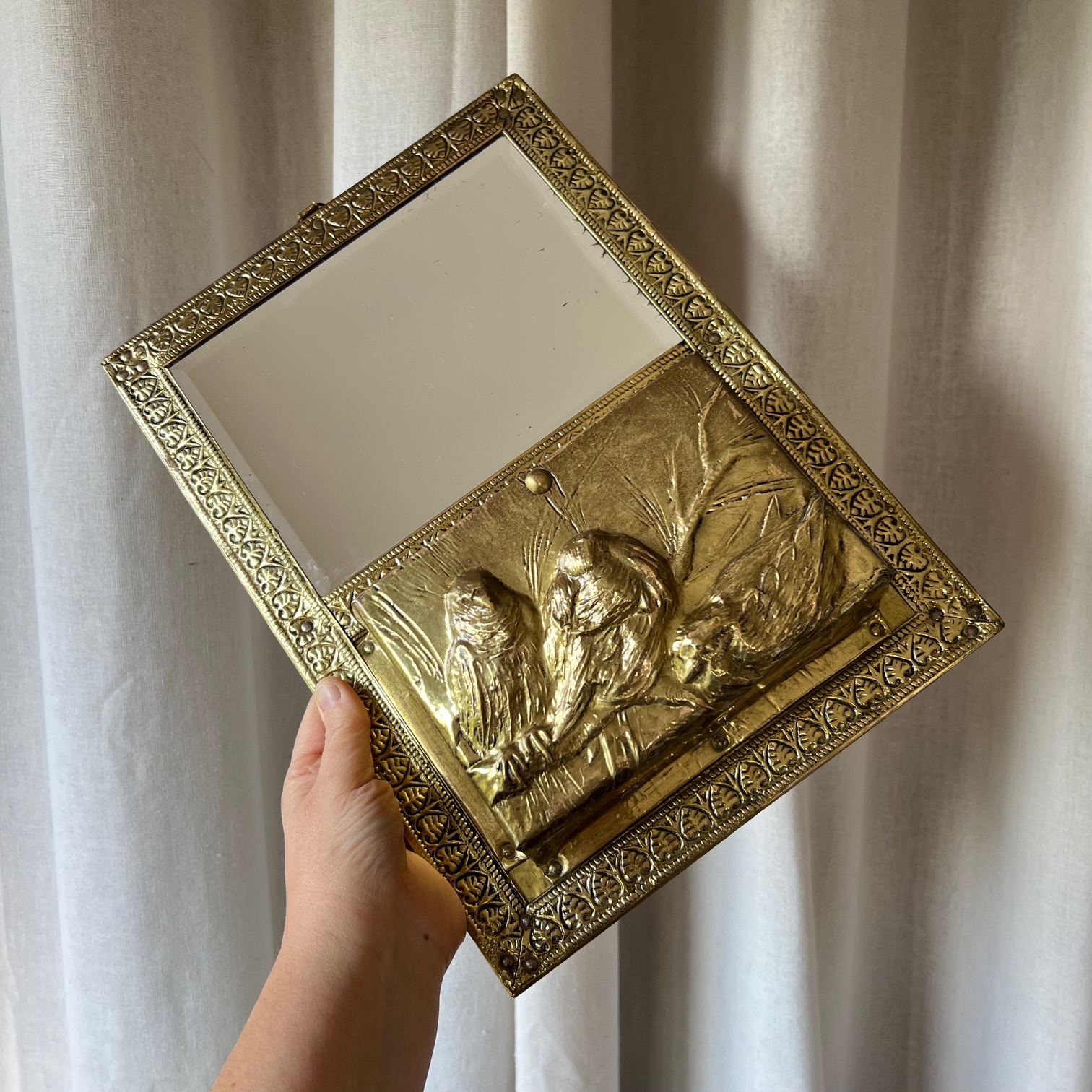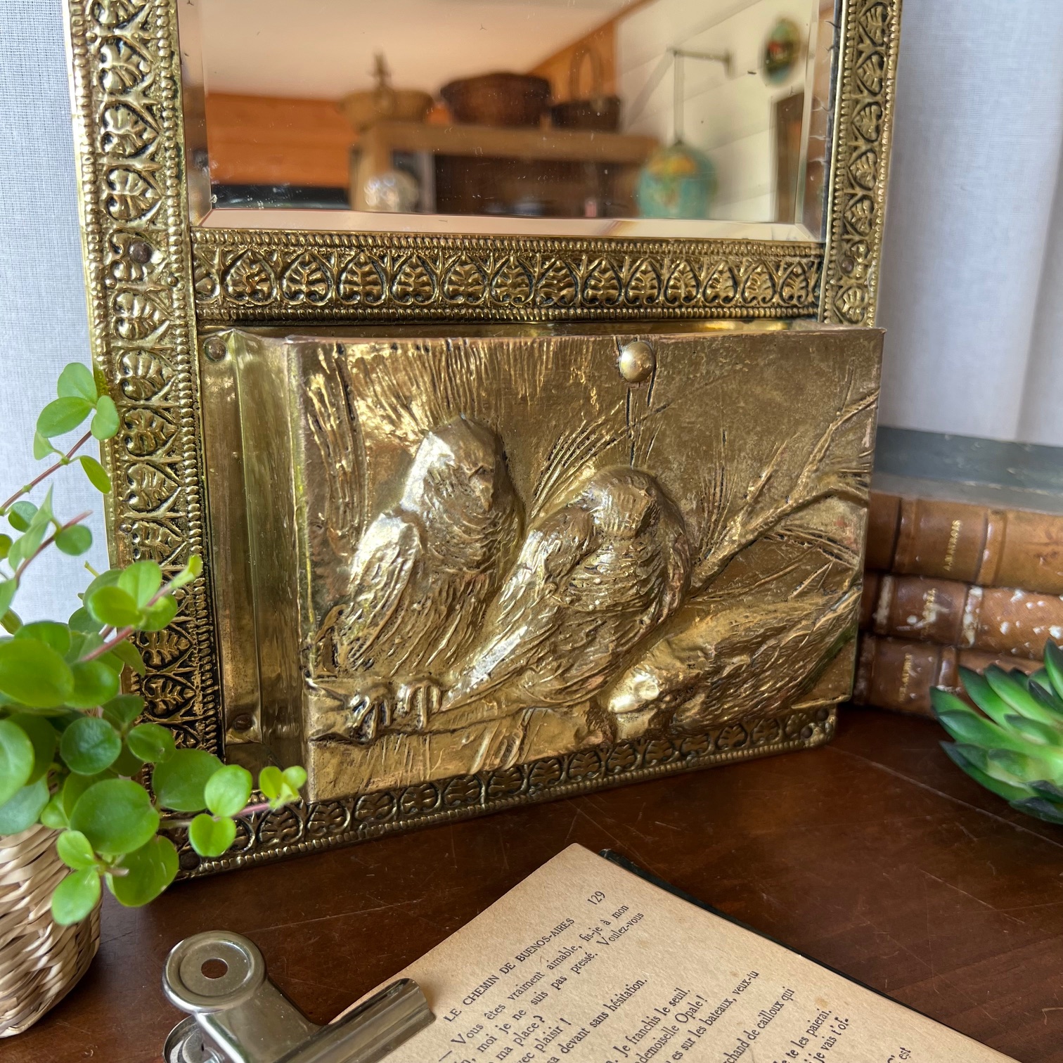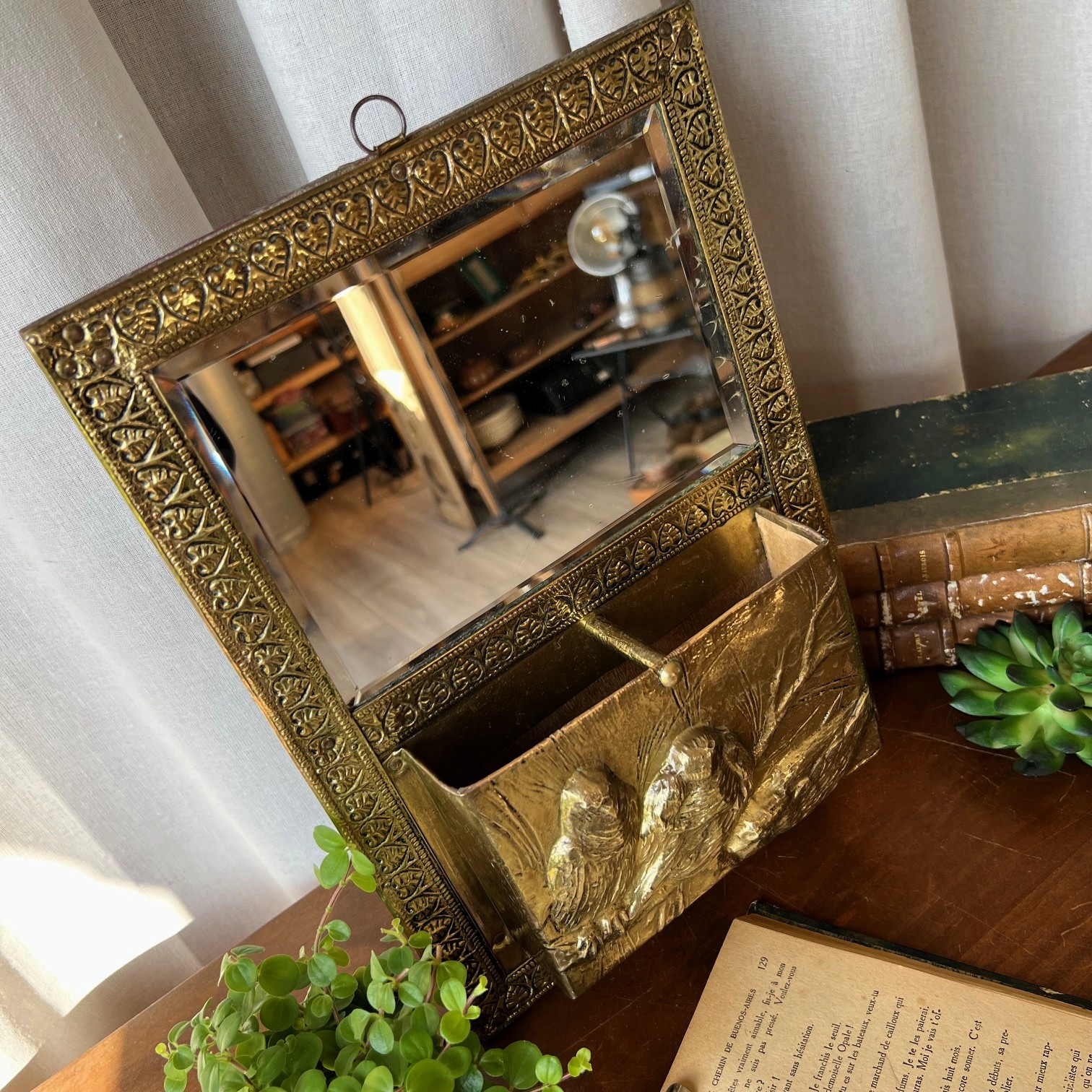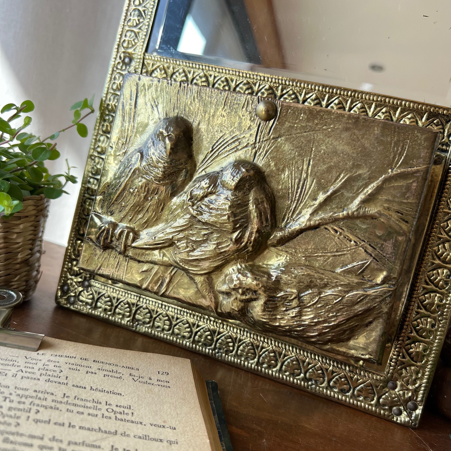 Son charme opère immédiatement : un cadre en laiton finement ciselé, orné de motifs floraux, abrite un miroir biseauté marqué par de subtiles traces du temps. En dessous, un compartiment en laiton repoussé révèle une scène délicate de trois oiseaux perchés sur une branche — symbole de douceur, de nature et d’harmonie. Le fond en bois et la boucle d’accroche au sommet complètent cet ensemble d’une belle authenticité.