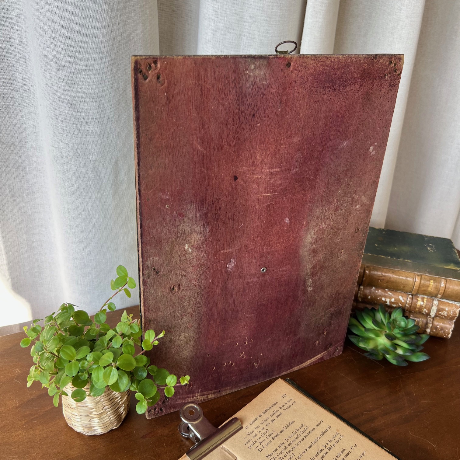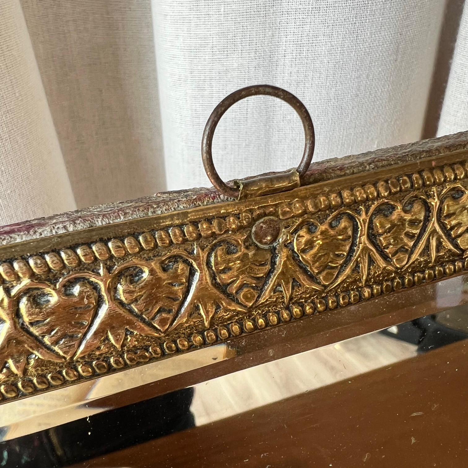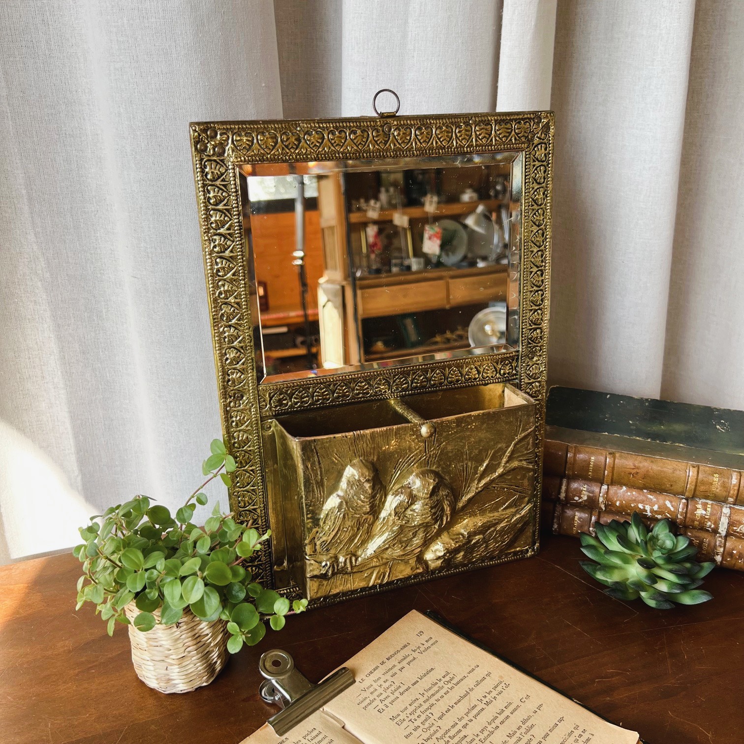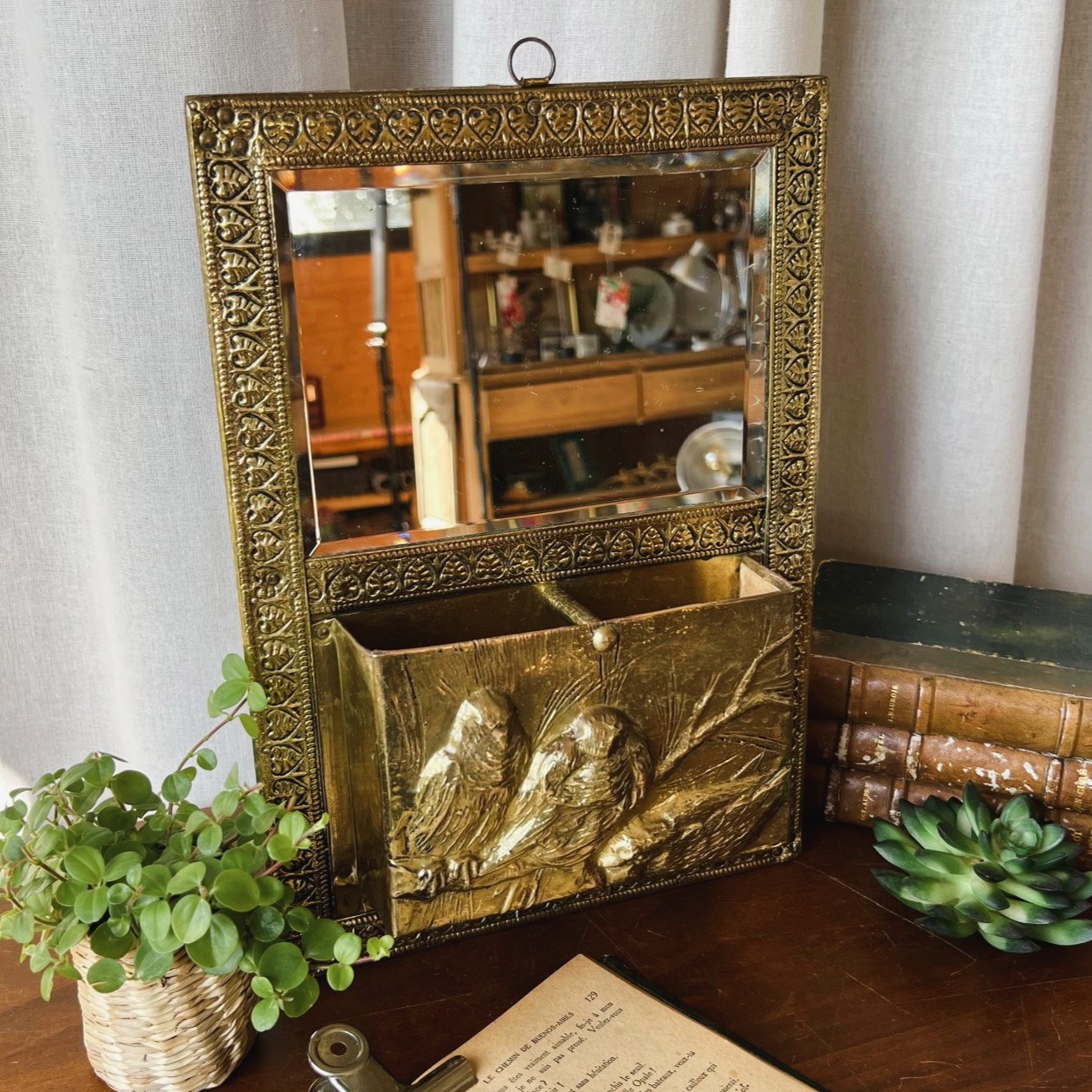 Son charme opère immédiatement : un cadre en laiton finement ciselé, orné de motifs floraux, abrite un miroir biseauté marqué par de subtiles traces du temps. En dessous, un compartiment en laiton repoussé révèle une scène délicate de trois oiseaux perchés sur une branche — symbole de douceur, de nature et d’harmonie. Le fond en bois et la boucle d’accroche au sommet complètent cet ensemble d’une belle authenticité.
