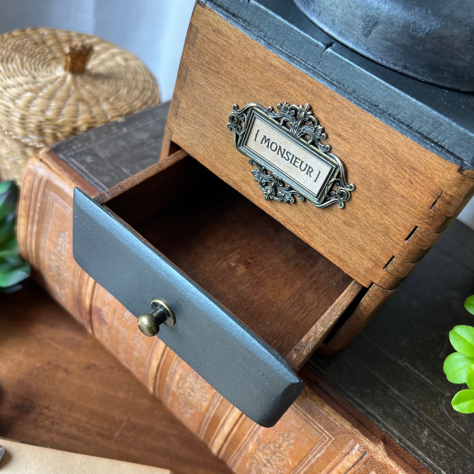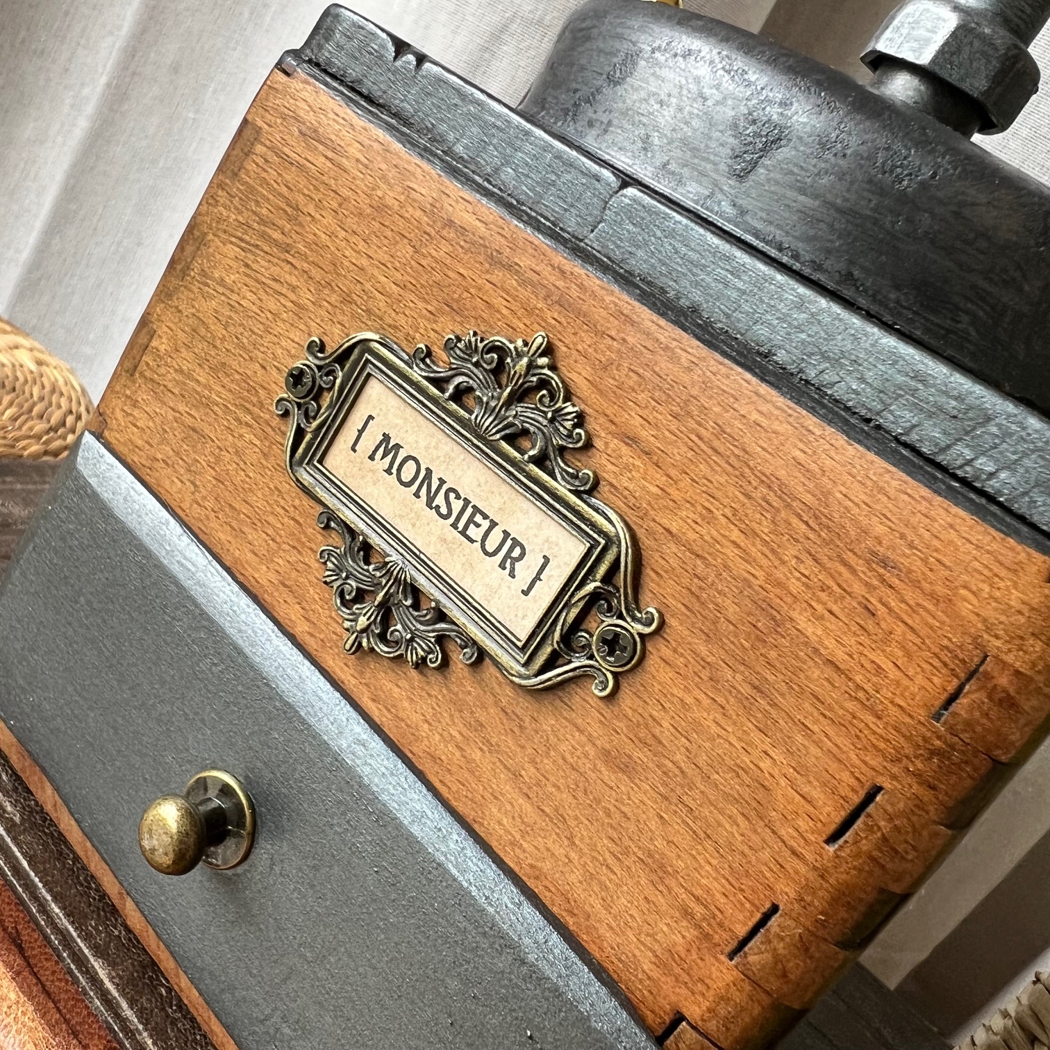 On craque pour les petits détails : la poignée en bois tourné, le bouton doré, le dôme en métal patiné… et surtout ce joli porte-étiquette personnalisable qui peut accueillir le mot de votre choix. Une belle idée de cadeau (pour soi ou pour un amateur de café).