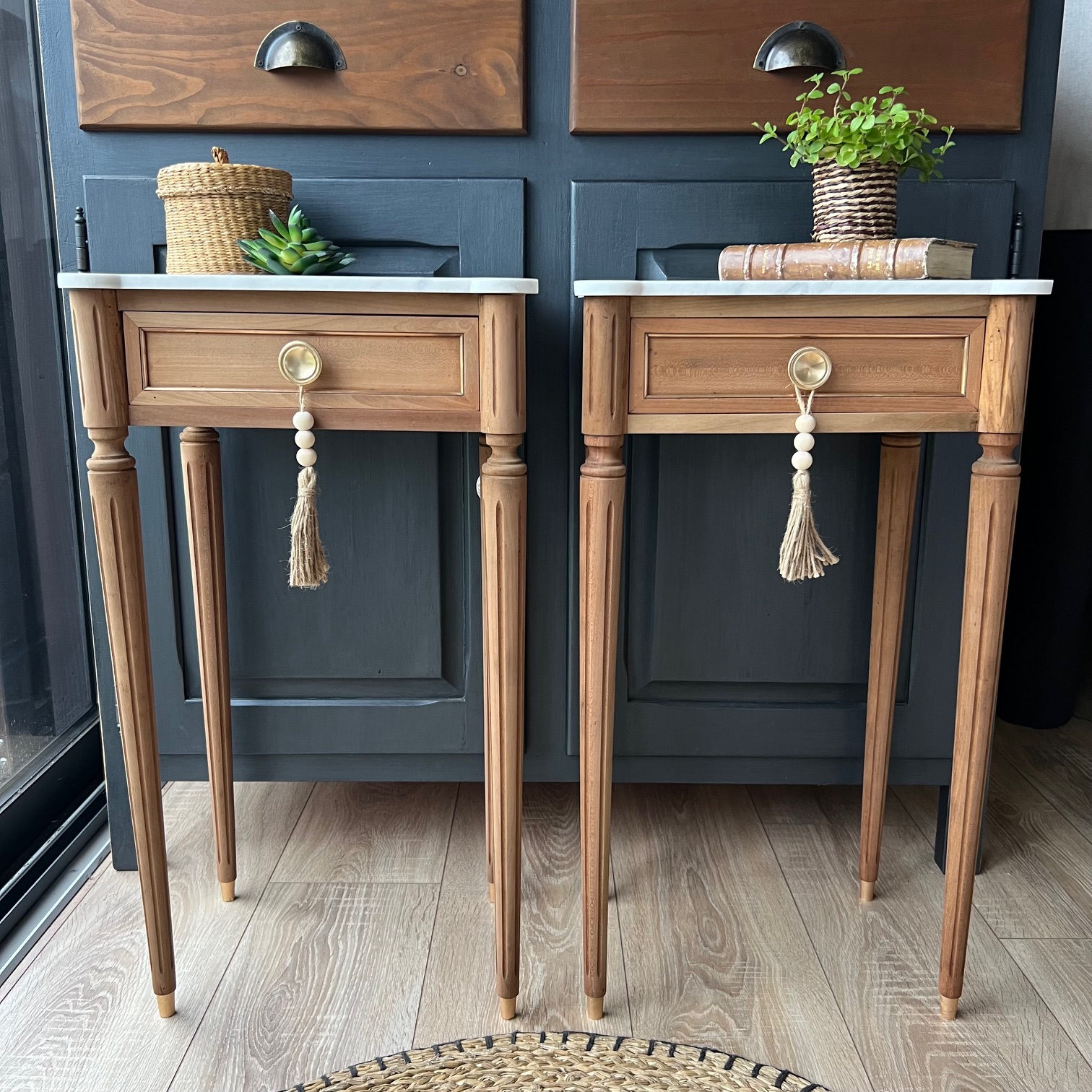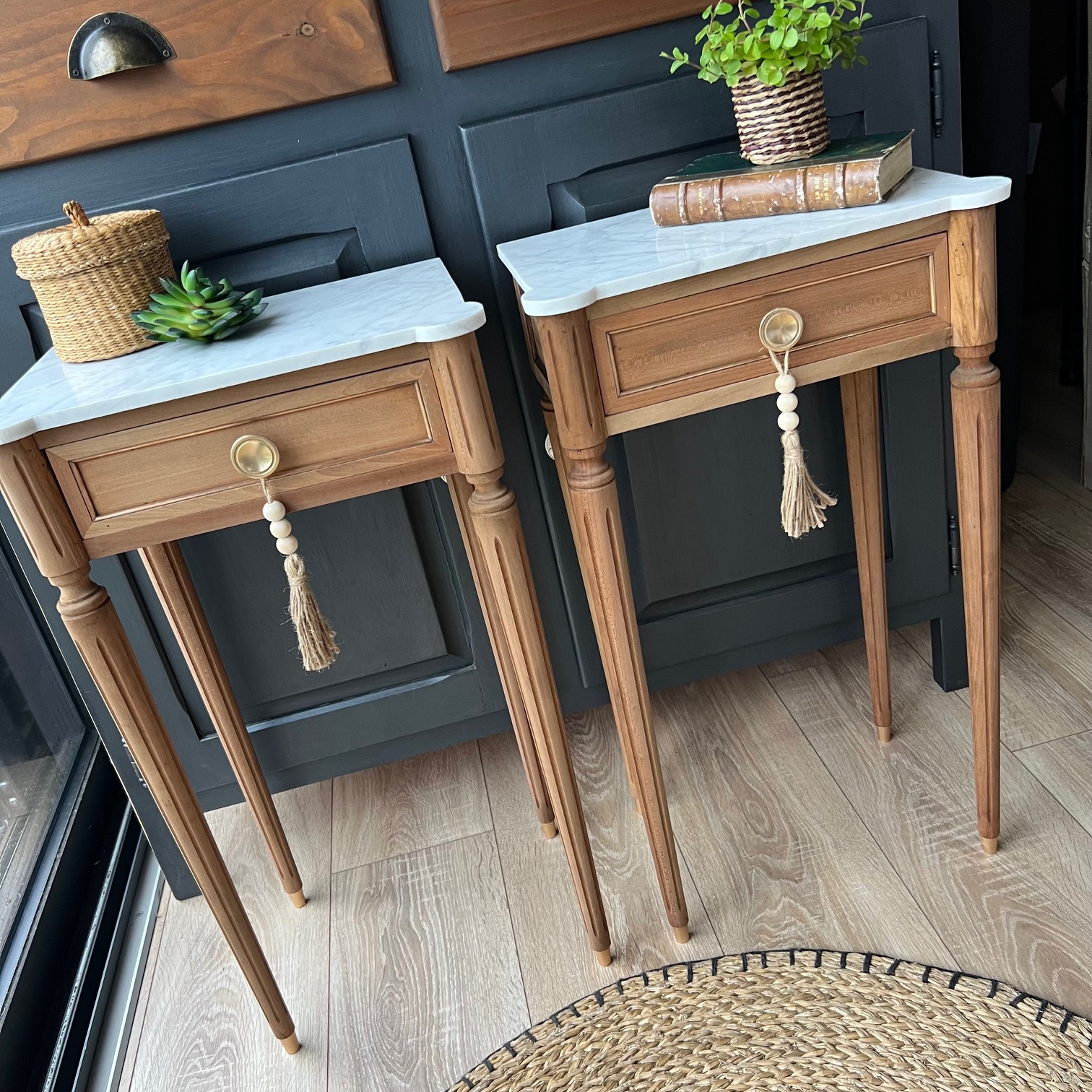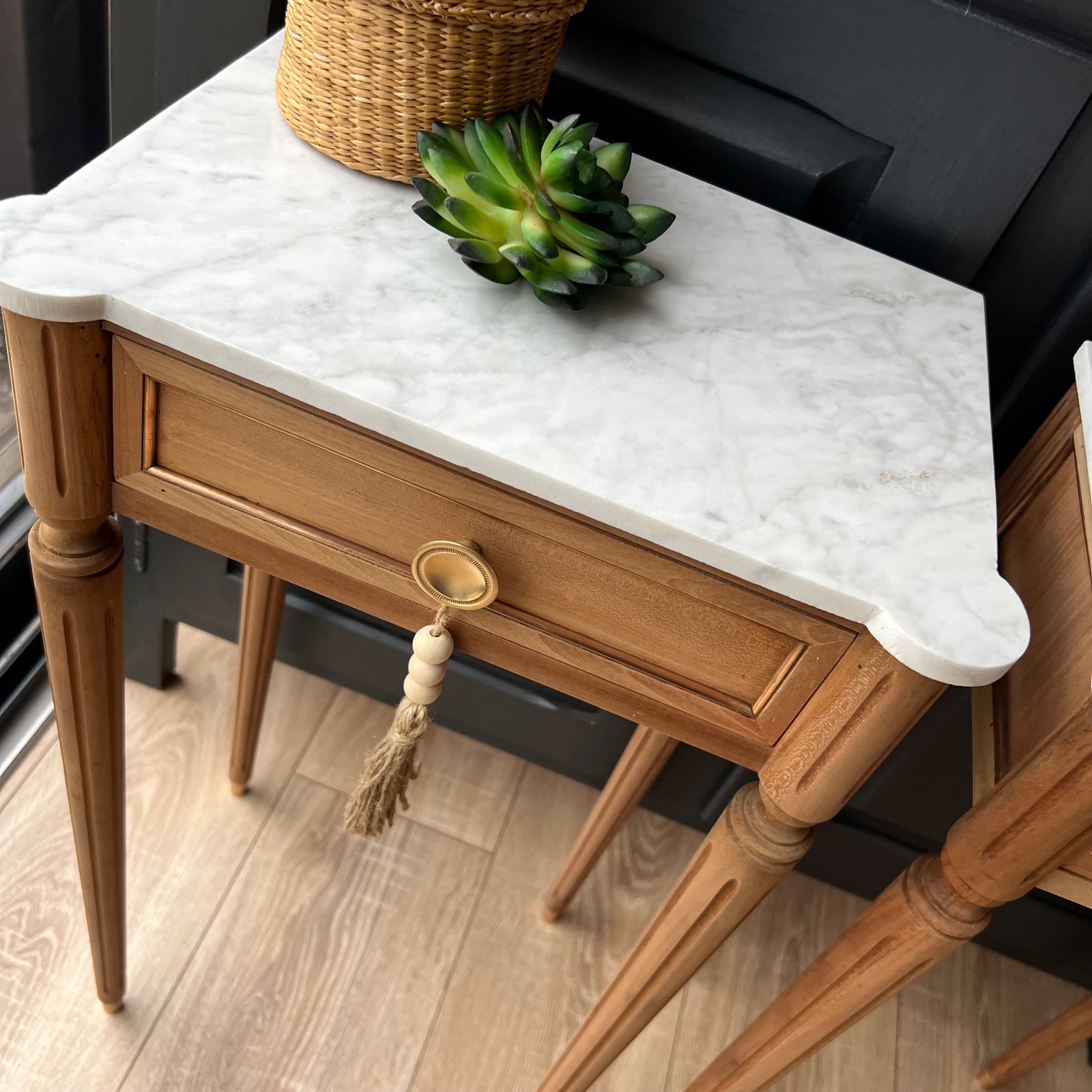 #chevetslouisxvi #stylelouisxvi #chevetsanciens #mobilierxxesiecle #acajou #marbreblanc #baguettesenlaiton #brocantechic #restaurationsensible #objetancien #pairedechevets #mavaliseencarton #brocanteuse #meubleavecunehistoire