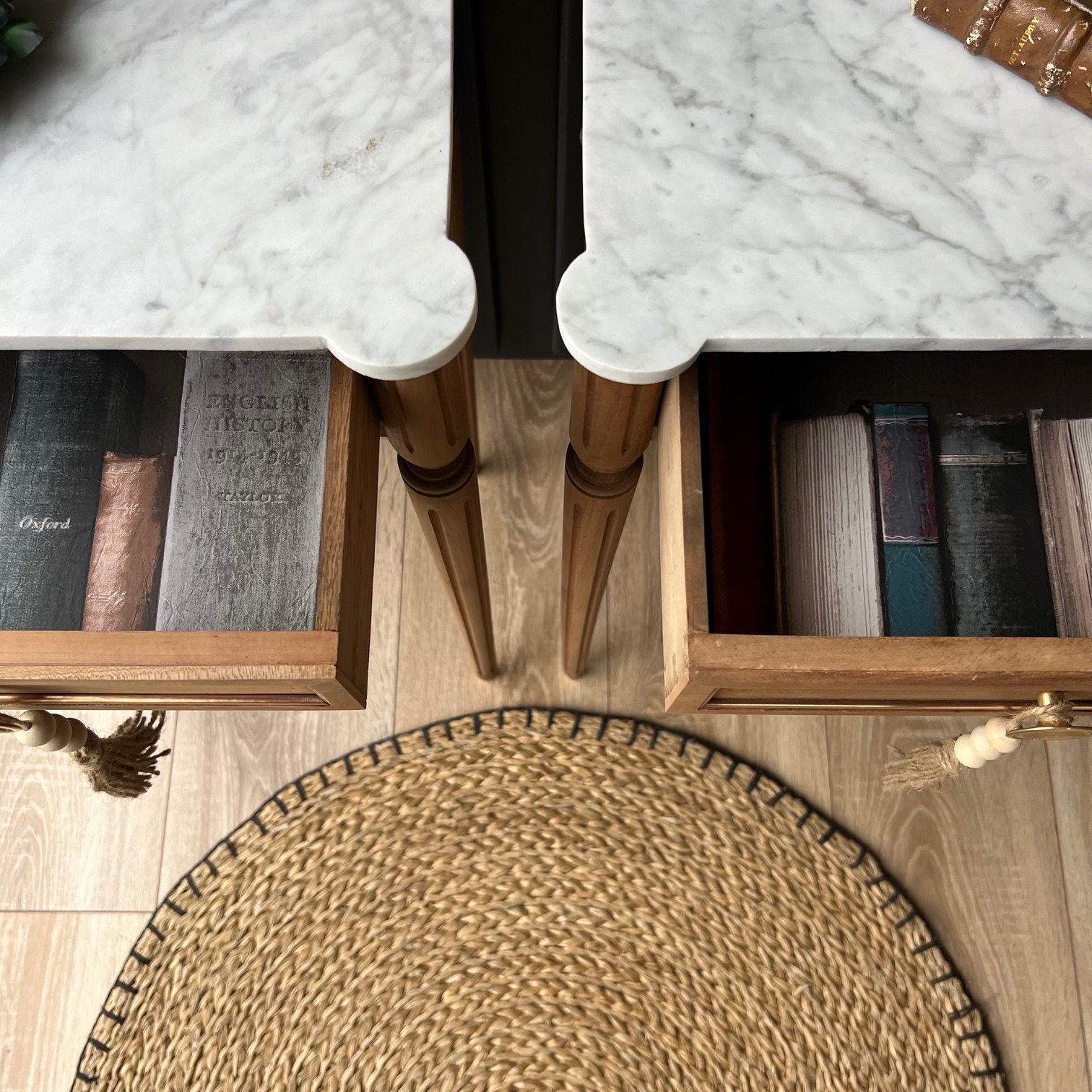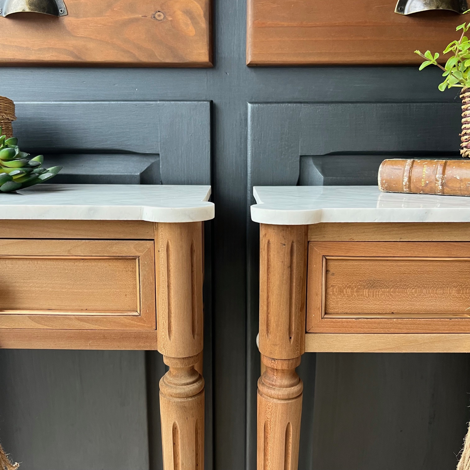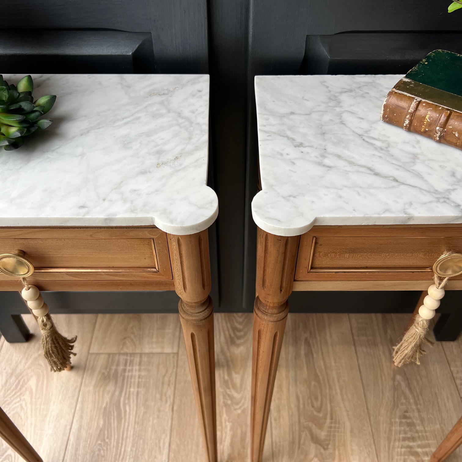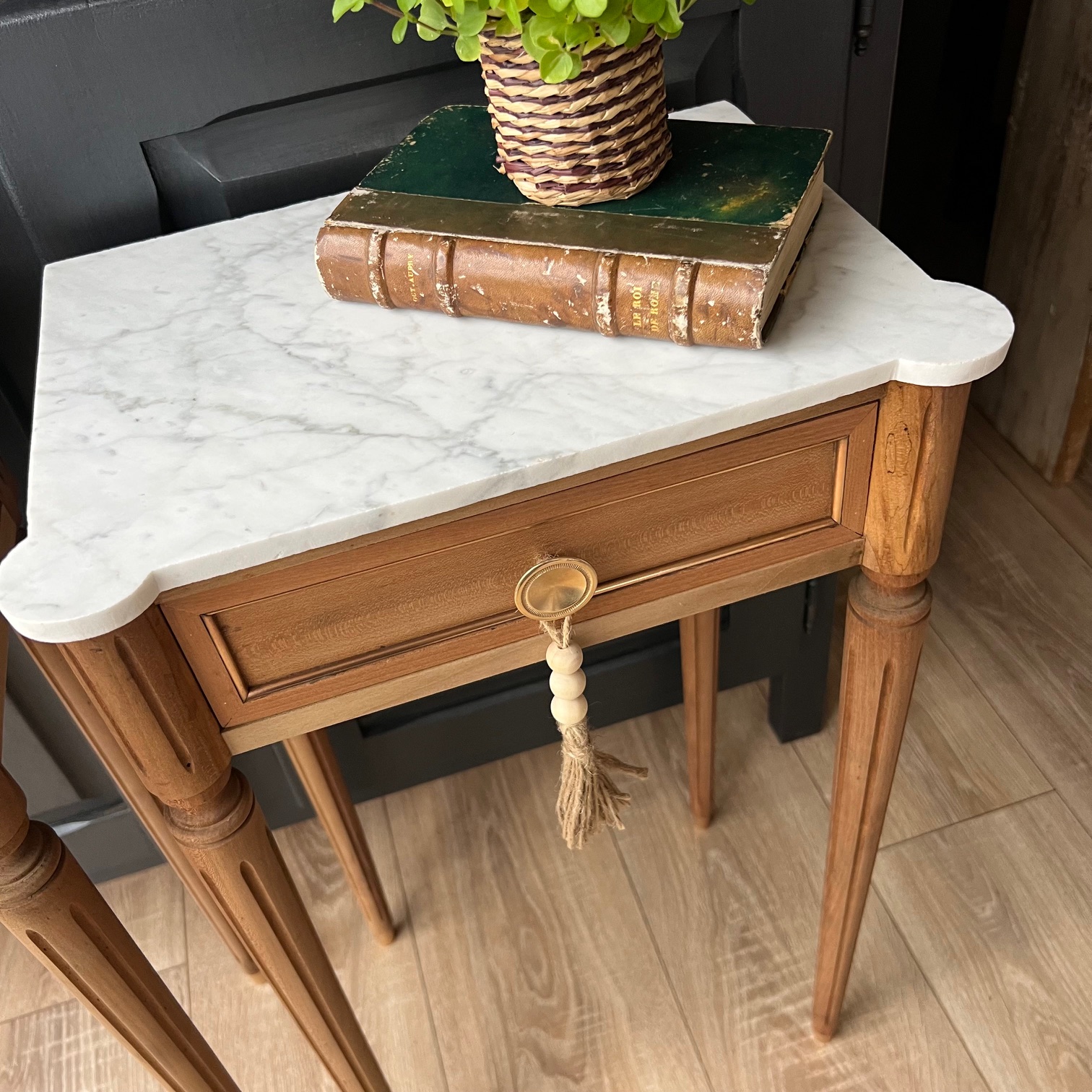 #chevetslouisxvi #stylelouisxvi #chevetsanciens #mobilierxxesiecle #acajou #marbreblanc #baguettesenlaiton #brocantechic #restaurationsensible #objetancien #pairedechevets #mavaliseencarton #brocanteuse #meubleavecunehistoire