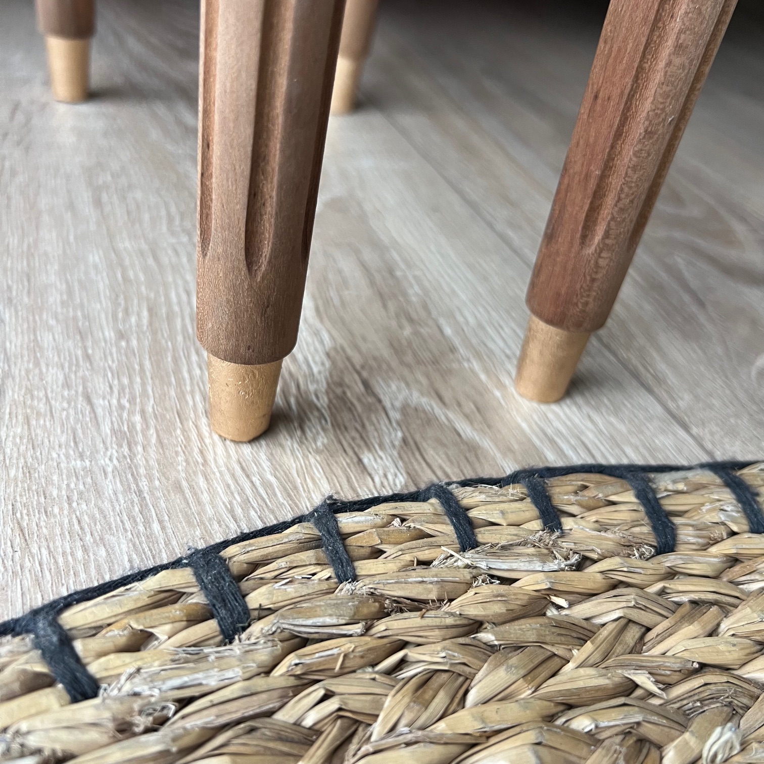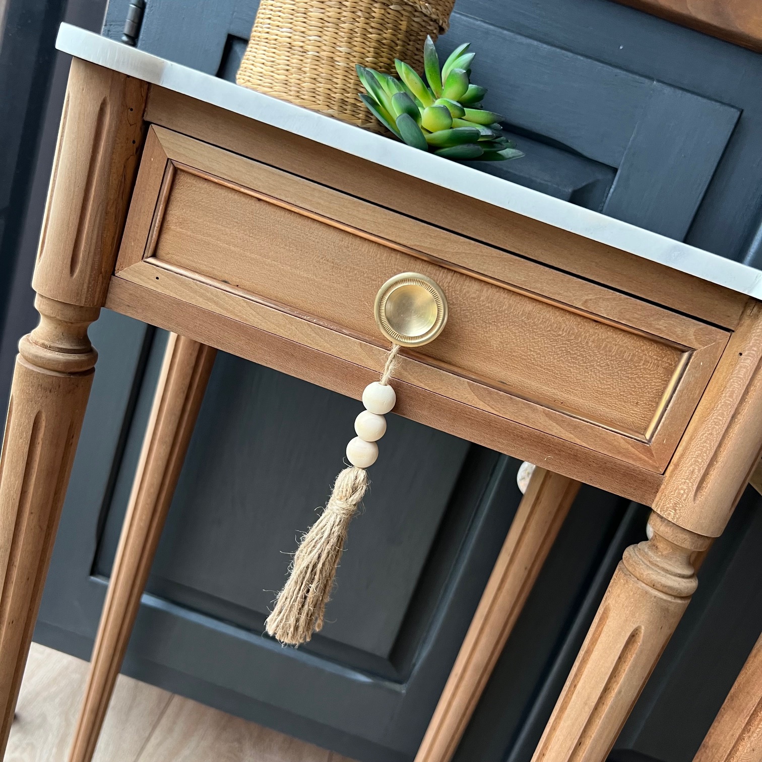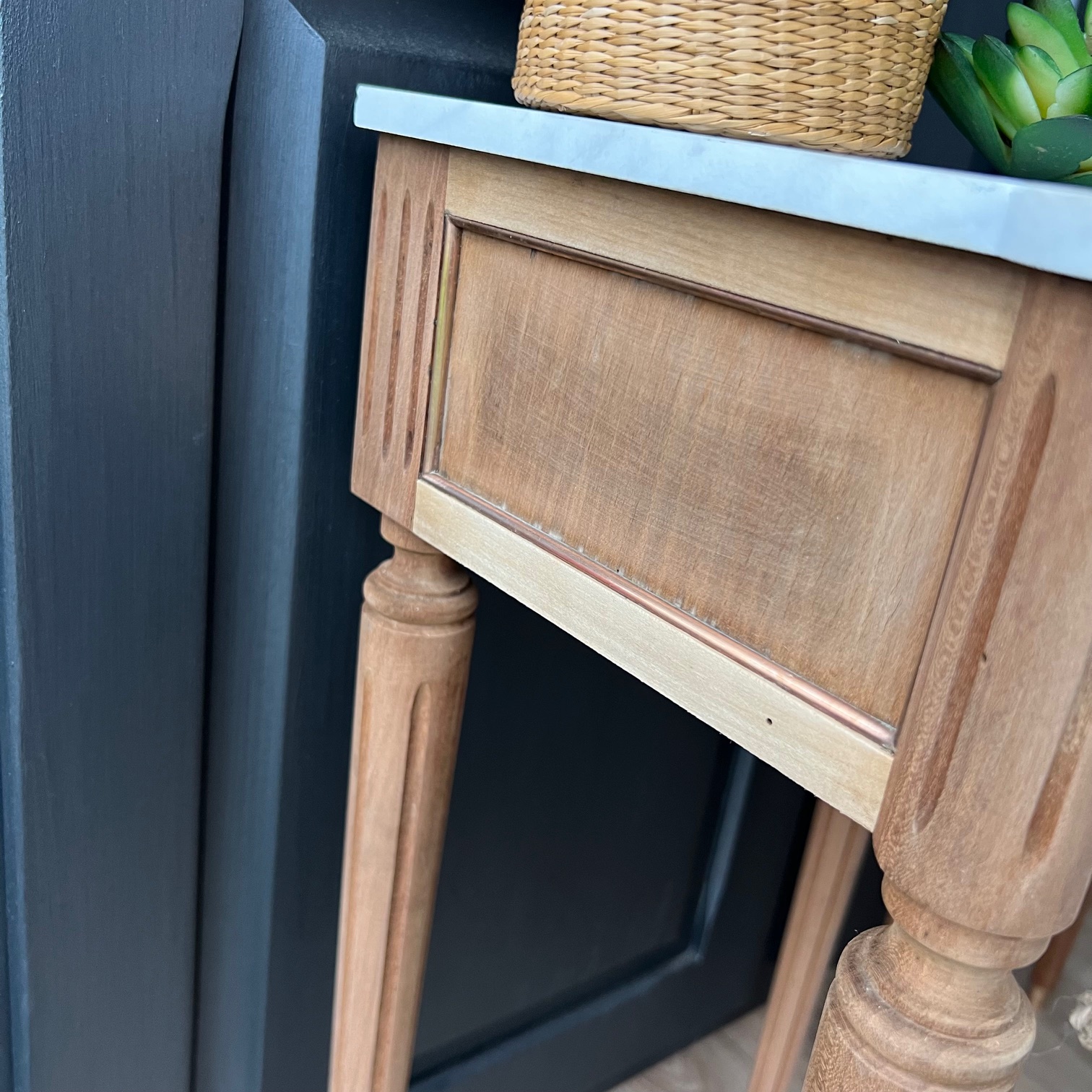 Les quatre pieds fuselés à cannelures se terminaient à l’origine par des sabots en bronze, aujourd’hui absents. J’ai choisi d’en rappeler l’esprit par une finition dorée en partie basse, une intervention volontairement sobre, pensée comme un écho aux usages de l’époque plutôt qu’une reconstitution.