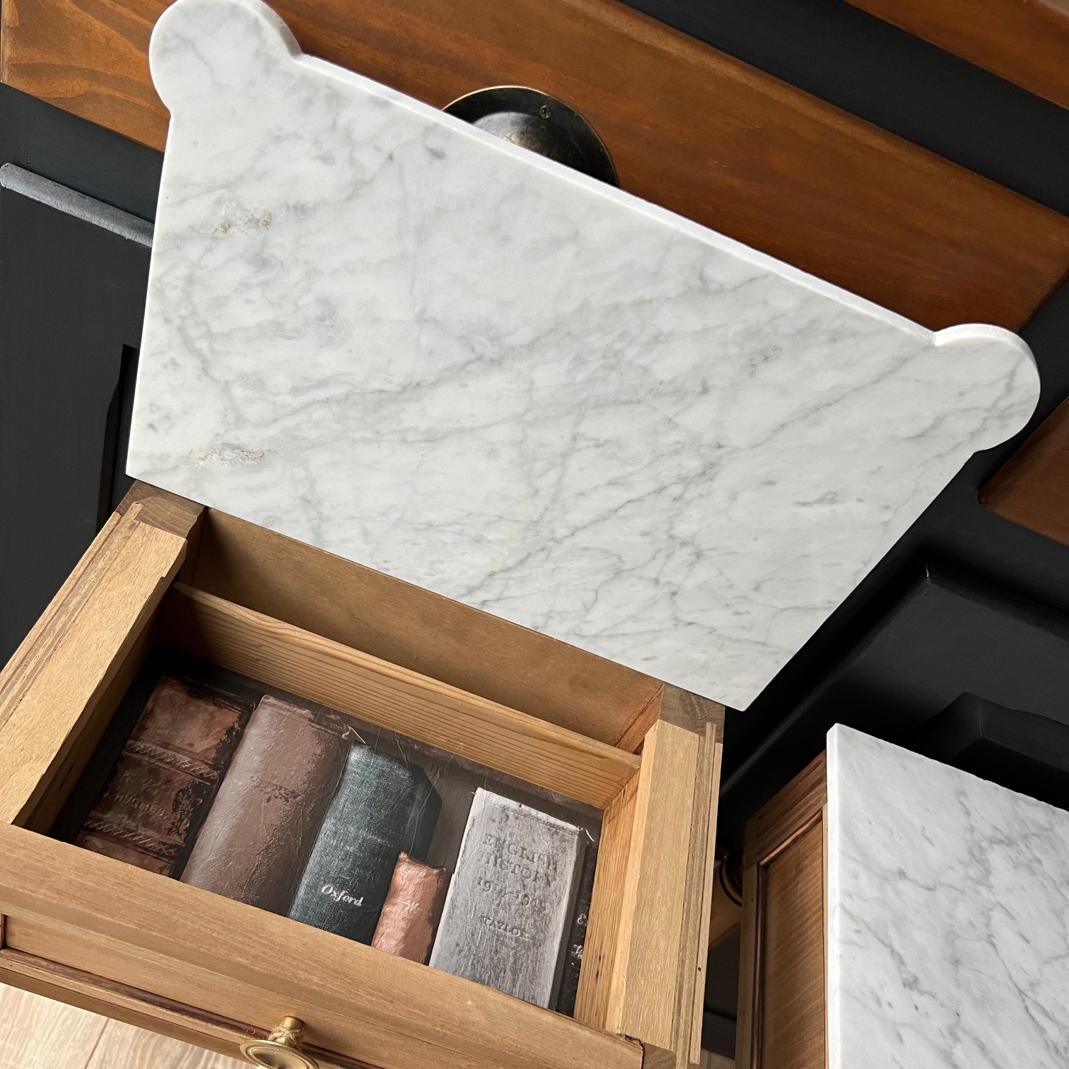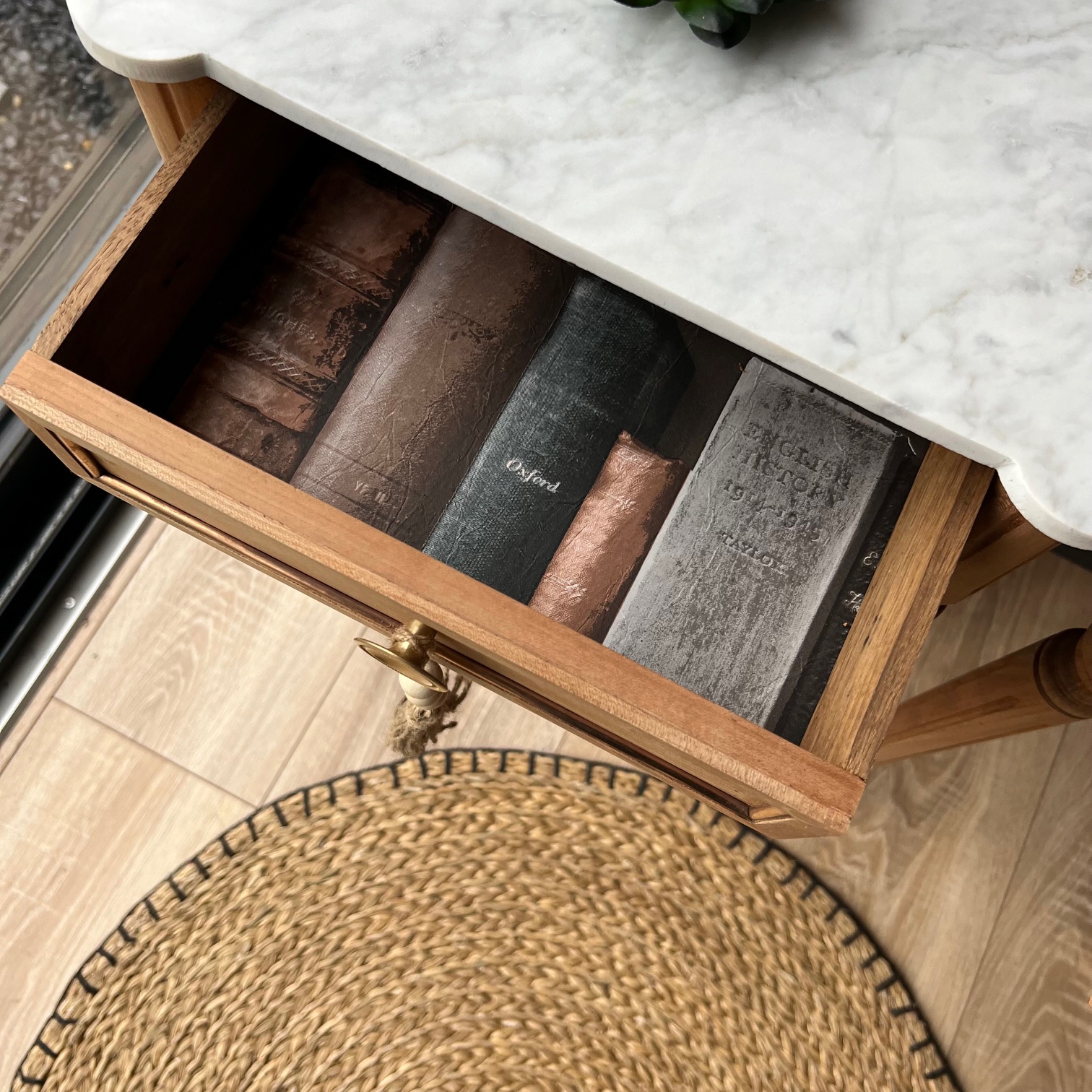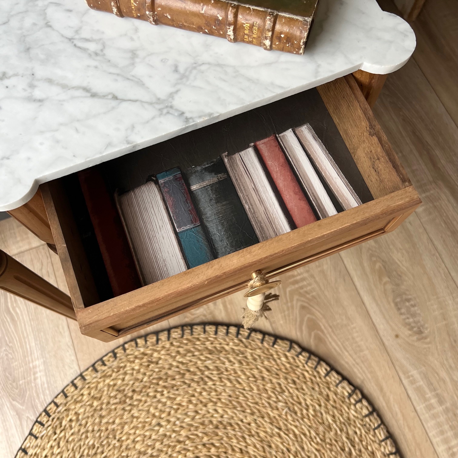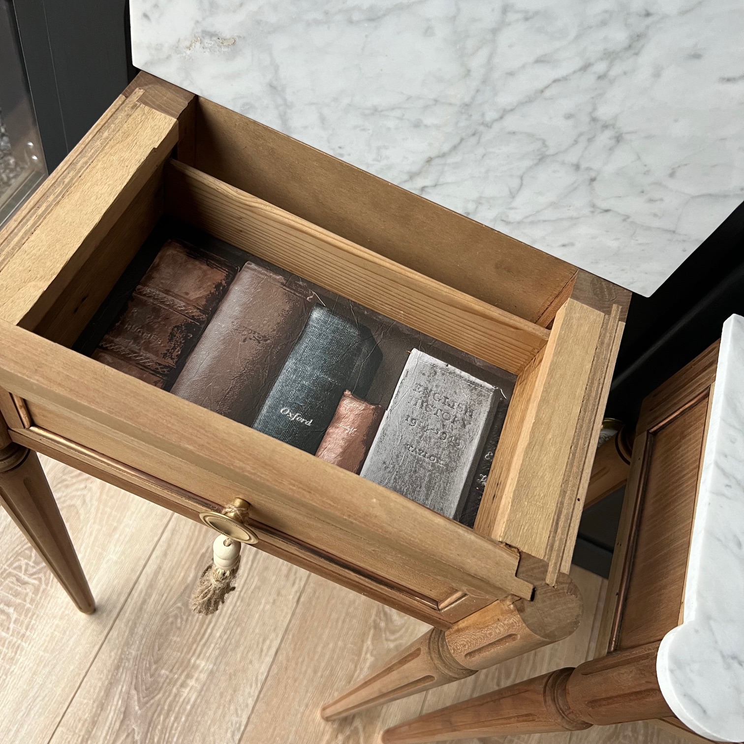 À l’ouverture du tiroir, le regard est attiré par un fond habillé d’un papier peint représentant des tranches de livres, clin d’œil discret aux tables de chevet d’autrefois, pensées comme des compagnes du soir.