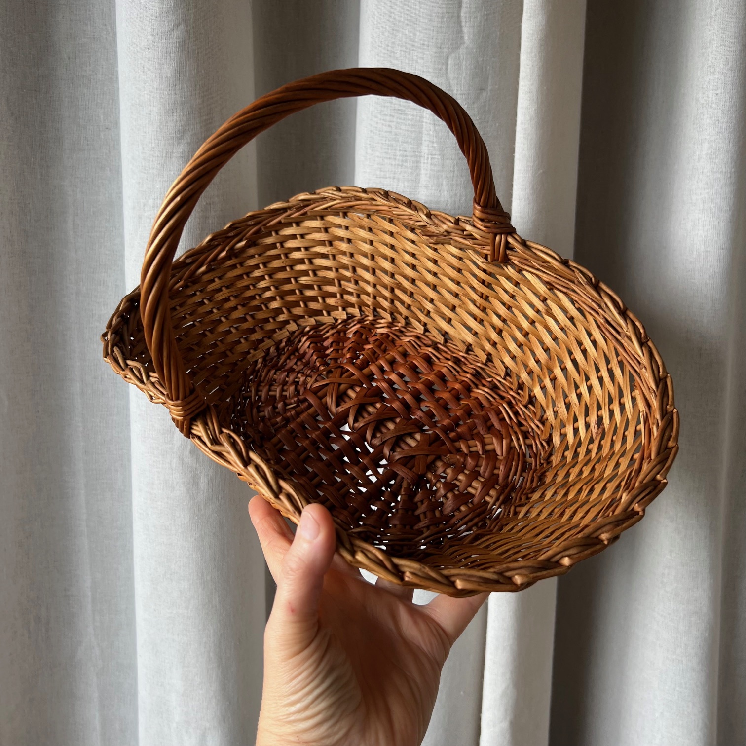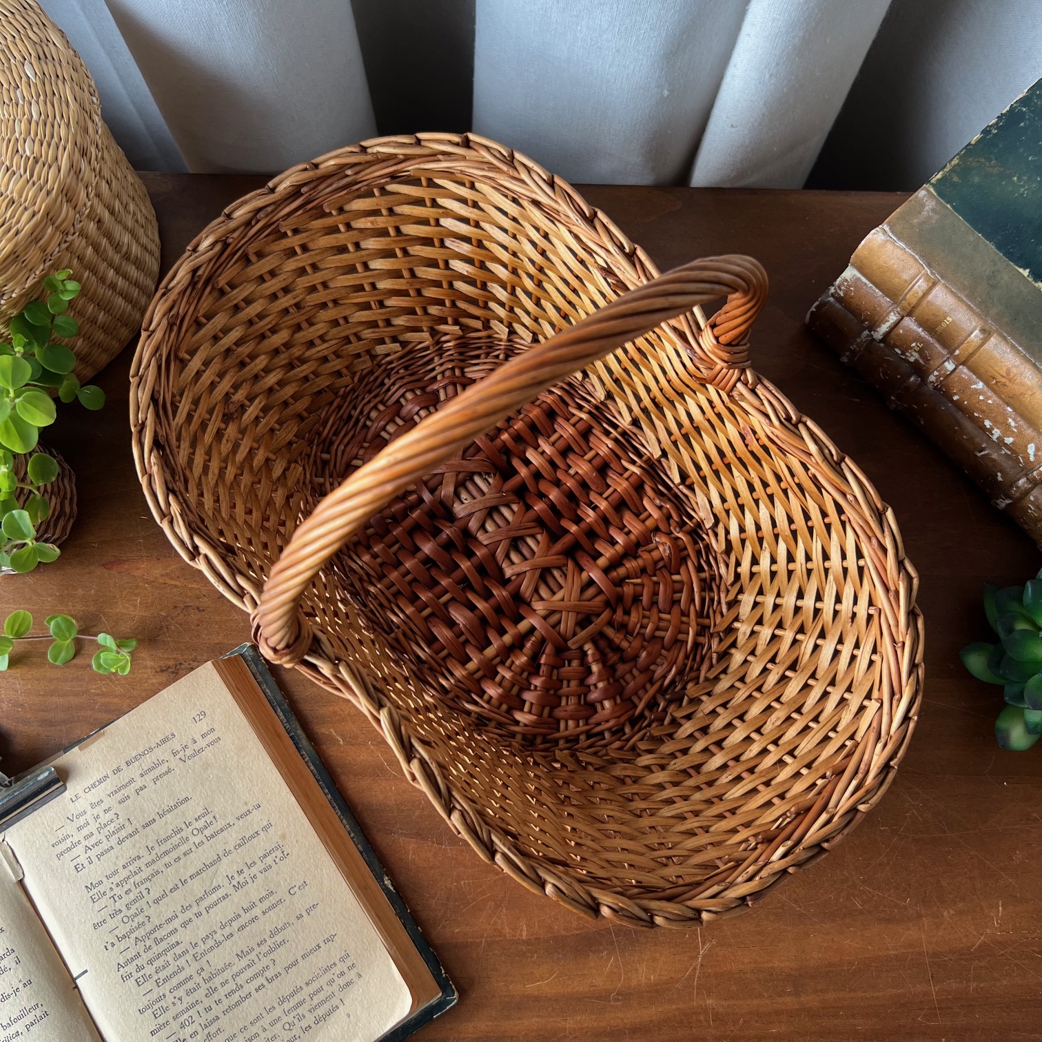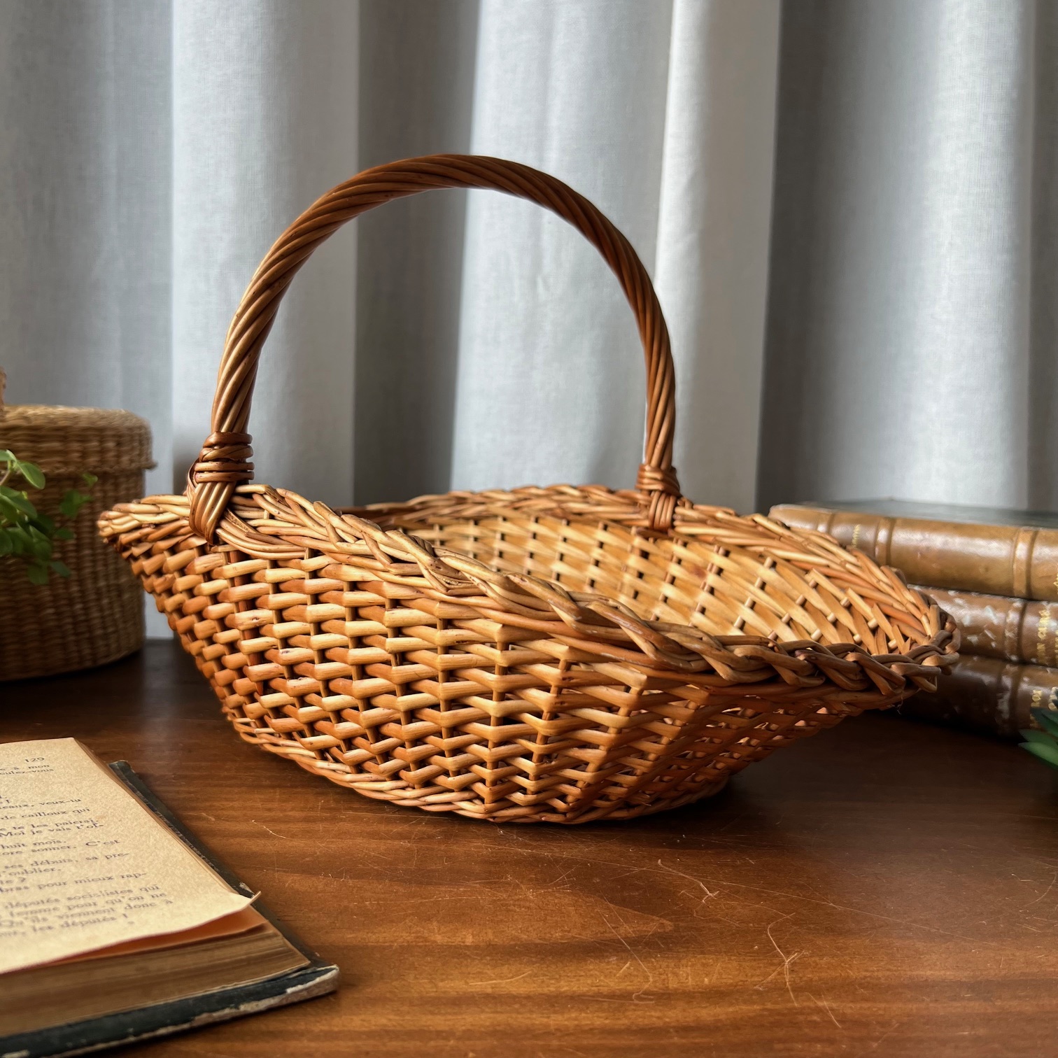 Avec son tressage délicat et sa belle teinte miel, ce panier en osier ancien séduit par sa simplicité élégante. Solide et intemporel, il a traversé les années avec grâce et présente un bel état général, agrémenté de quelques rares marques du temps qui témoignent de son histoire.