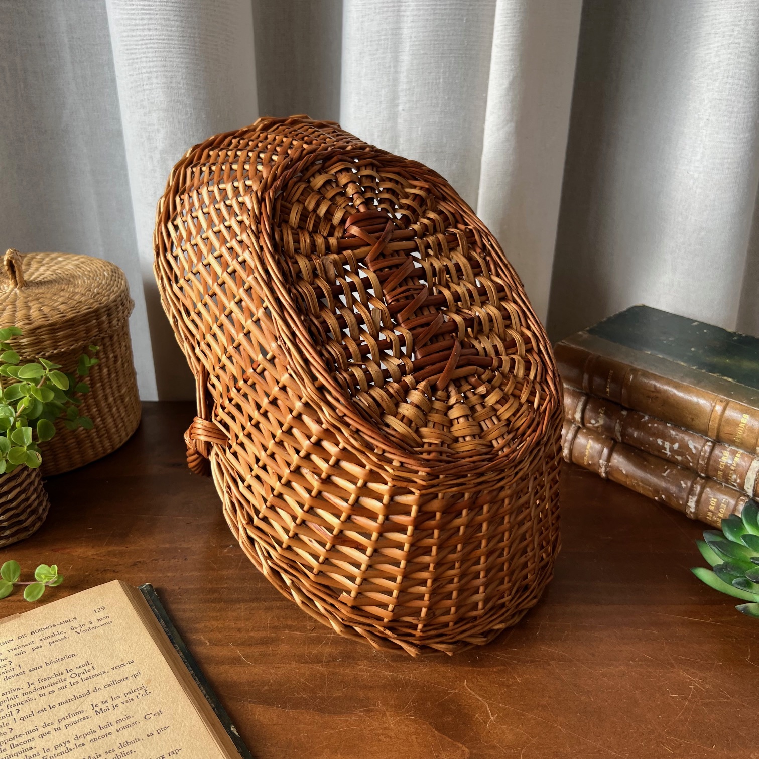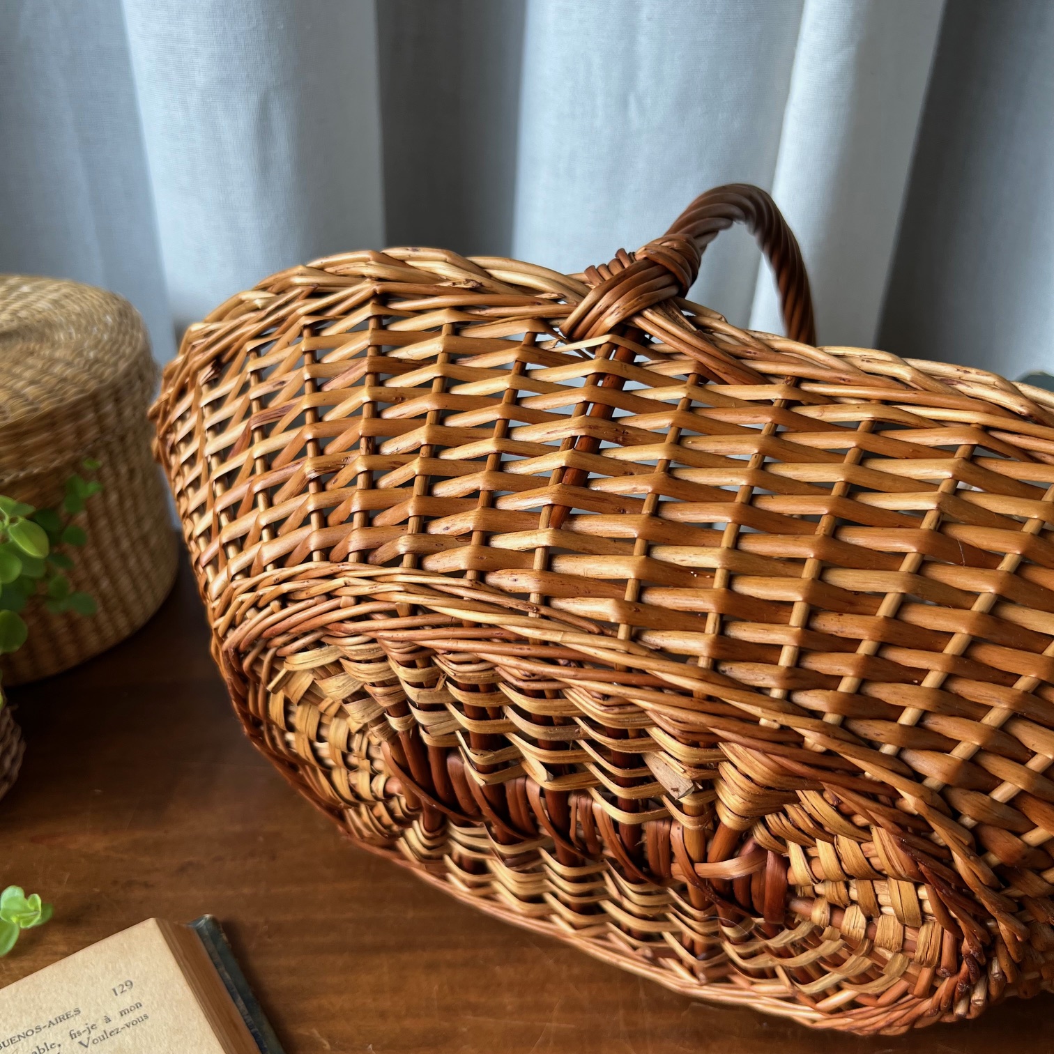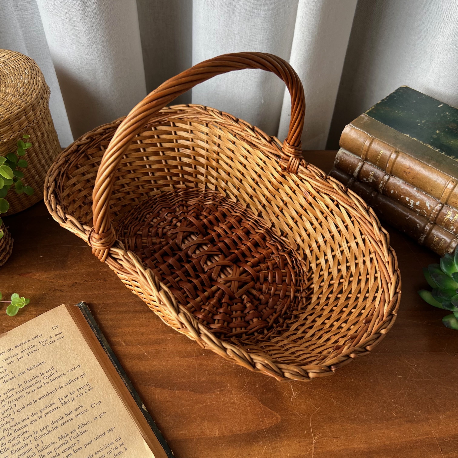 Avec son tressage délicat et sa belle teinte miel, ce panier en osier ancien séduit par sa simplicité élégante. Solide et intemporel, il a traversé les années avec grâce et présente un bel état général, agrémenté de quelques rares marques du temps qui témoignent de son histoire.