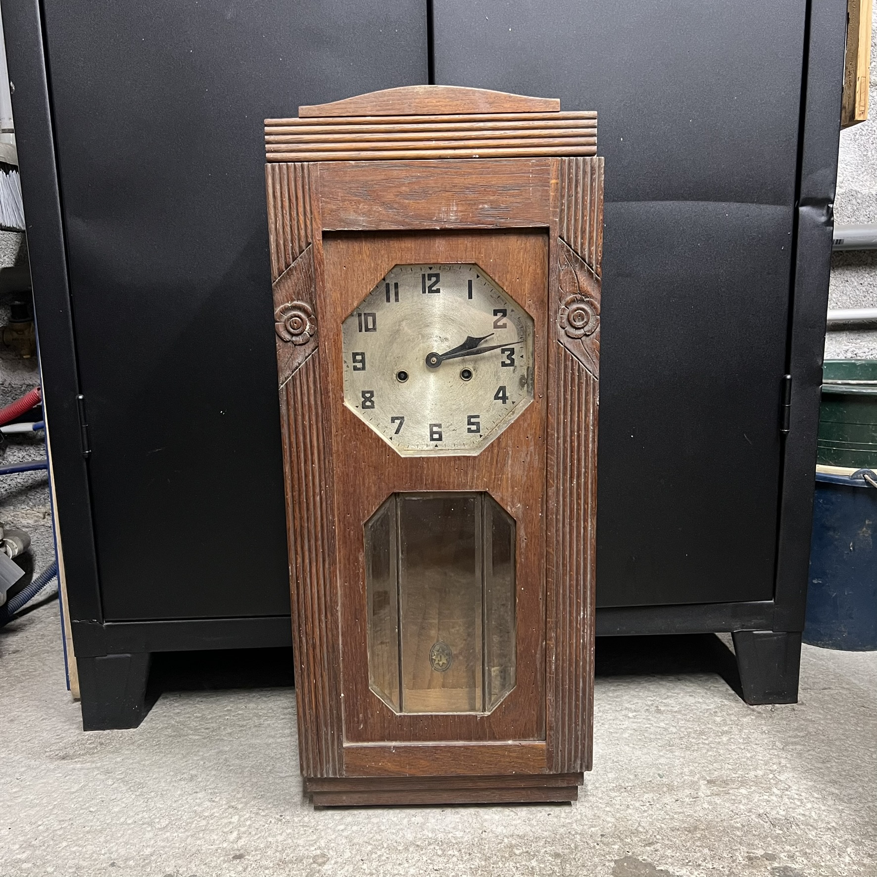 Cette pendule murale art déco faisait partie de la deuxième catégorie.Le mécanisme hors service, le bois recouvert d’un plaquage à bout de souffle, effiloché, grignoté par le temps et quelques petits habitants discrets…Une des vitres rayée, irrécupérable.