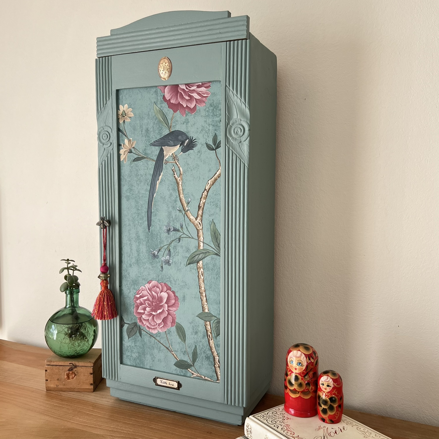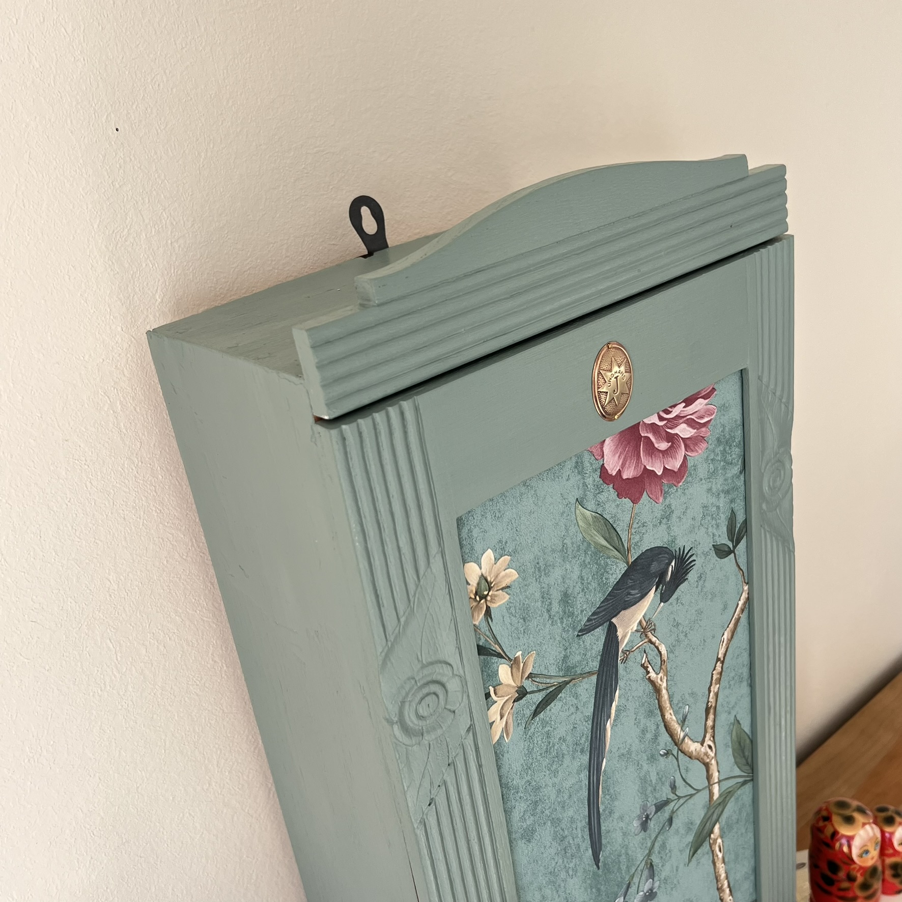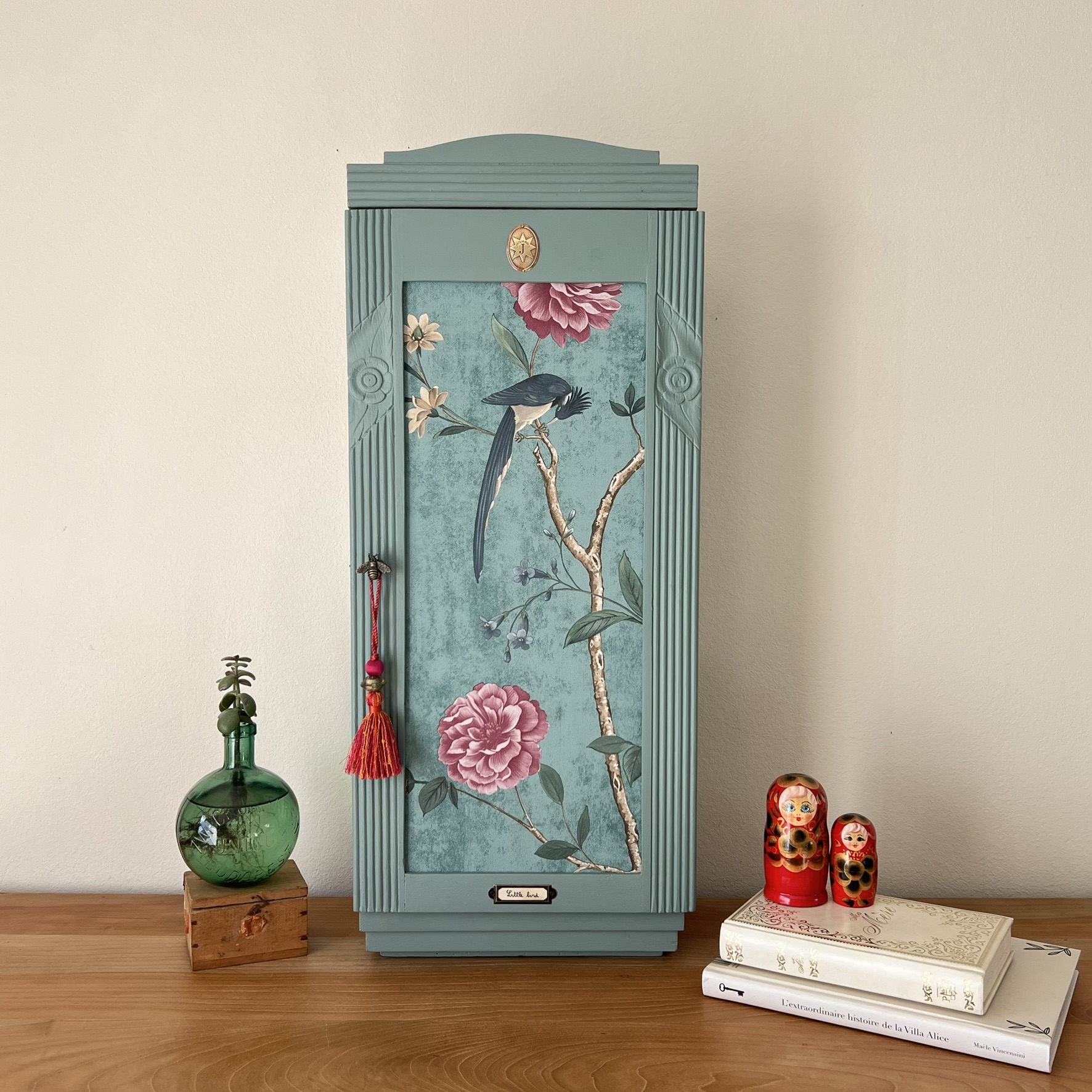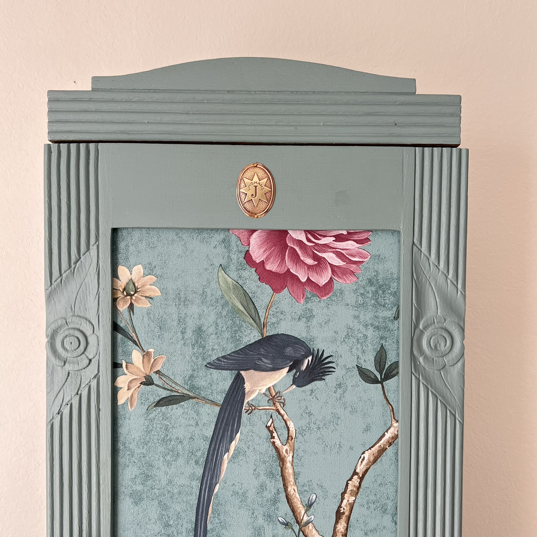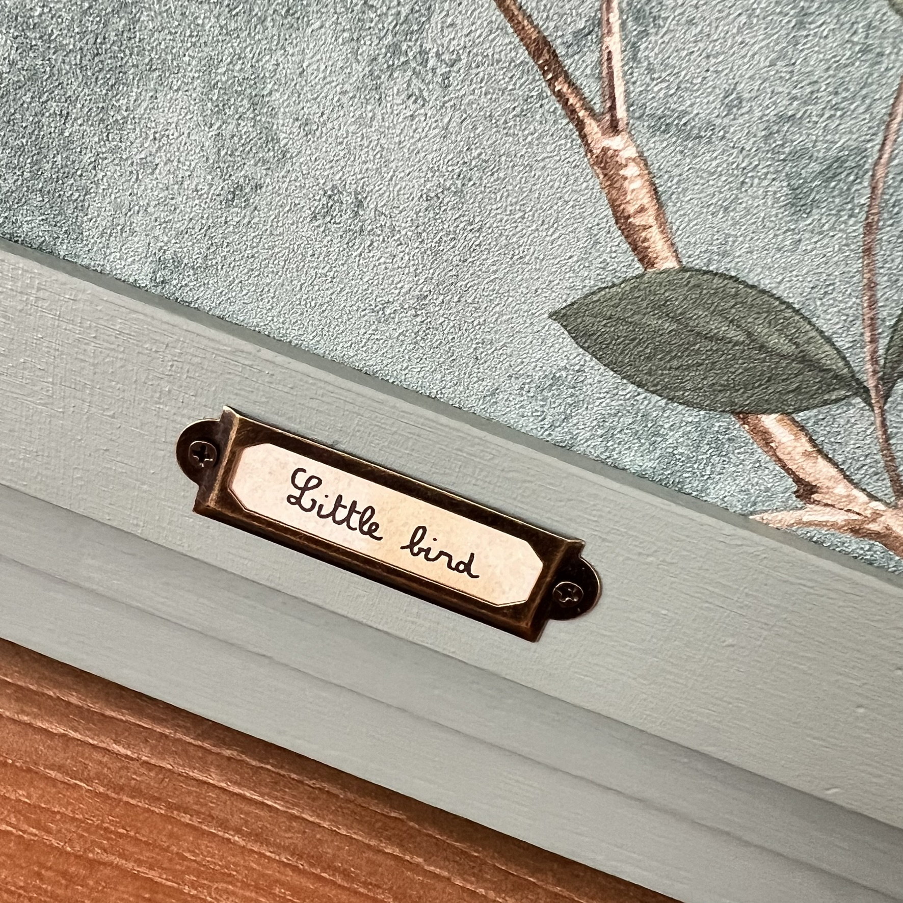 À la place de la grande vitre frontale, j’ai créé un panneau en bois, habillé à l’intérieur et à l’extérieur d’un papier peint choisi avec soin : vert d’eau, fleurs rosées, une branche, un oiseau… Un décor poétique qui se pose là, sans bruit. Sur le devant, une petite plaque ovale en laiton, marquée d’un “J”. Elle était cachée à l’intérieur de l’horloge. J’ai voulu la remettre en lumière, comme un clin d’œil à son histoire. En bas, un porte-étiquette ancien, “Little Bird”, et un bouton en laiton en forme d’abeille pour ouvrir la porte.