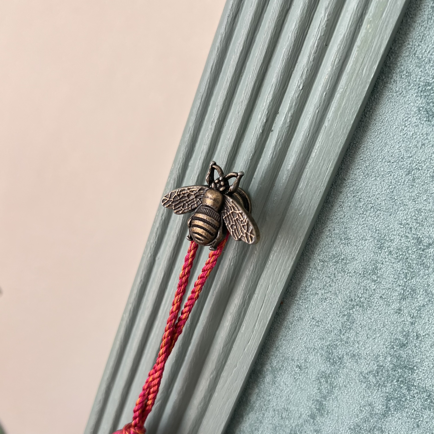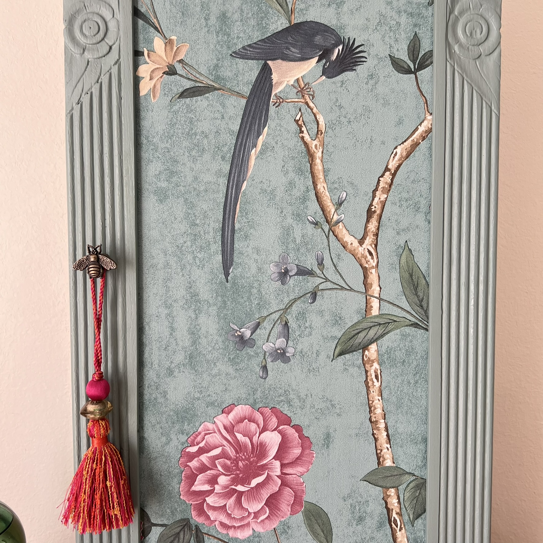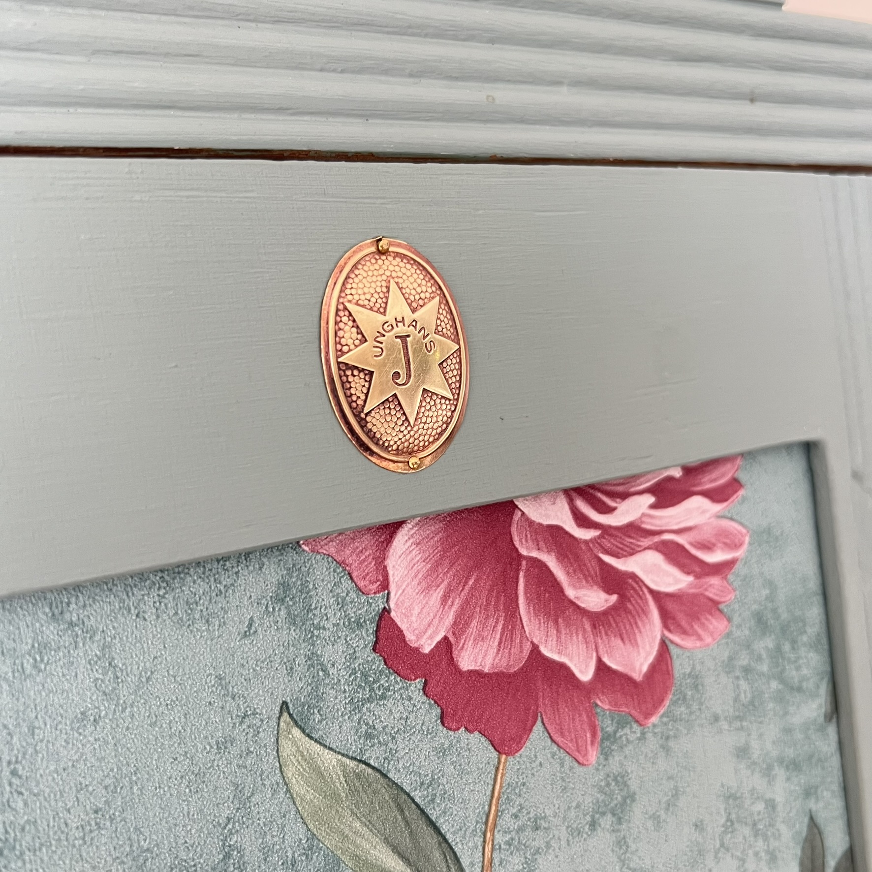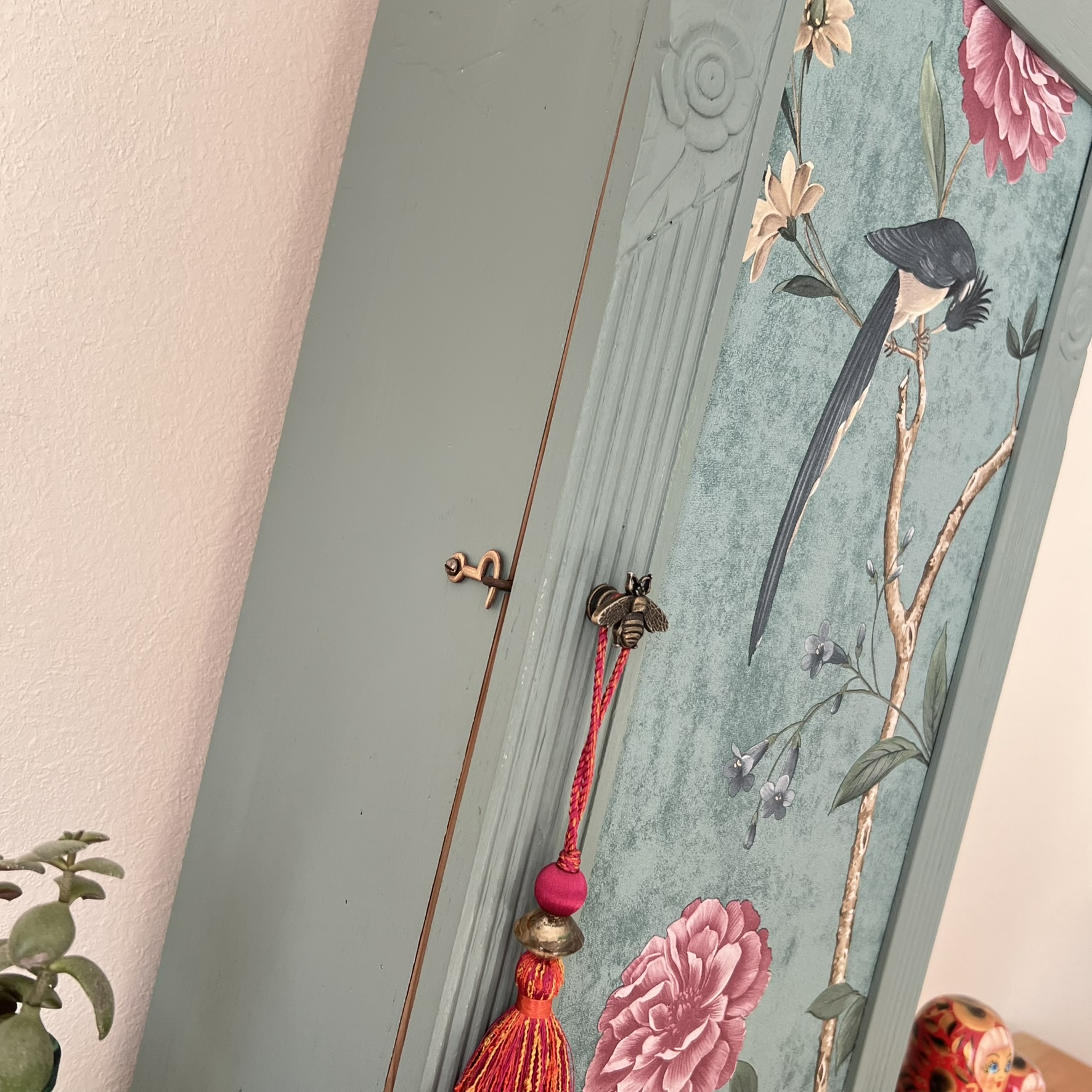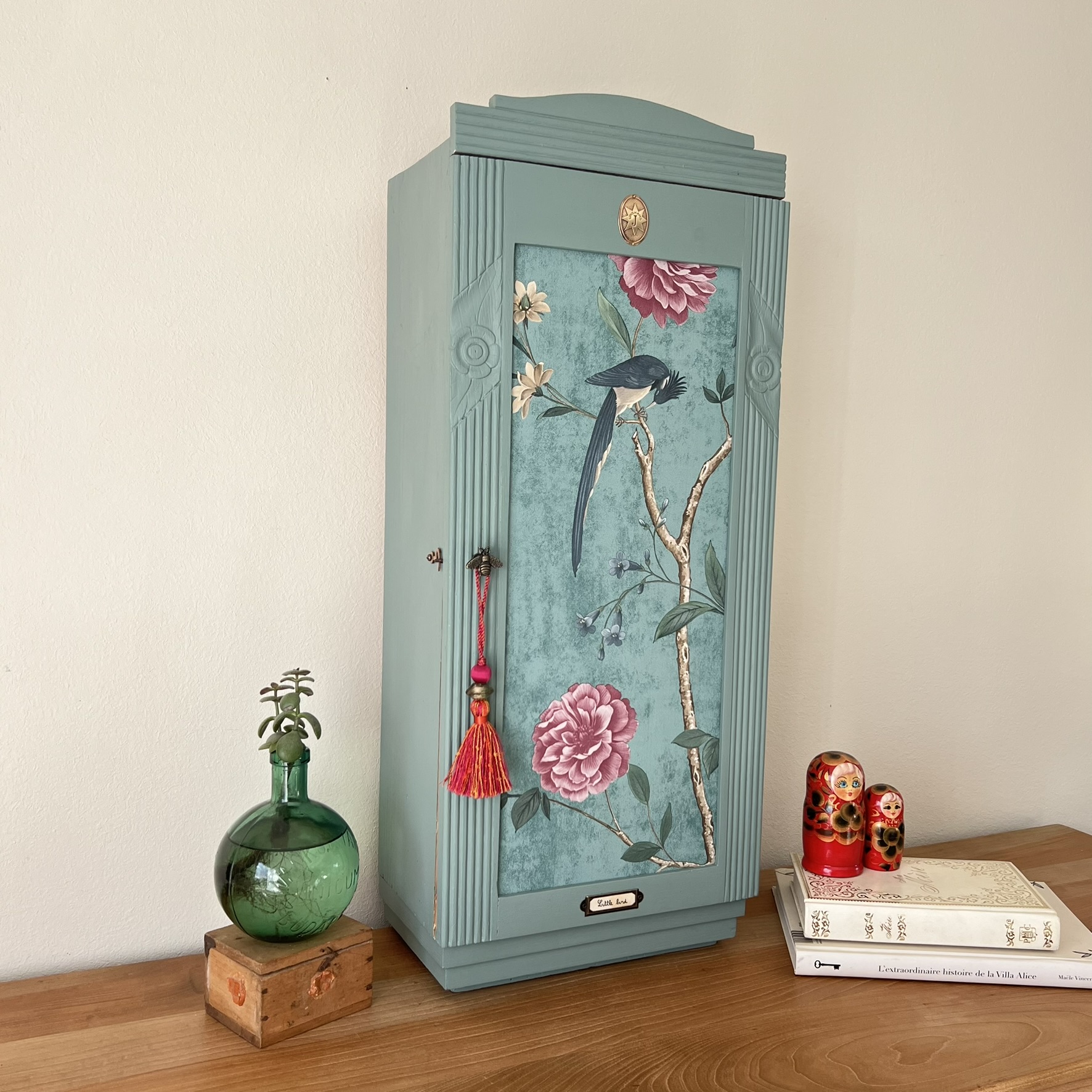 À la place de la grande vitre frontale, j’ai créé un panneau en bois, habillé à l’intérieur et à l’extérieur d’un papier peint choisi avec soin : vert d’eau, fleurs rosées, une branche, un oiseau… Un décor poétique qui se pose là, sans bruit. Sur le devant, une petite plaque ovale en laiton, marquée d’un “J”. Elle était cachée à l’intérieur de l’horloge. J’ai voulu la remettre en lumière, comme un clin d’œil à son histoire. En bas, un porte-étiquette ancien, “Little Bird”, et un bouton en laiton en forme d’abeille pour ouvrir la porte.