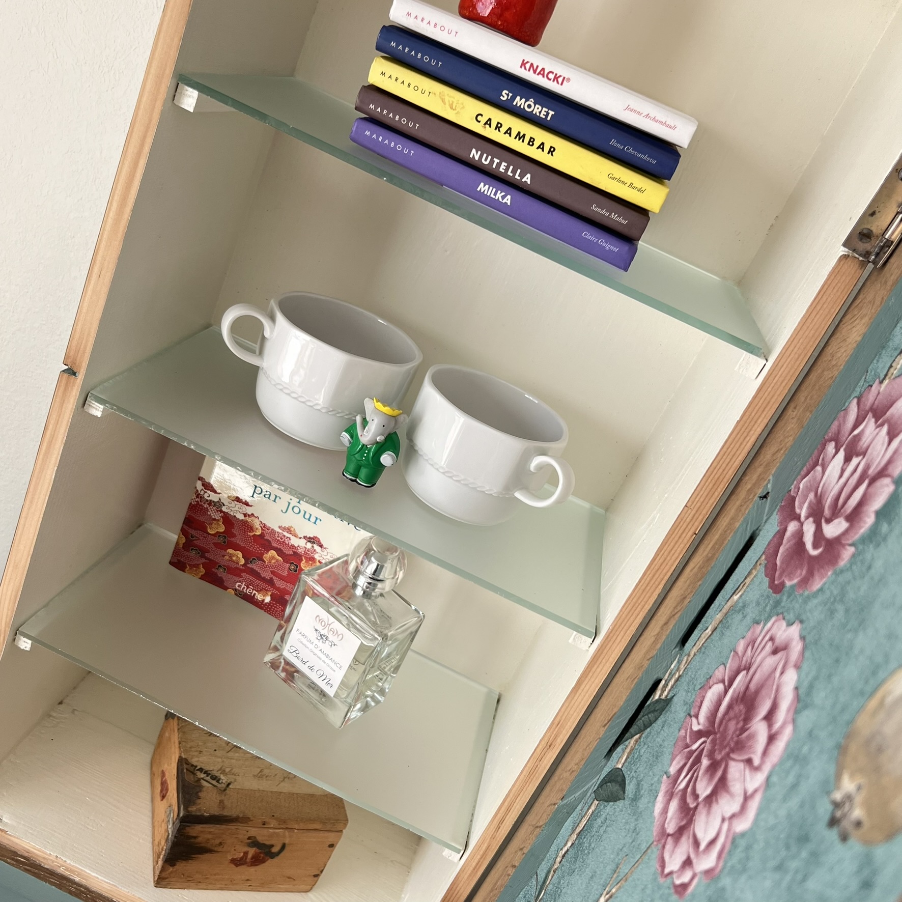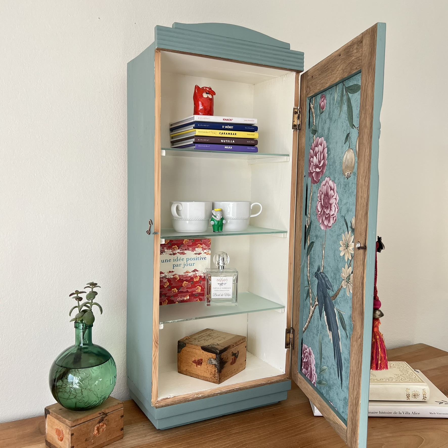 À l’intérieur, tout a été repeint en blanc pour la luminosité. Trois étagères en verre vert dépoli viennent structurer l’espace. Quand on ouvre, le même papier peint avec un oiseau prolonge la poésie.
