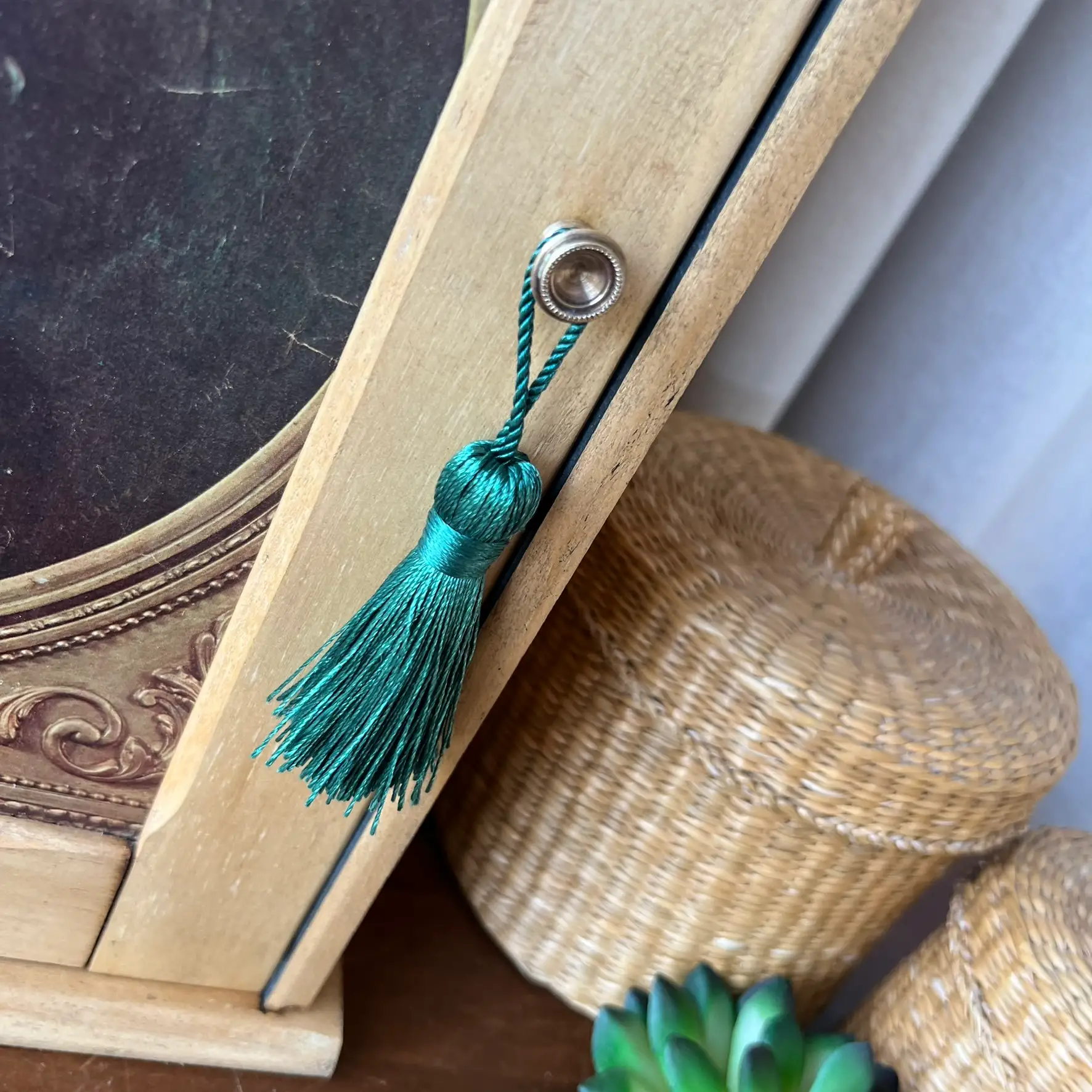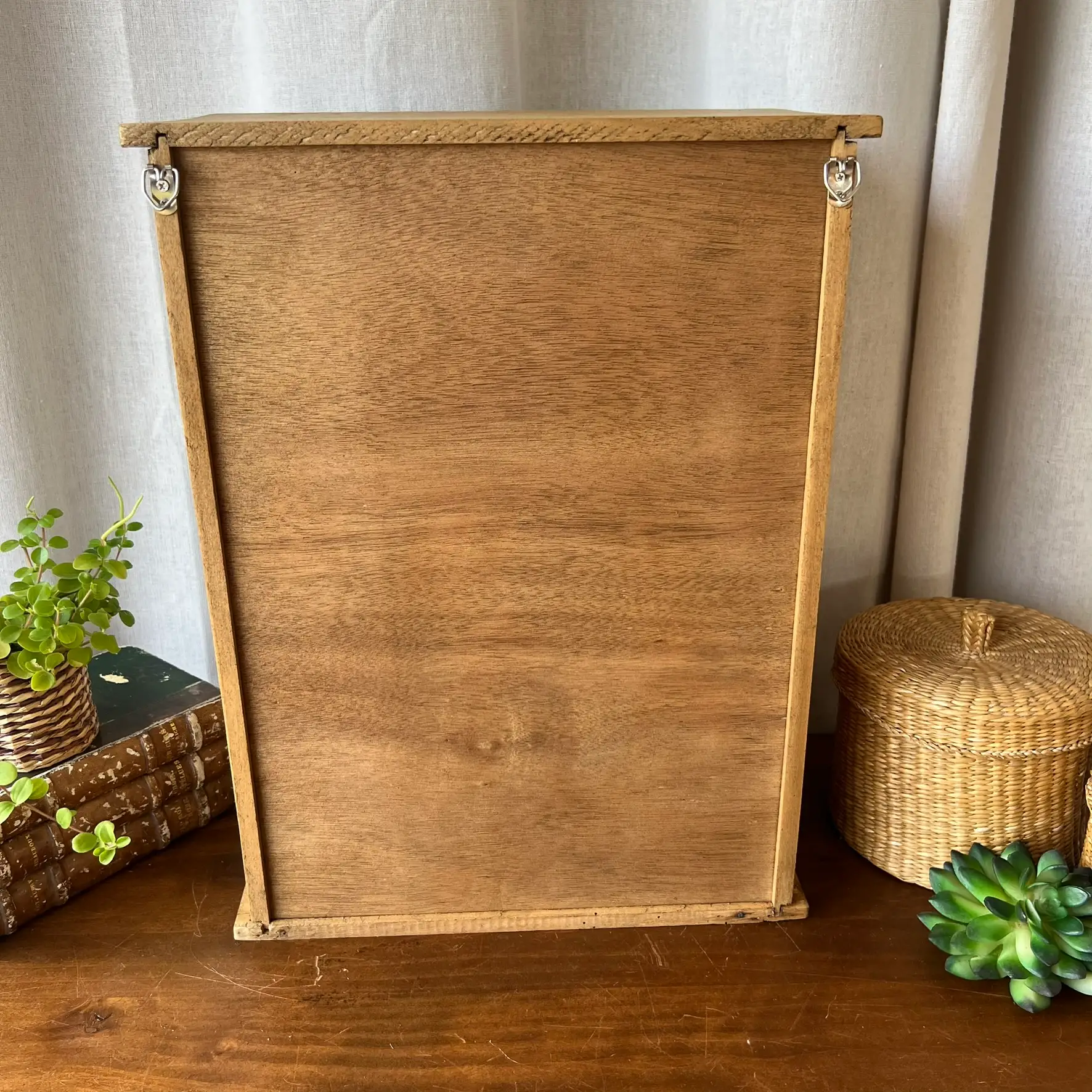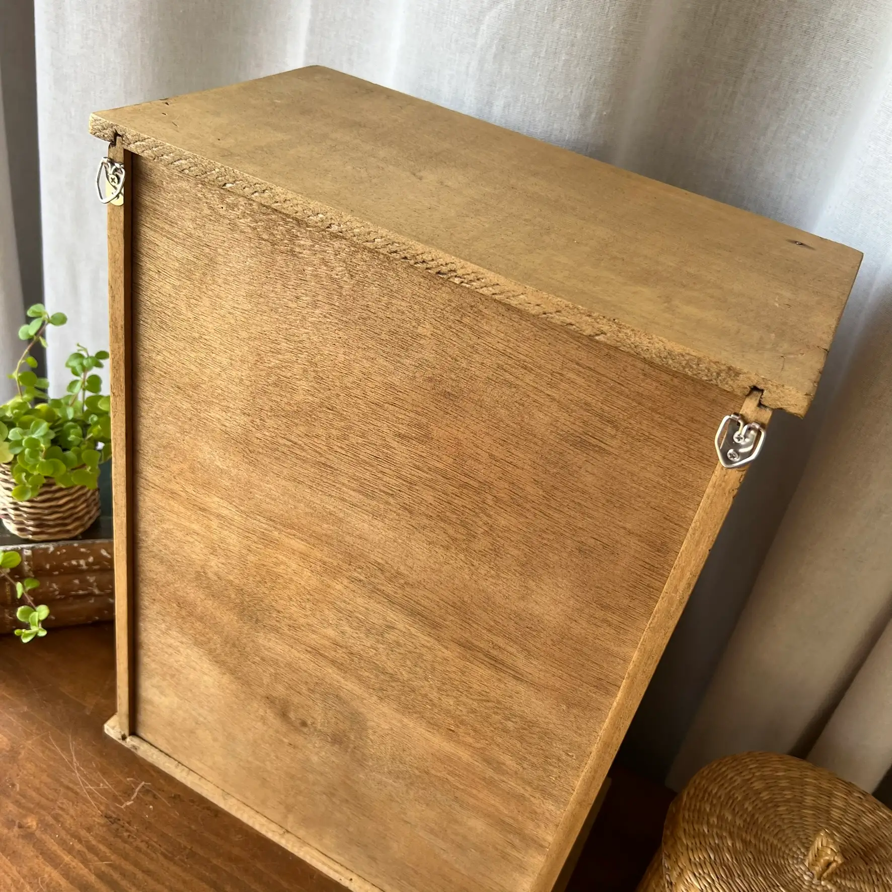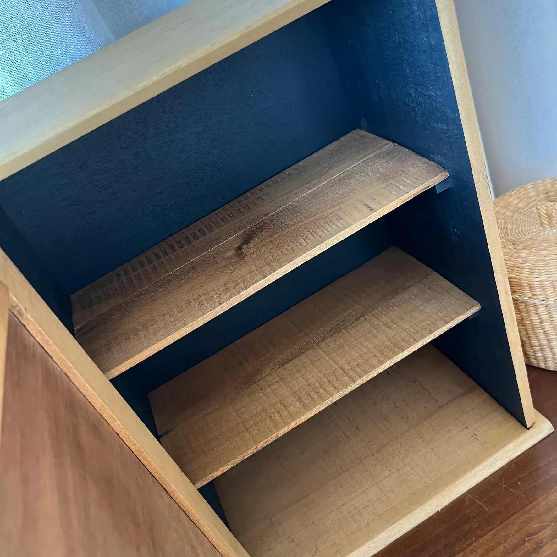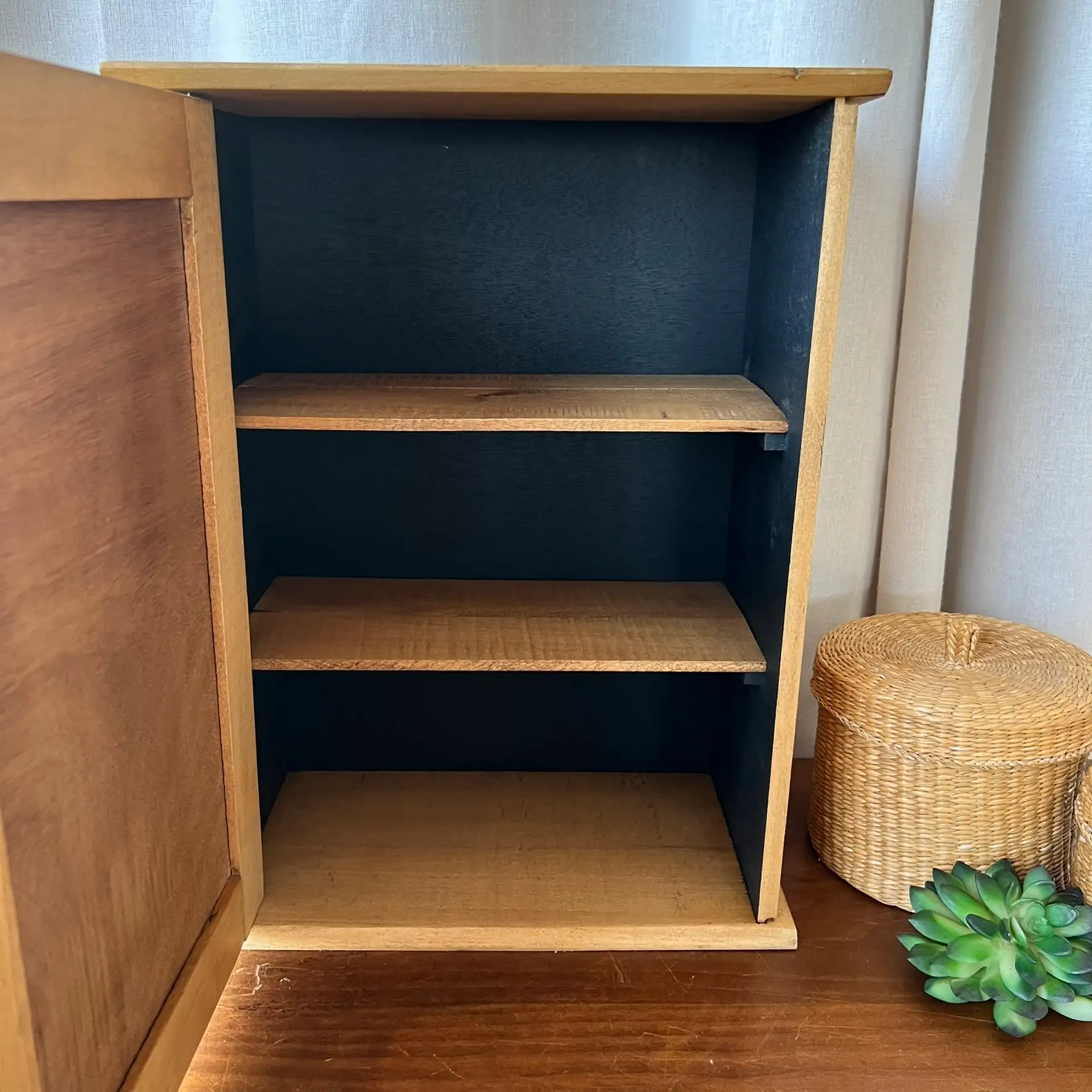 Aujourd’hui, je ne suis plus une couverture. Je suis une porte ! D’une petite armoire en bois clair, douce, patinée avec soin. Derrière moi, il y a de l’ombre… un intérieur noir profond, où l’on peut cacher ses secrets.