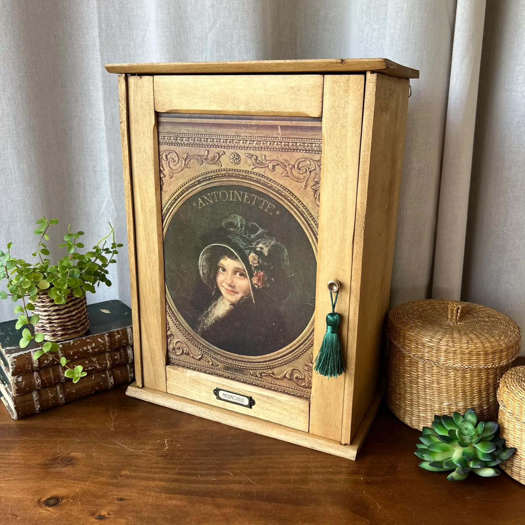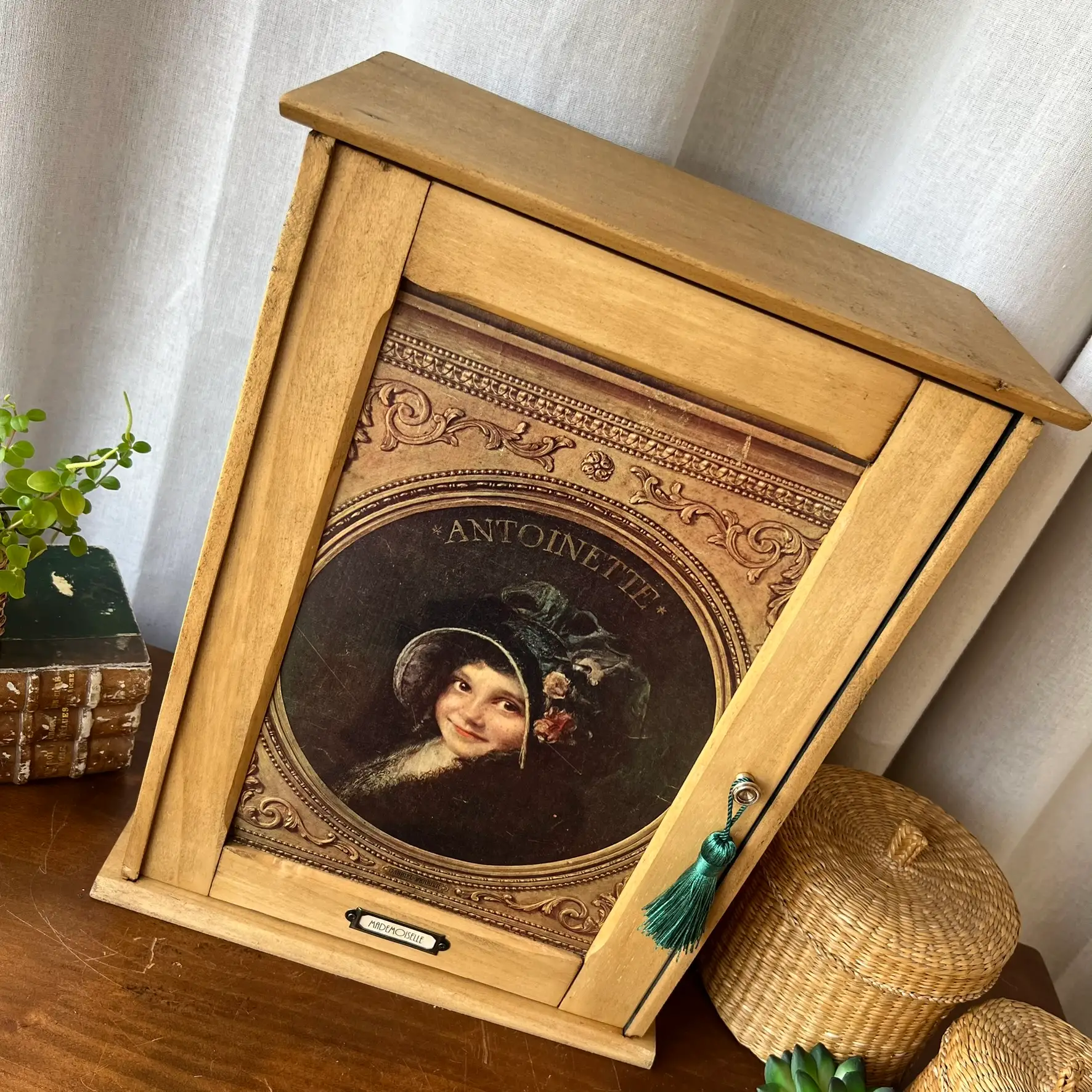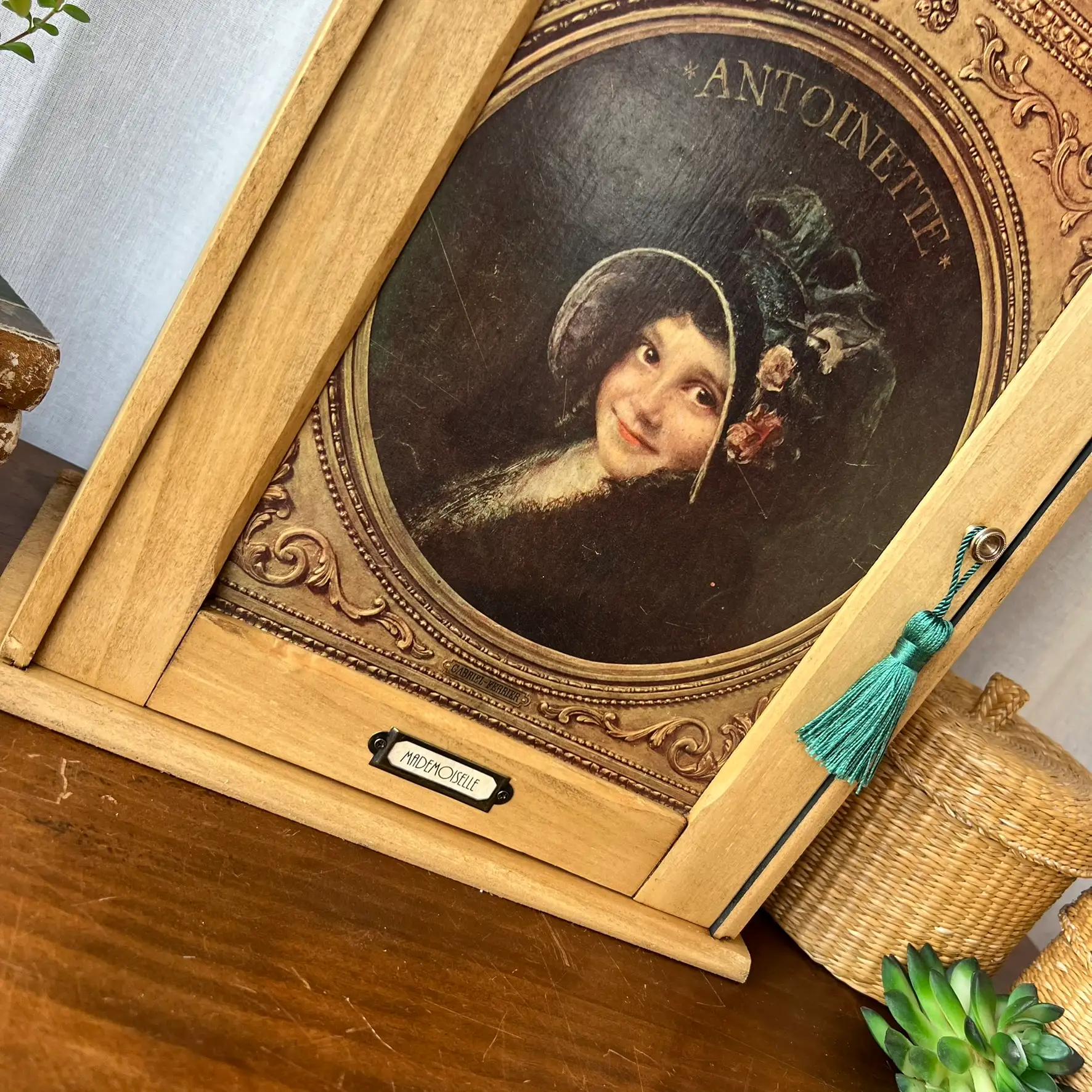 L’intérieur, lui, a été volontairement peint en noir pour créer un contraste et mettre en valeur ce que vous y déposerez. Les deux étagères d’origine ont été conservées et repositionnées. En façade, j’ai contrecollé une véritable reproduction ancienne issue du journal L’Illustration (début XXe siècle), représentant cette jeune Antoinette. Un détail qui transforme complètement l’objet et lui donne une présence unique. Le bouton en laiton de la petite porte est d’origine et j’ai ajouté un porte étiquette personnalisable à souhait. Deux accroches ont été ajoutées au dos pour une fixation murale, mais l’armoirette peut tout aussi bien être simplement posée.