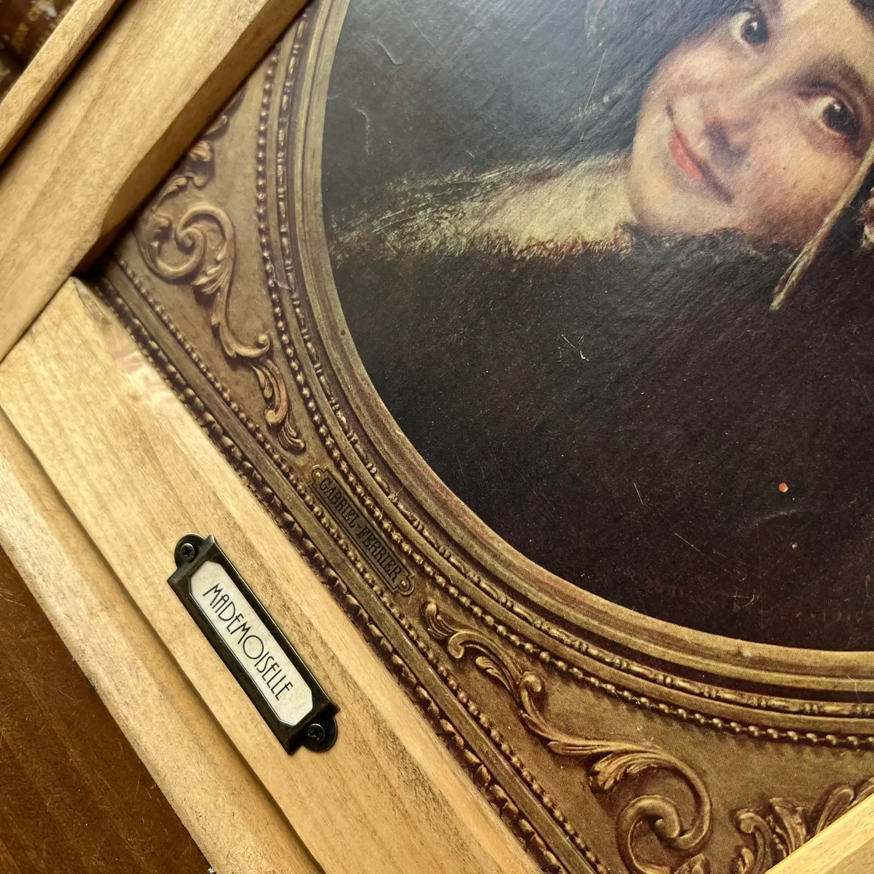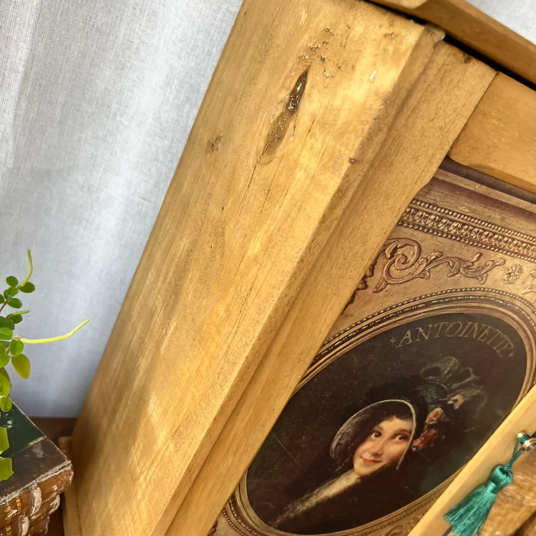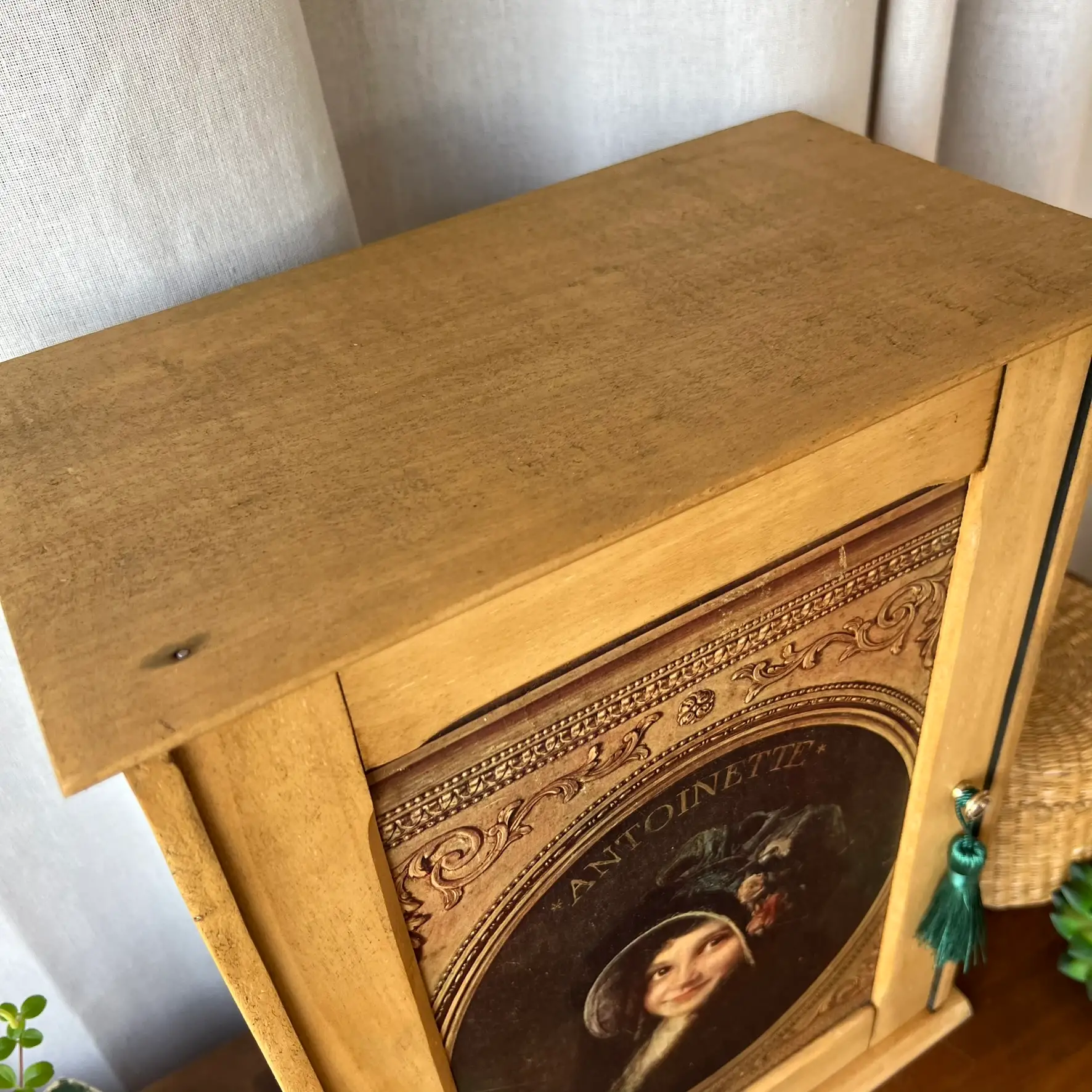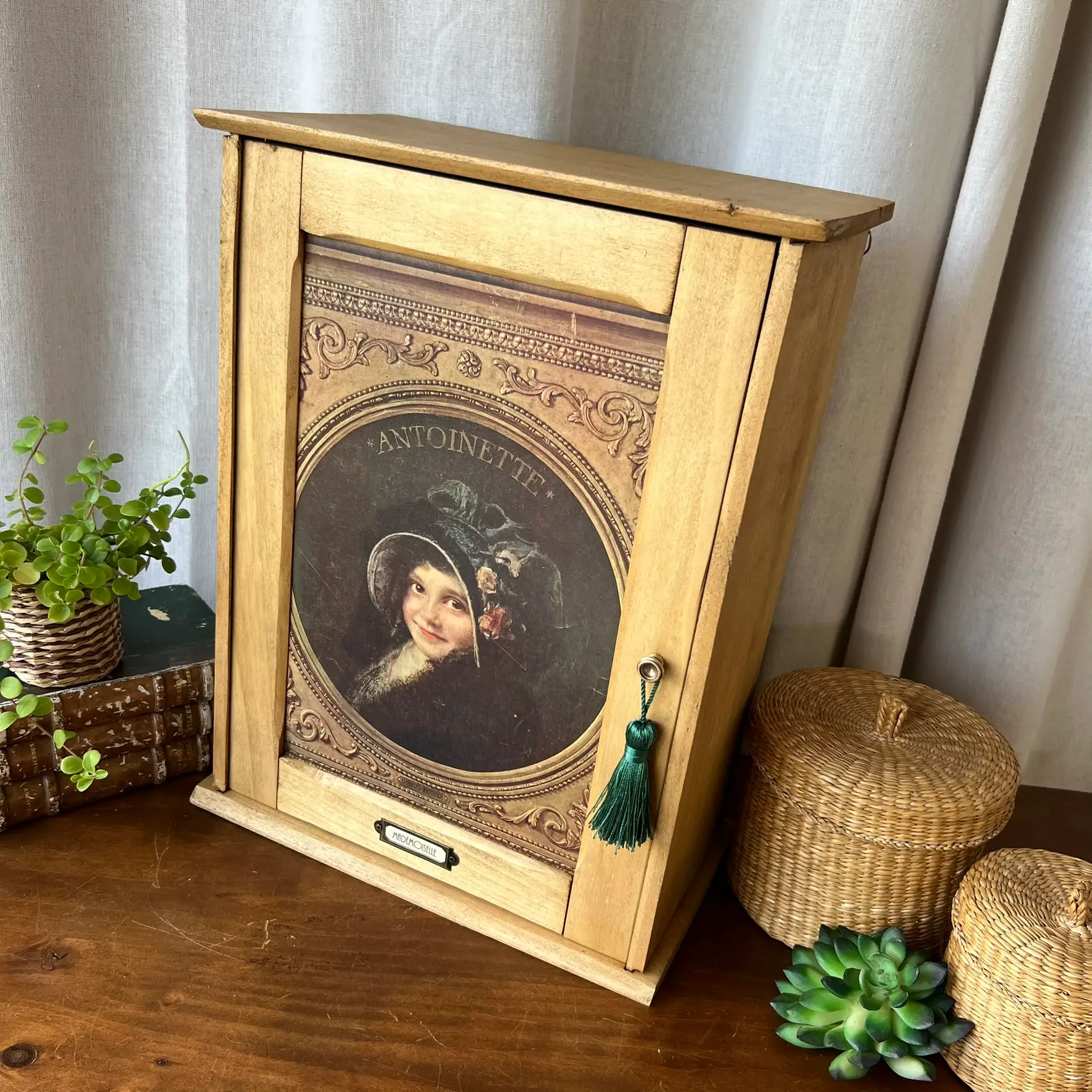 L’intérieur, lui, a été volontairement peint en noir pour créer un contraste et mettre en valeur ce que vous y déposerez. Les deux étagères d’origine ont été conservées et repositionnées. En façade, j’ai contrecollé une véritable reproduction ancienne issue du journal L’Illustration (début XXe siècle), représentant cette jeune Antoinette. Un détail qui transforme complètement l’objet et lui donne une présence unique. Le bouton en laiton de la petite porte est d’origine et j’ai ajouté un porte étiquette personnalisable à souhait. Deux accroches ont été ajoutées au dos pour une fixation murale, mais l’armoirette peut tout aussi bien être simplement posée.