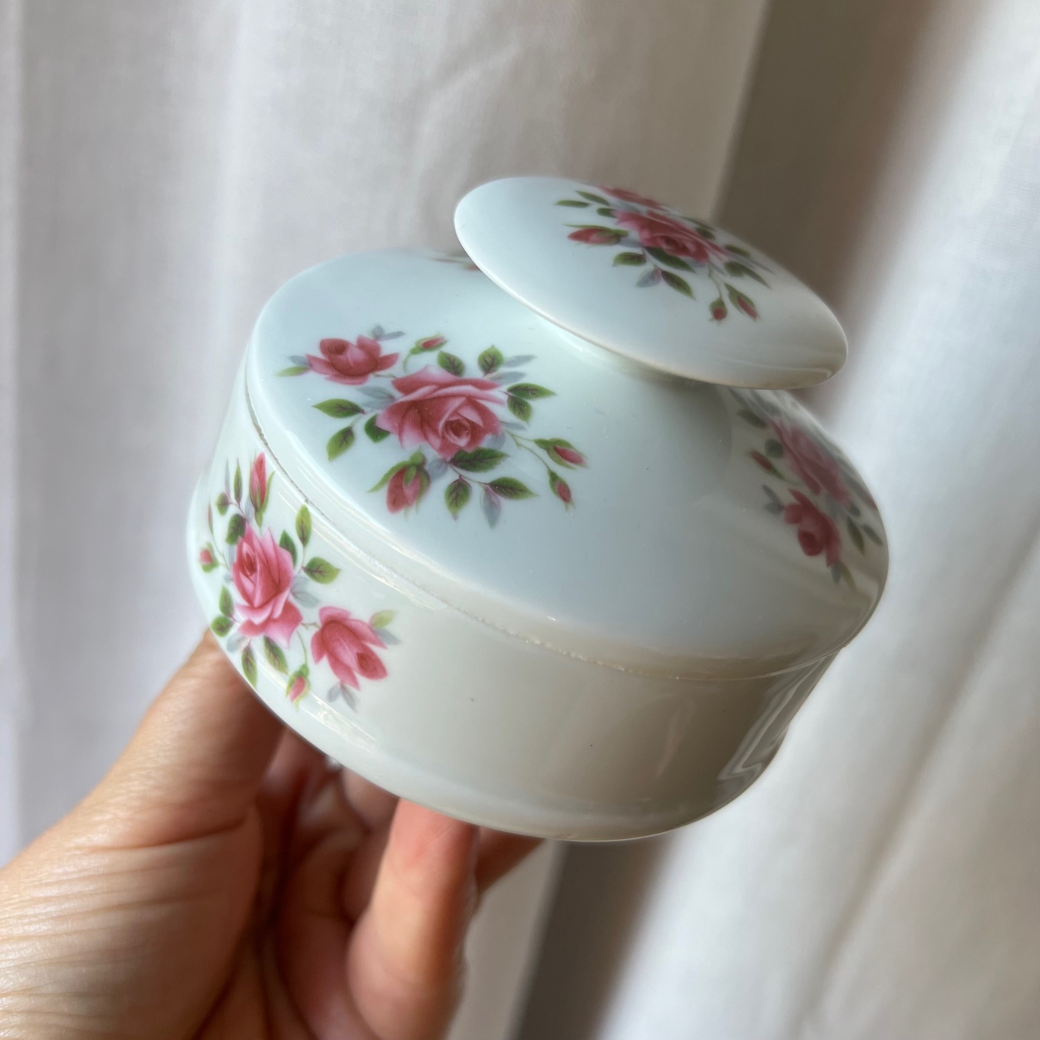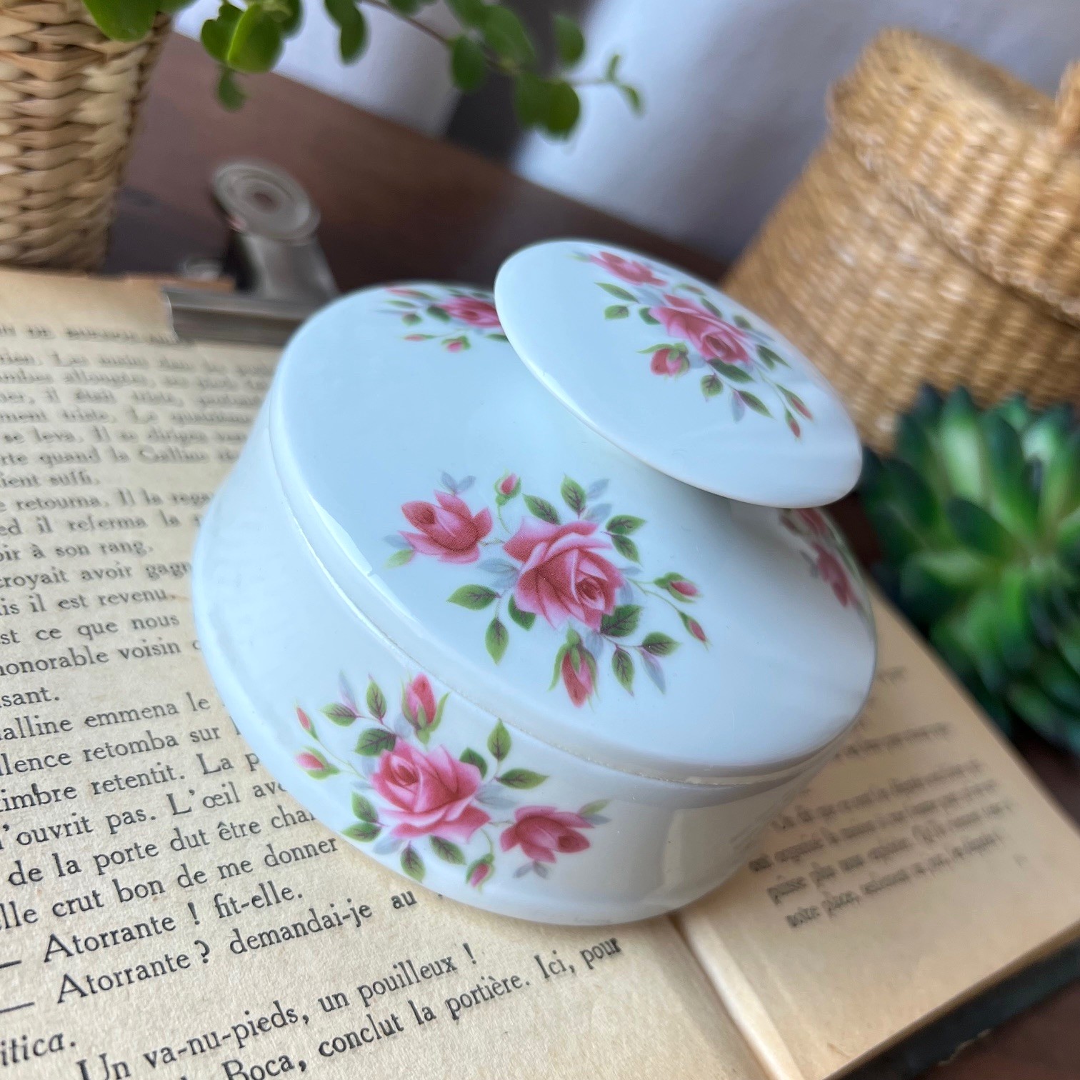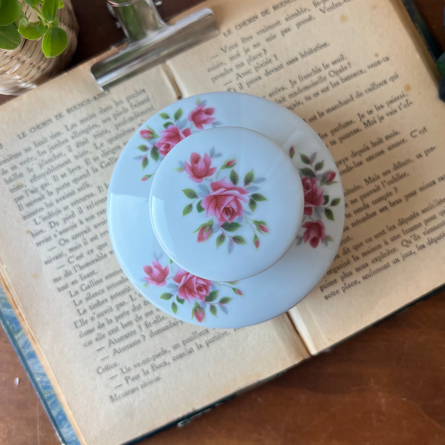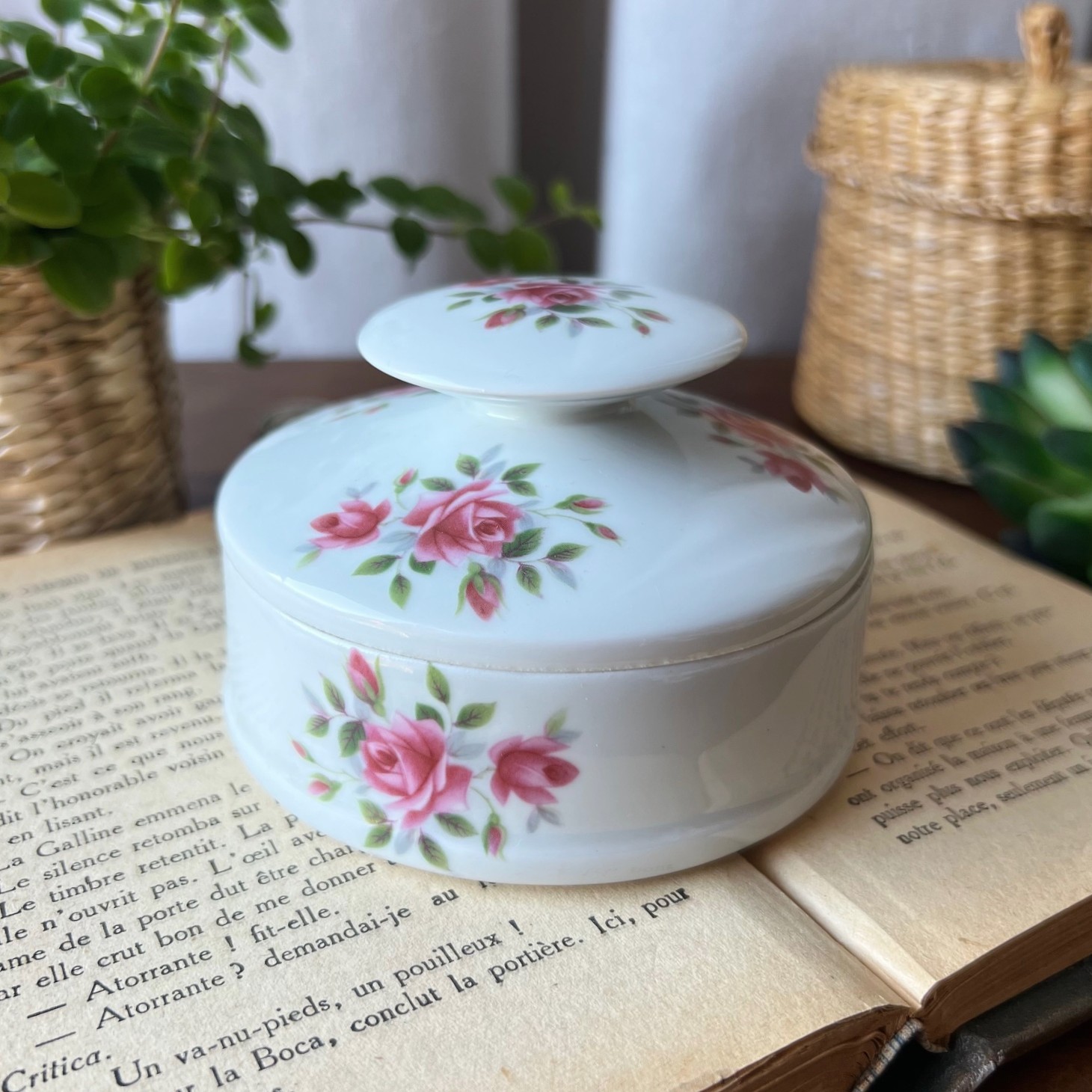 Élégante petite boîte en porcelaine blanche, délicatement décorée de roses peintes avec raffinement. Son estampille « Limoges » garantit la qualité et le savoir-faire d’une grande tradition porcelainière française.