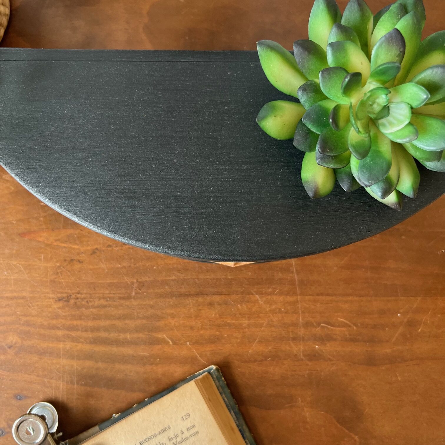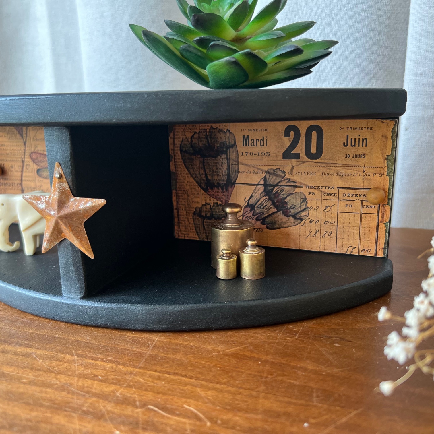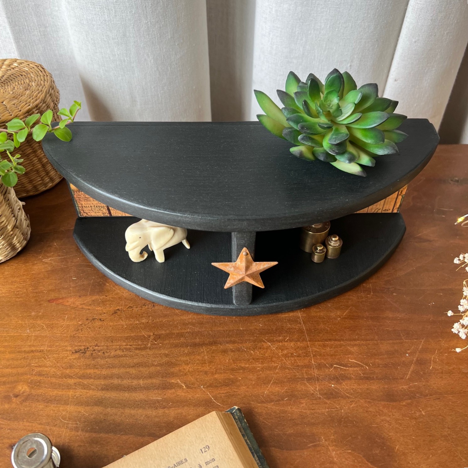 Cette mini étagère murale en bois, en forme de demi-lune, séduit par sa silhouette originale et son charme singulier. Patinée en noir, elle joue la carte de la sobriété raffinée, tandis que son fond tapissé d’un papier vieilli dévoile un univers rétro.
