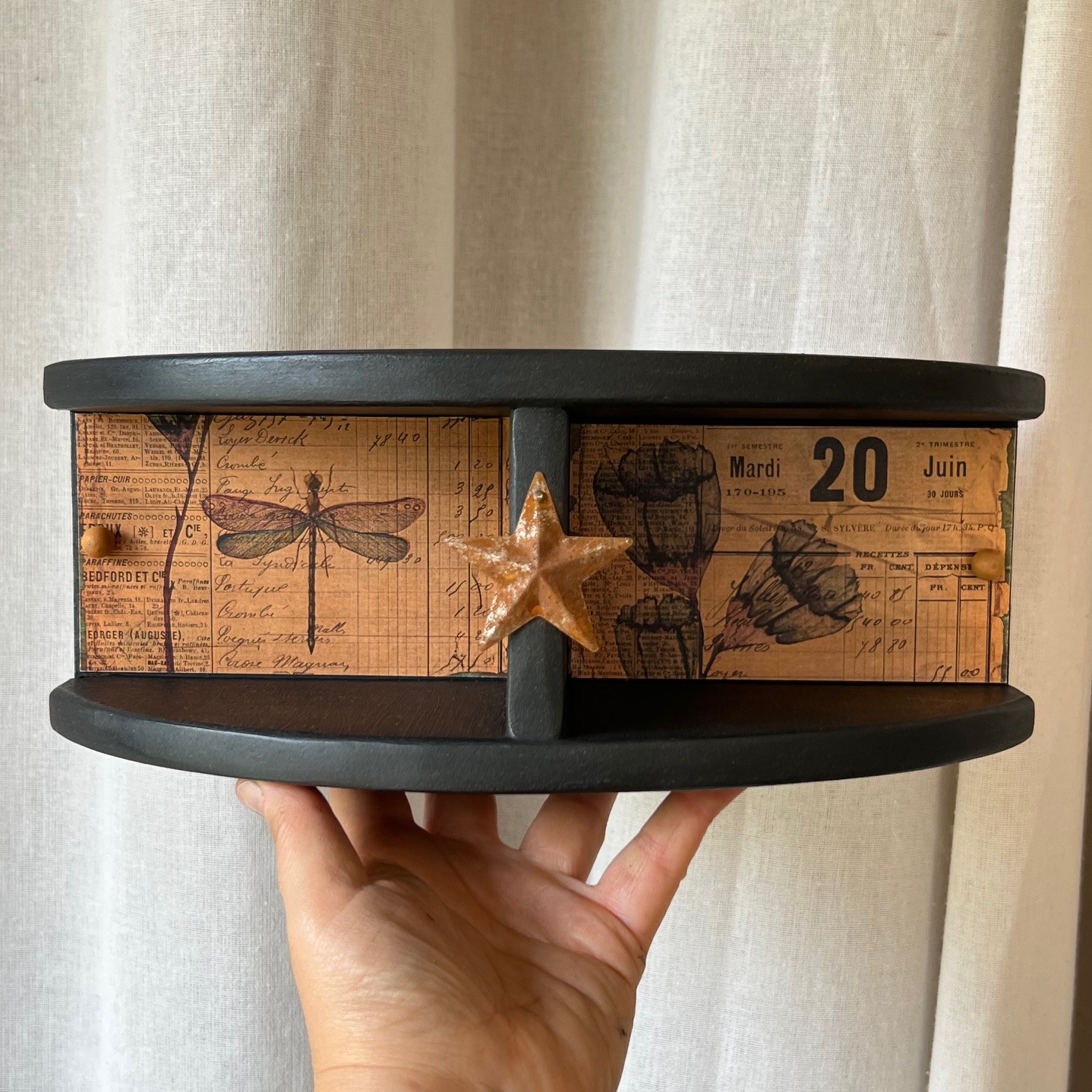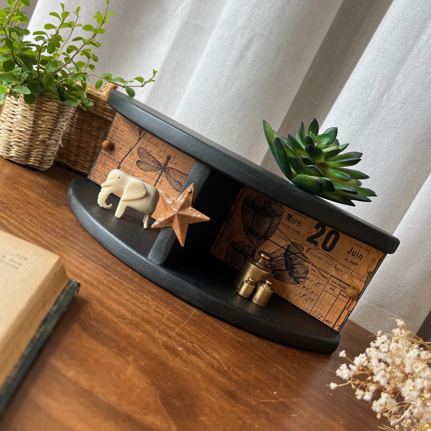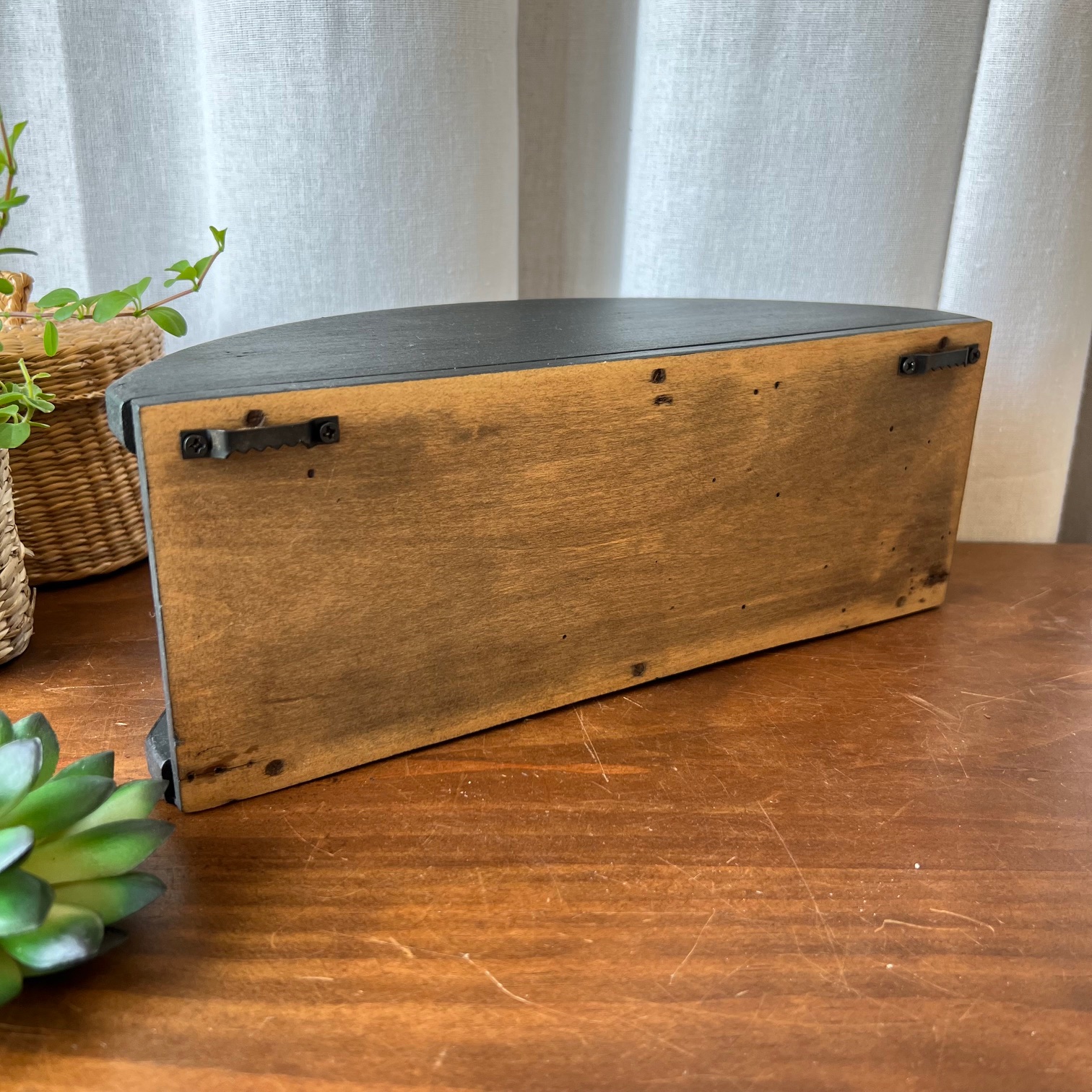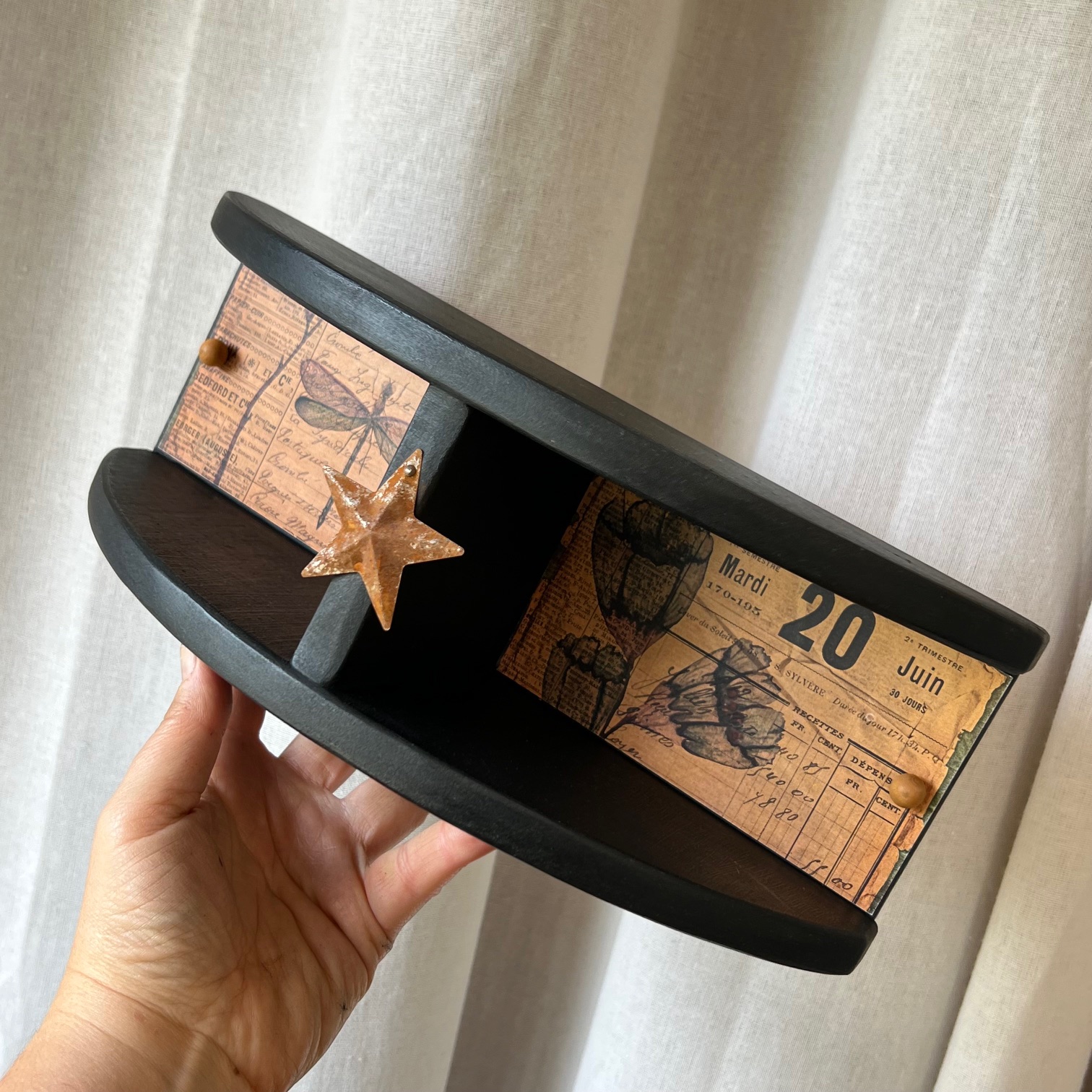 Cette mini étagère murale en bois, en forme de demi-lune, séduit par sa silhouette originale et son charme singulier. Patinée en noir, elle joue la carte de la sobriété raffinée, tandis que son fond tapissé d’un papier vieilli dévoile un univers rétro.
