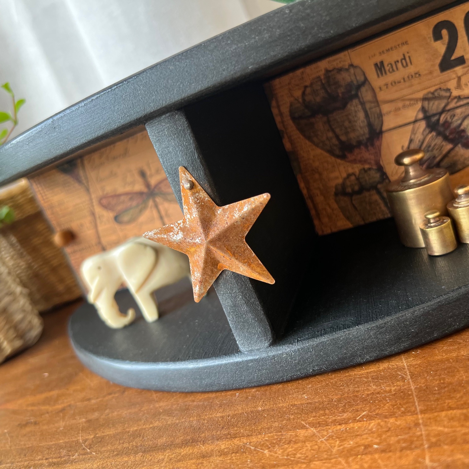 À l’avant, une étoile en métal apporte une note poétique et décalée, clin d’œil décoratif qui capte le regard. Ses deux accroches au dos la rendent simple à installer (mais vous pouvez aussi juste la poser), prête à accueillir vos petits trésors, bibelots ou souvenirs.