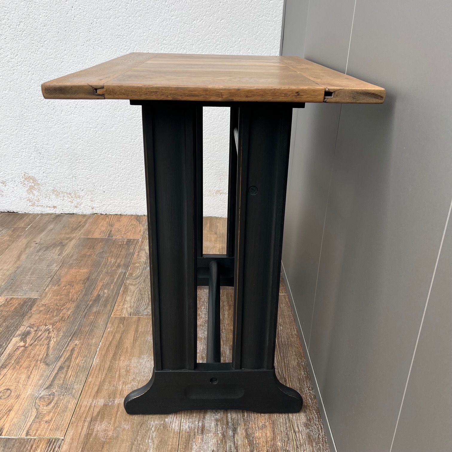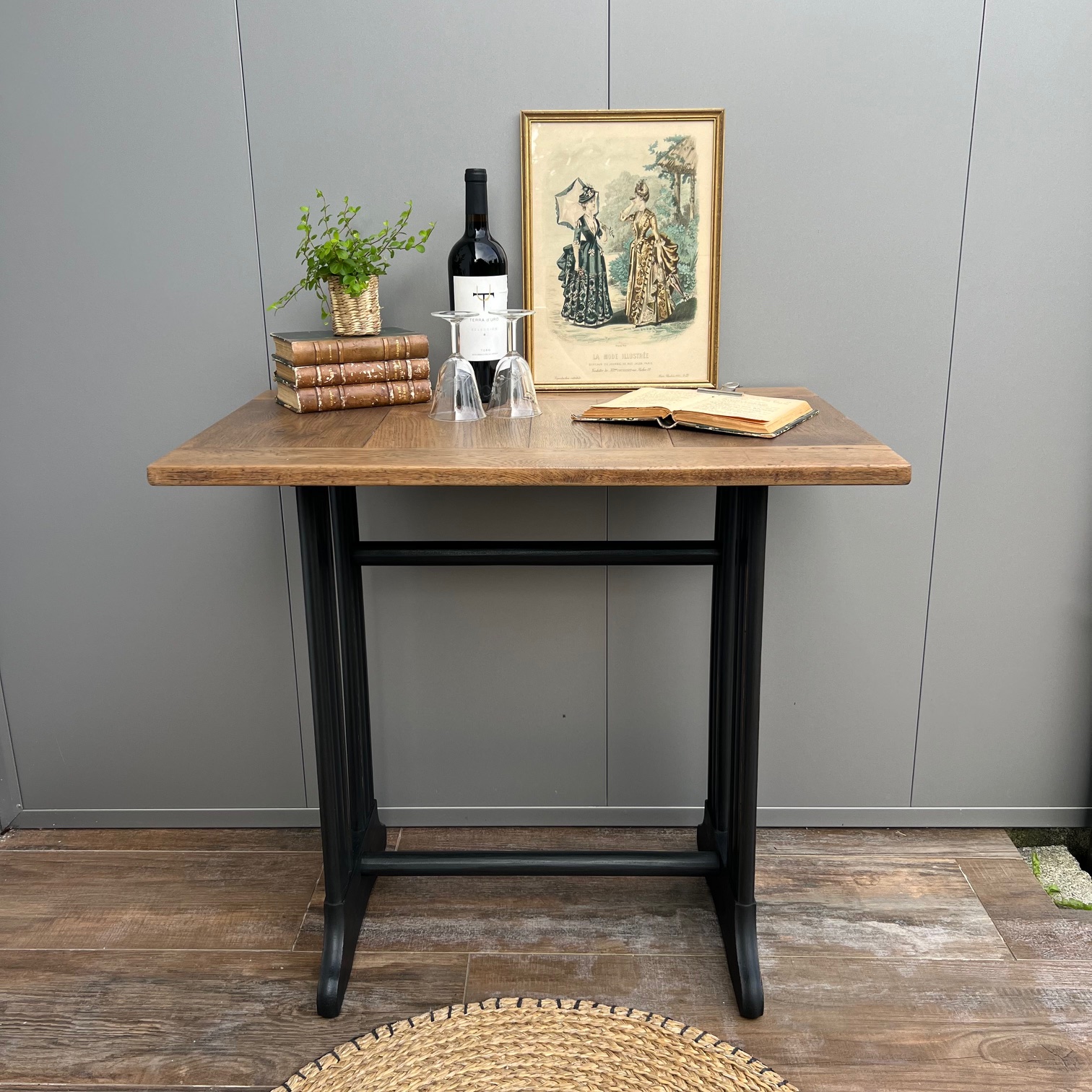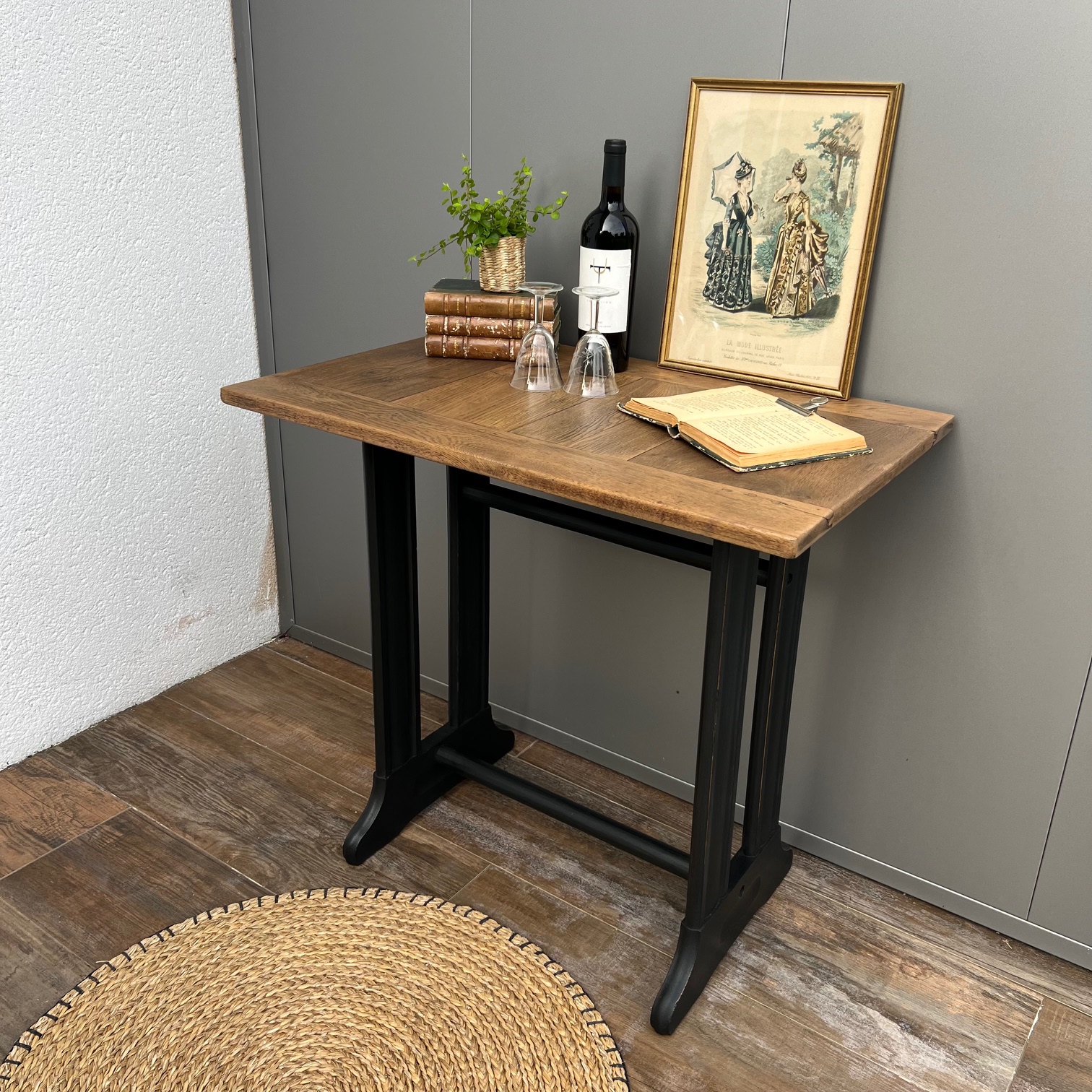 Il était une fois une machine à coudre, dont le piétement portait encore la mémoire des gestes patients. Sa patine noircie, volontairement usée sur les arêtes, laissait apparaître le bois, comme pour rappeler qu’il y a toujours une lumière sous l’ombre, un éclat sous le travail du temps.