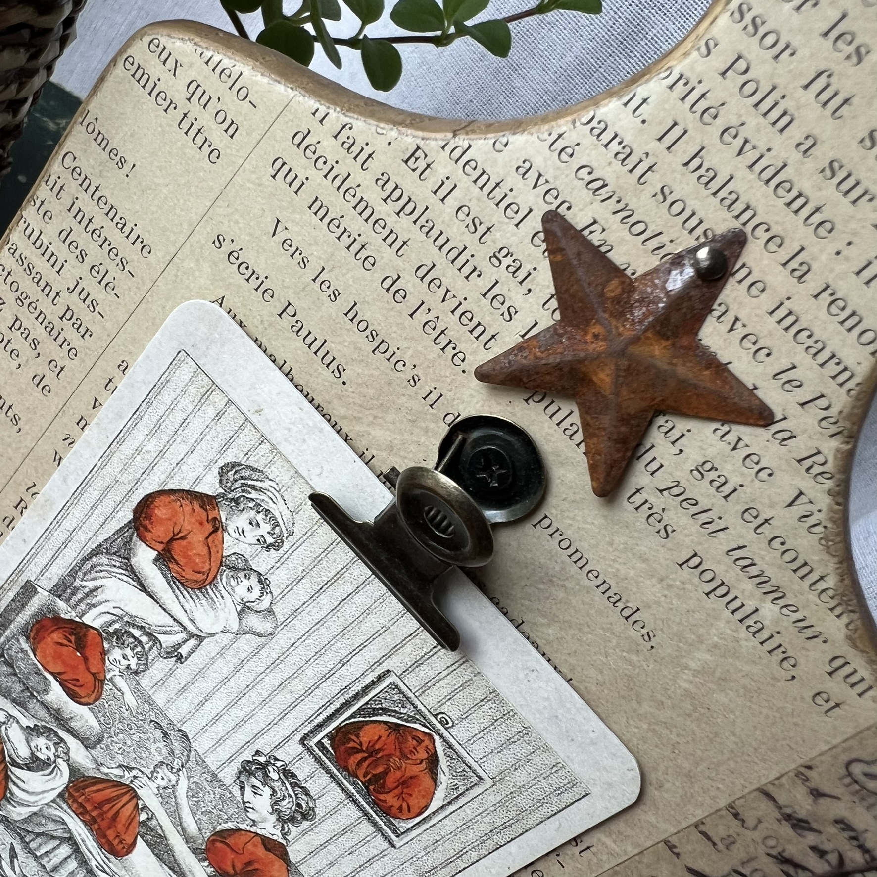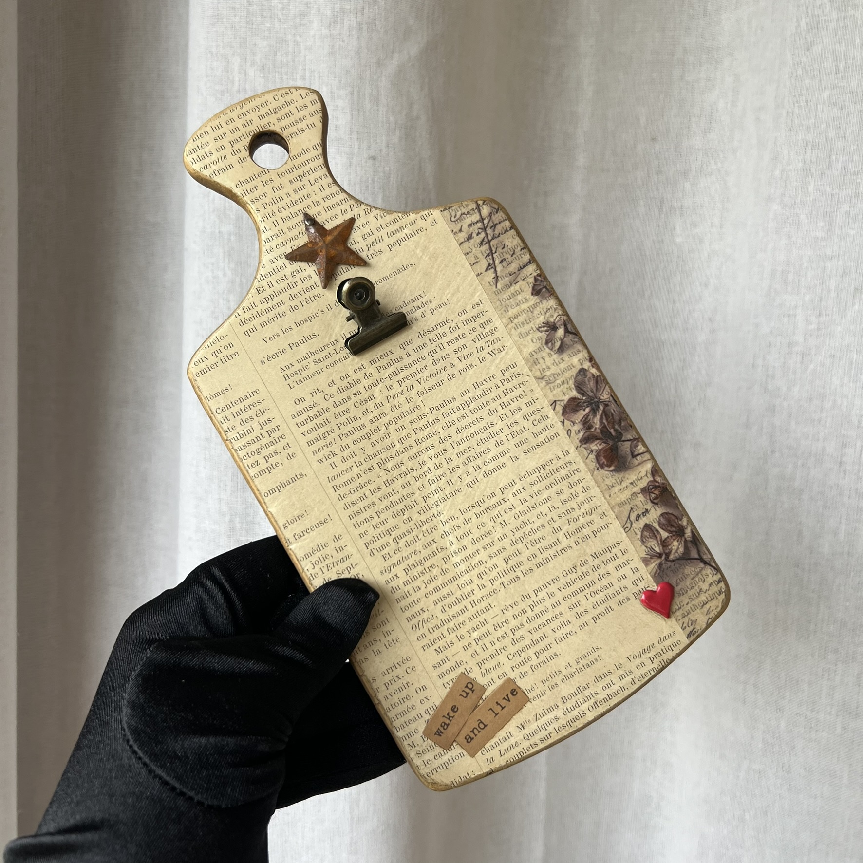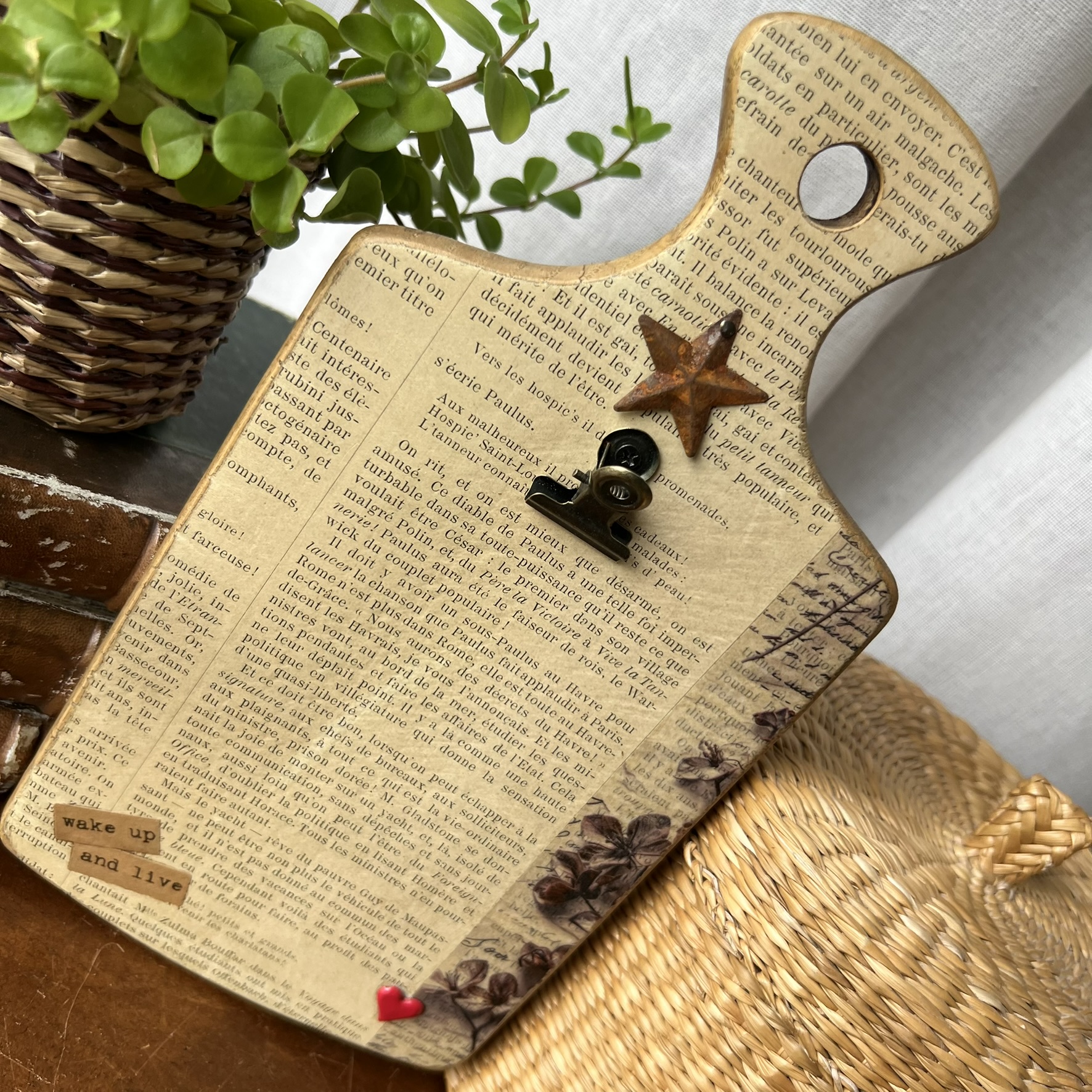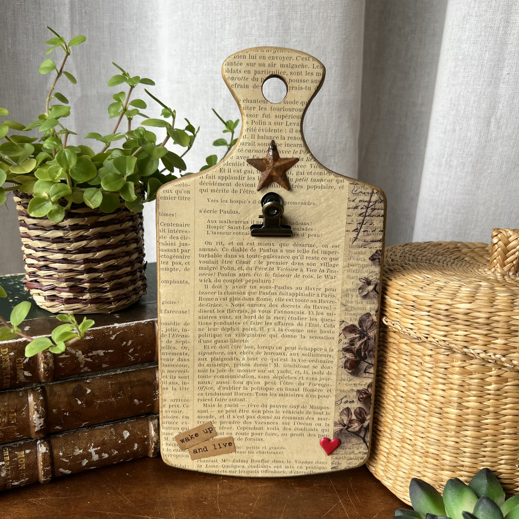 Quelques éléments décoratifs viennent ensuite raconter une nouvelle histoire : détails floraux, mots positifs, petite étoile métallique et pince ancienne permettant d’accueillir une photo, une carte postale, une liste ou un mot doux.