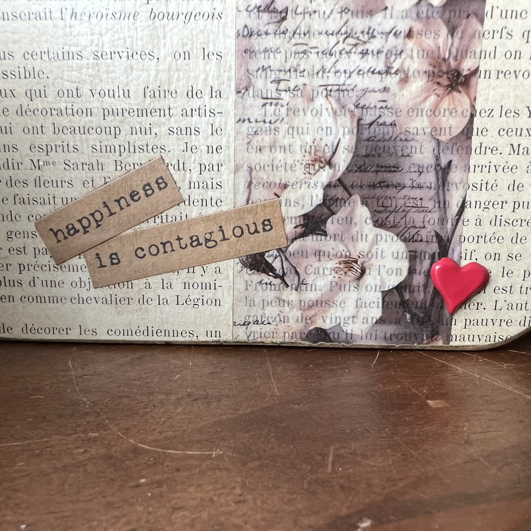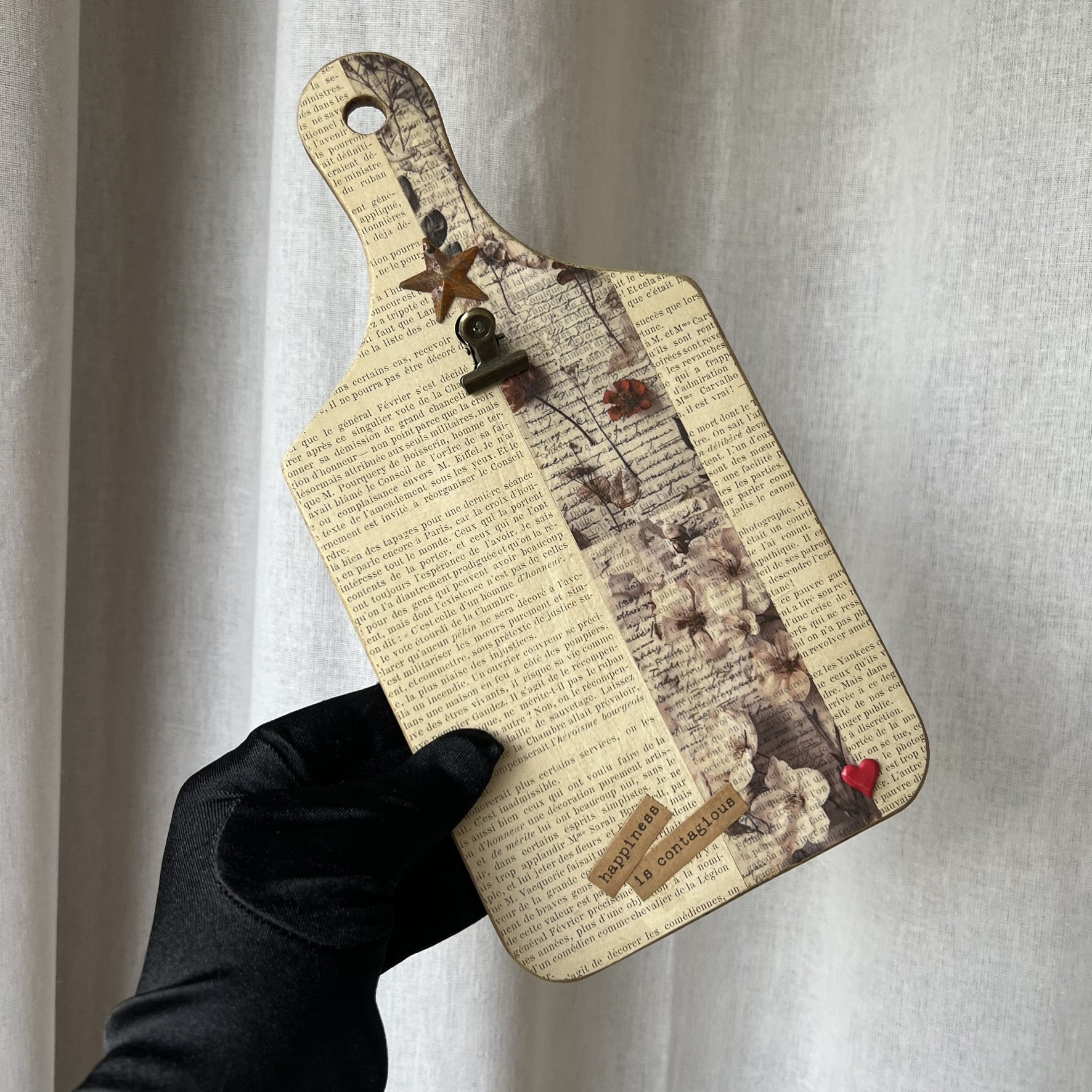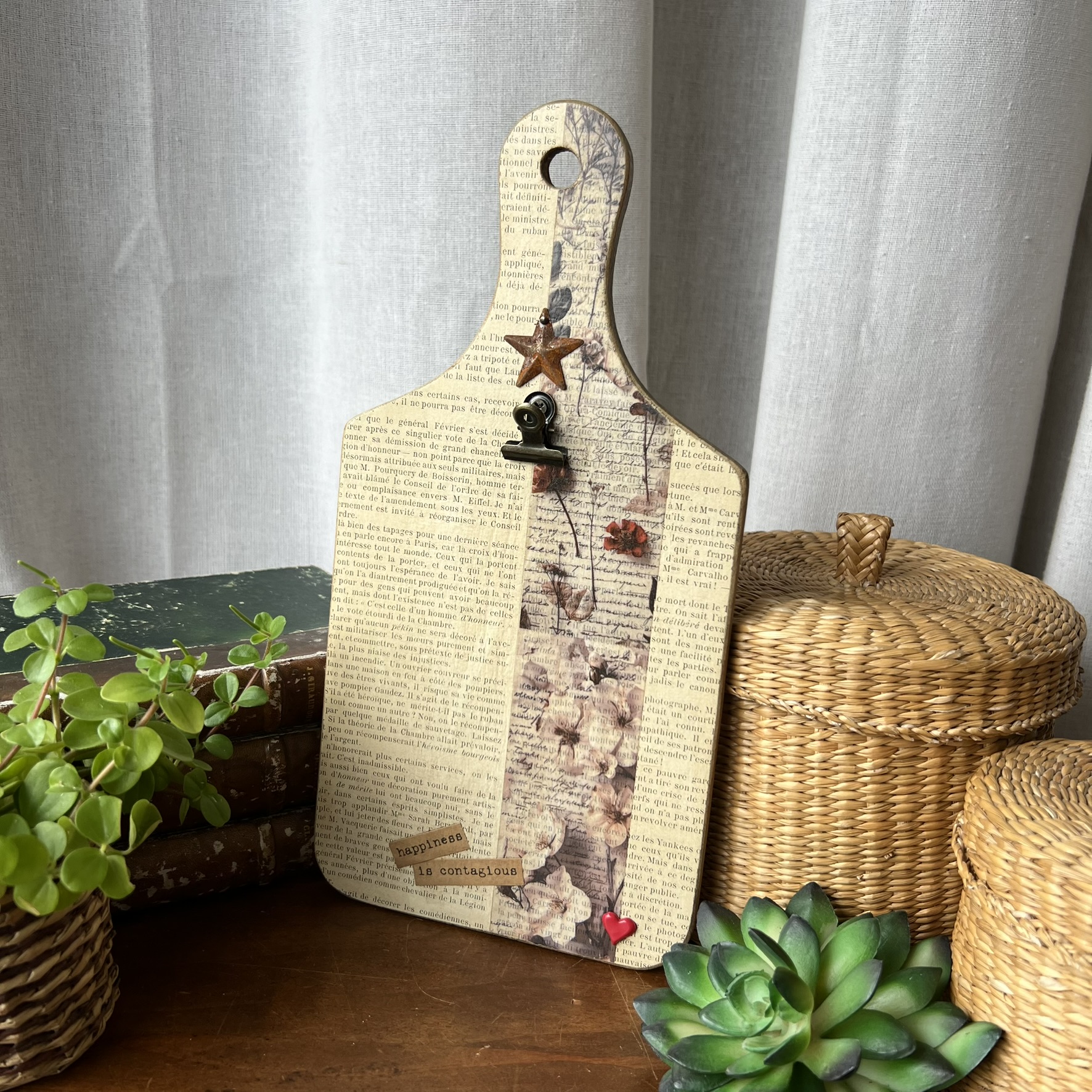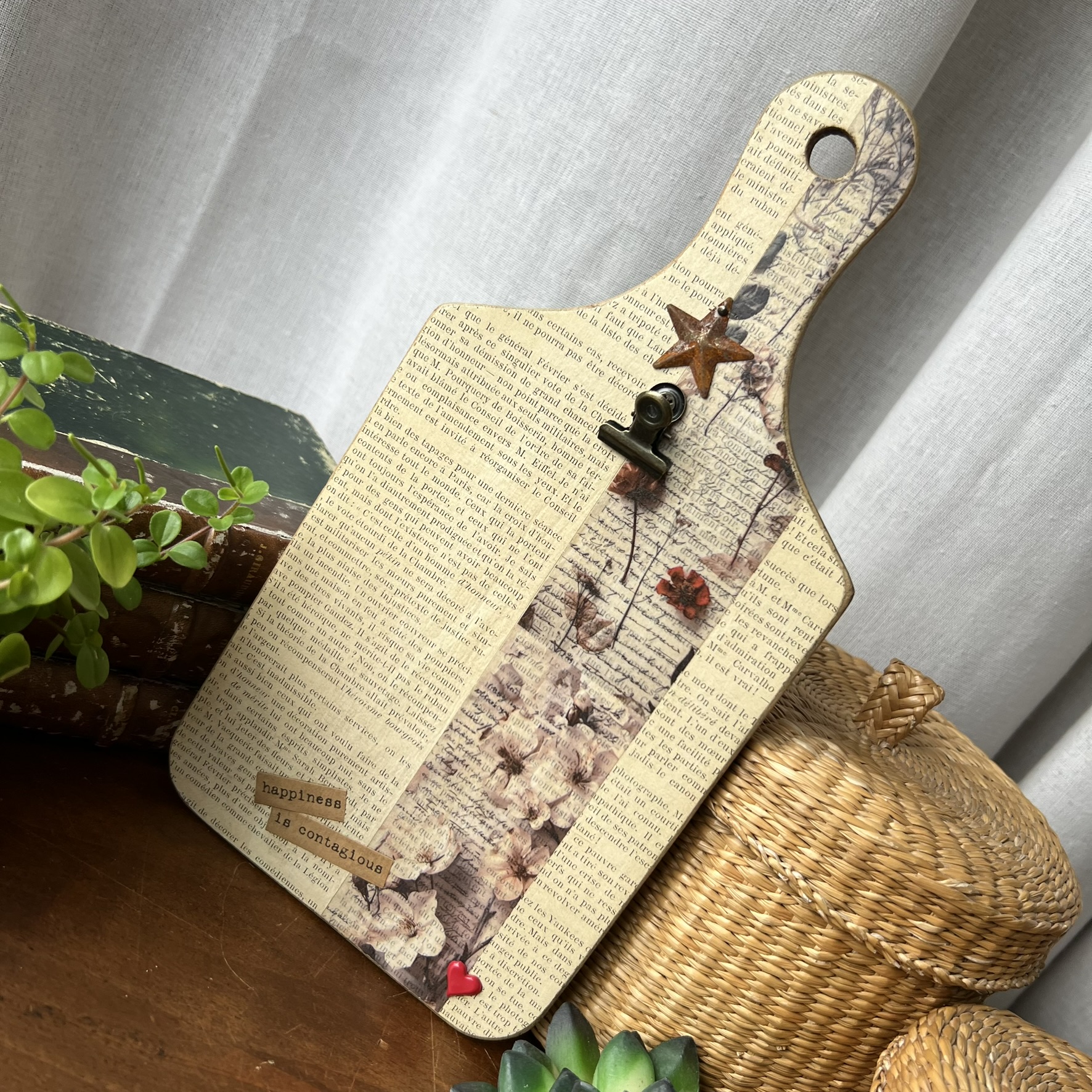 Quelques éléments décoratifs viennent ensuite raconter une nouvelle histoire : détails floraux, mots positifs, petite étoile métallique et pince ancienne permettant d’accueillir une photo, une carte postale, une liste ou un mot doux.