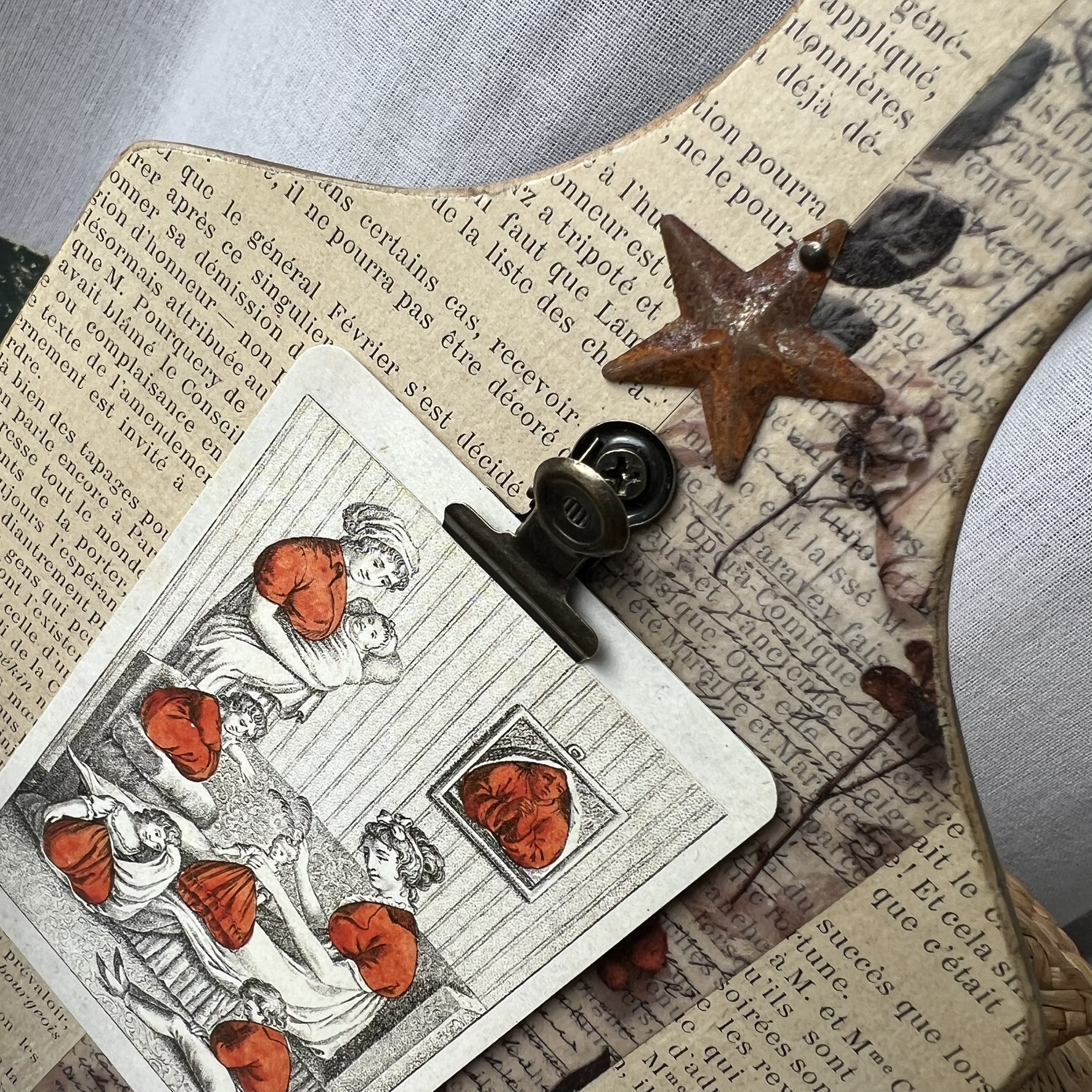 Sur sa face avant, une page originale du journal « L’Illustration » de la fin du XIXᵉ siècle a été contrecollée, apportant une véritable empreinte historique à l’objet.