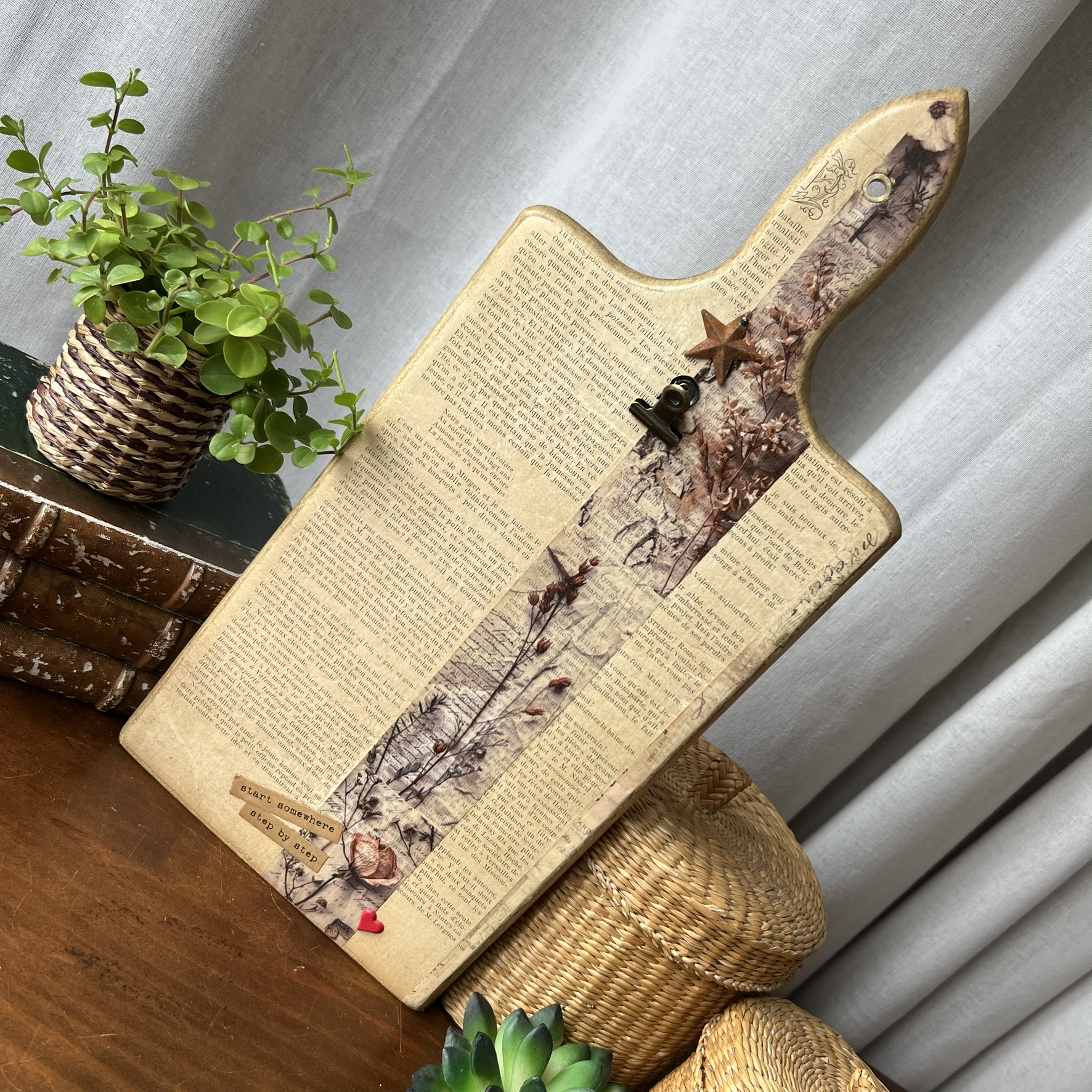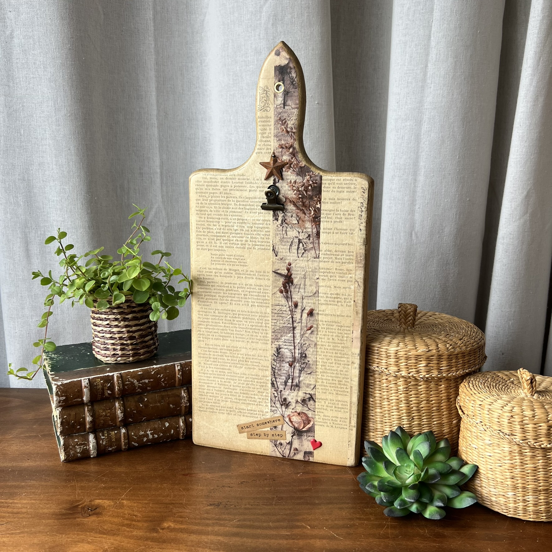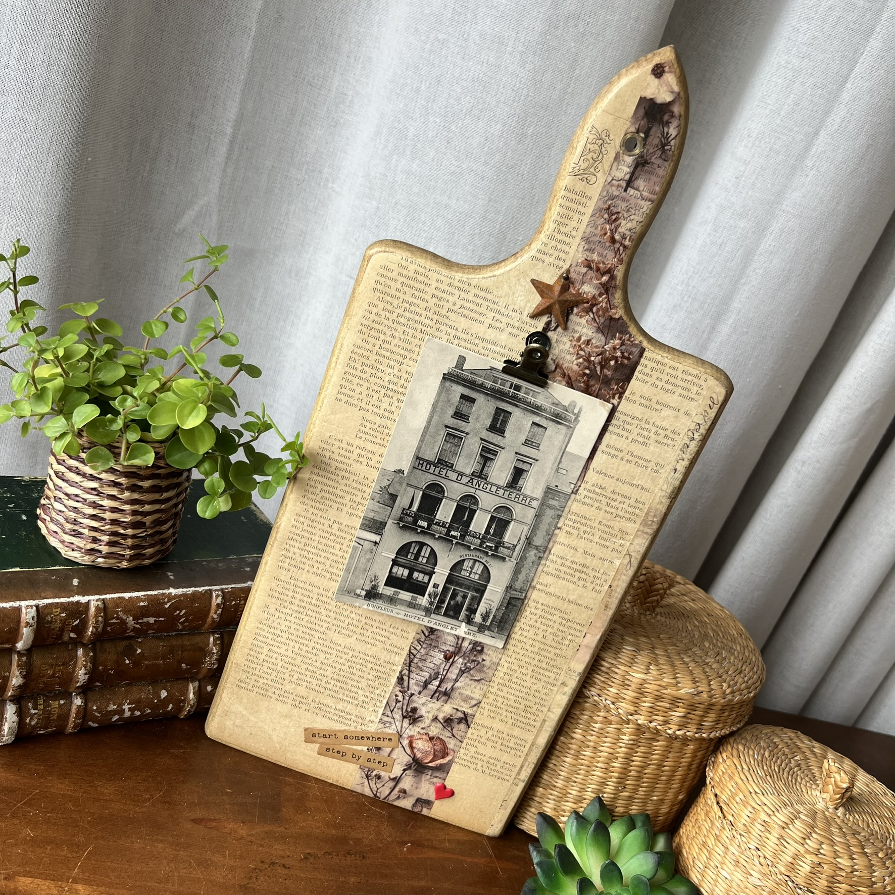 Quelques éléments décoratifs viennent ensuite raconter une nouvelle histoire : détails floraux, mots positifs, petite étoile métallique et pince ancienne permettant d’accueillir une photo, une carte postale, une liste ou un mot doux.