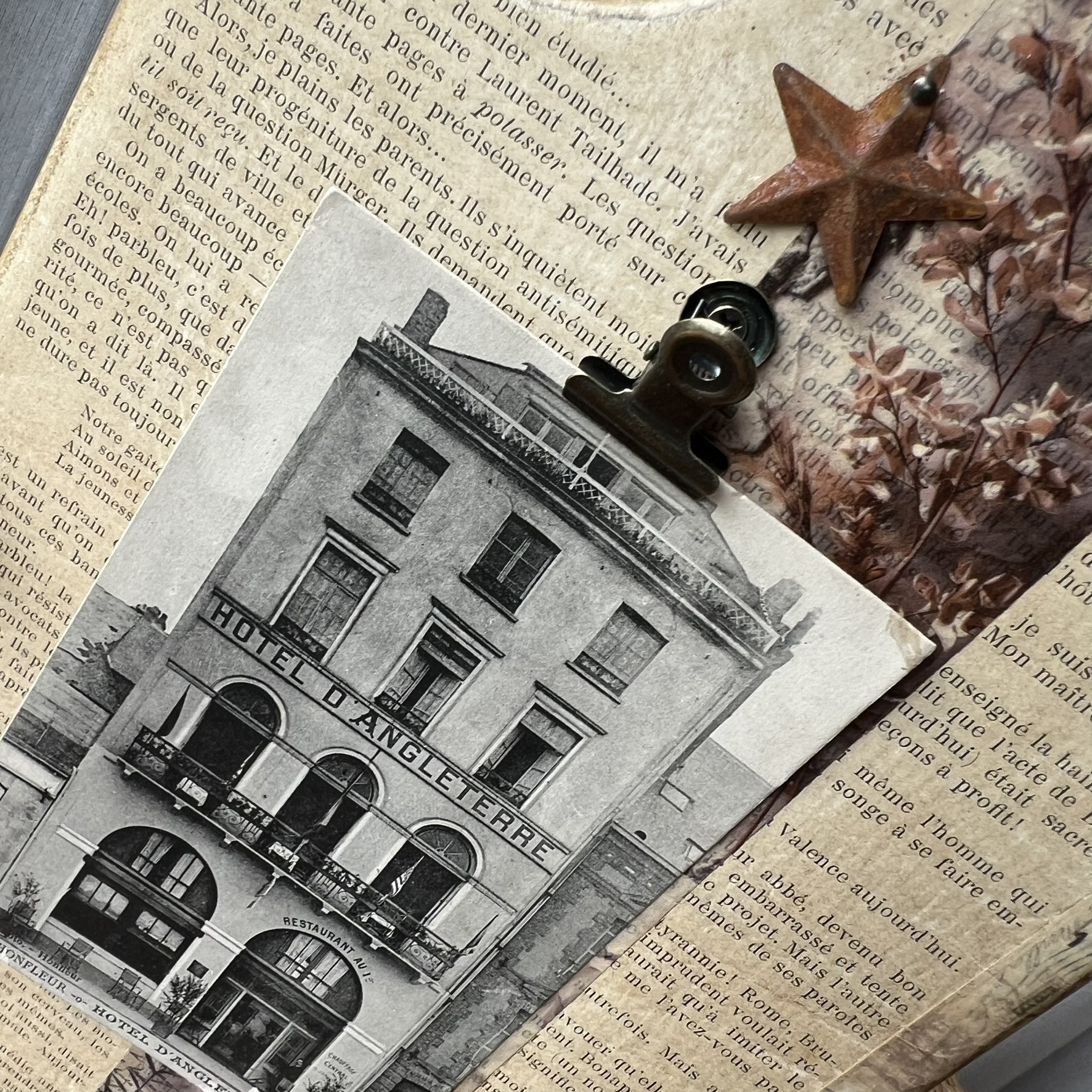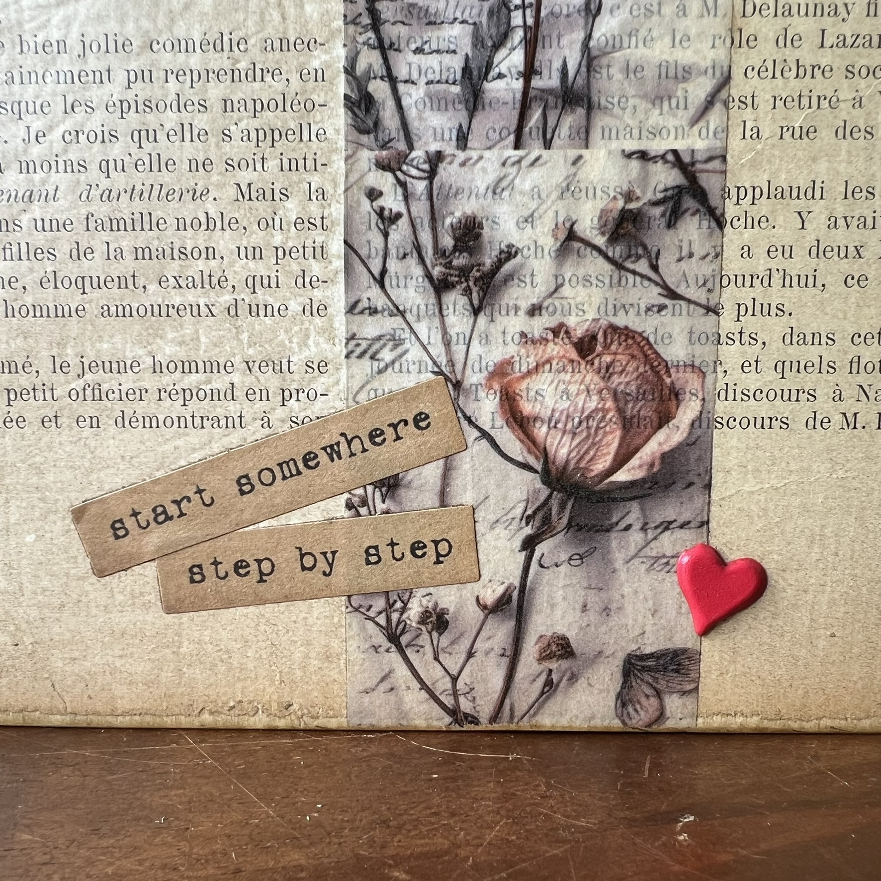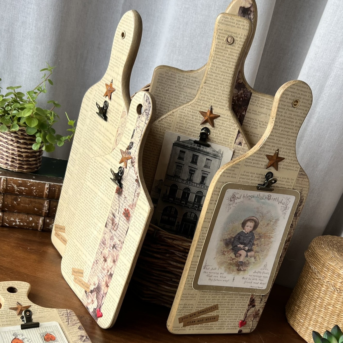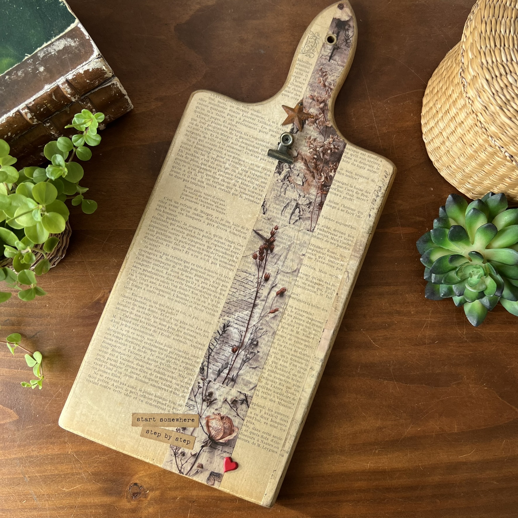 Quelques éléments décoratifs viennent ensuite raconter une nouvelle histoire : détails floraux, mots positifs, petite étoile métallique et pince ancienne permettant d’accueillir une photo, une carte postale, une liste ou un mot doux.