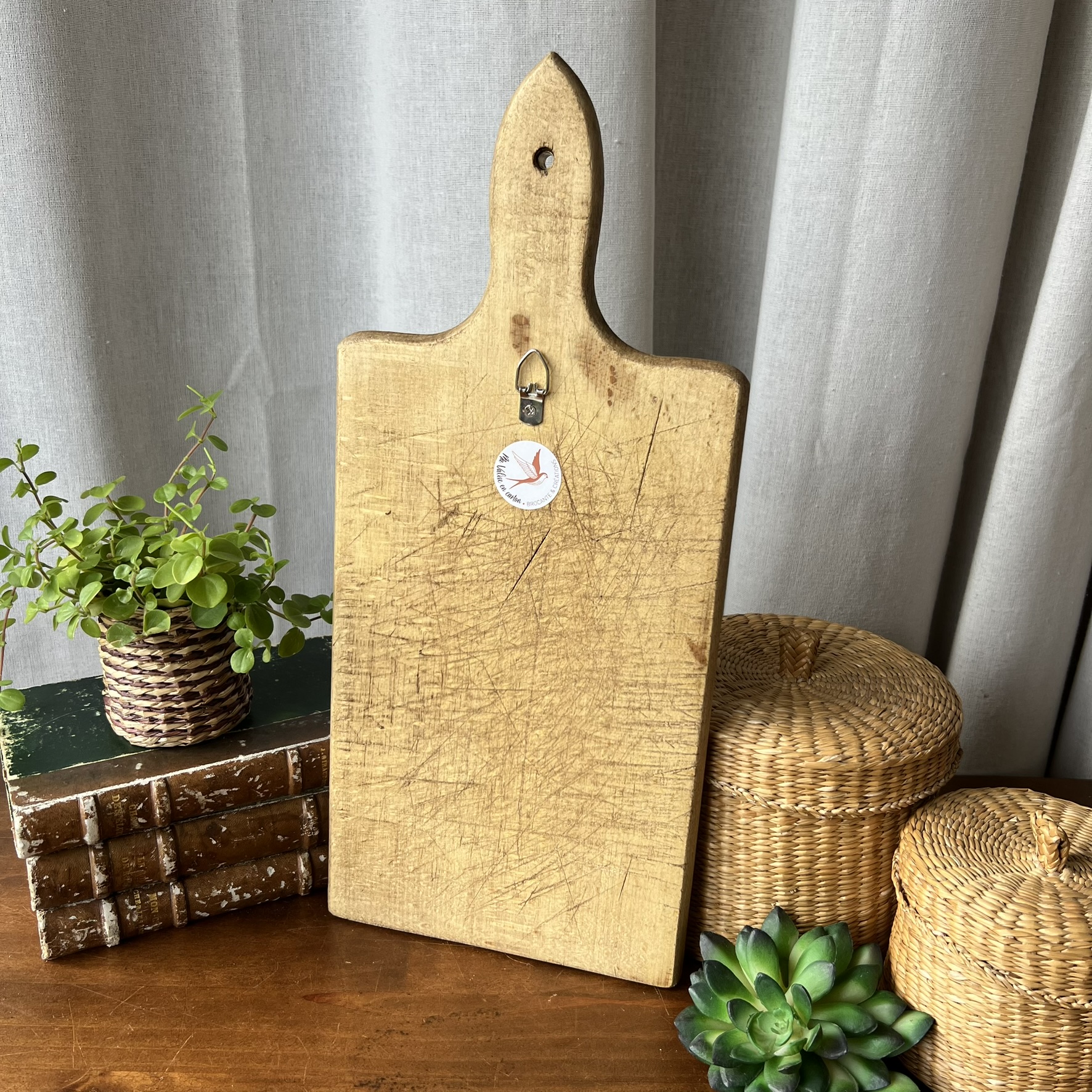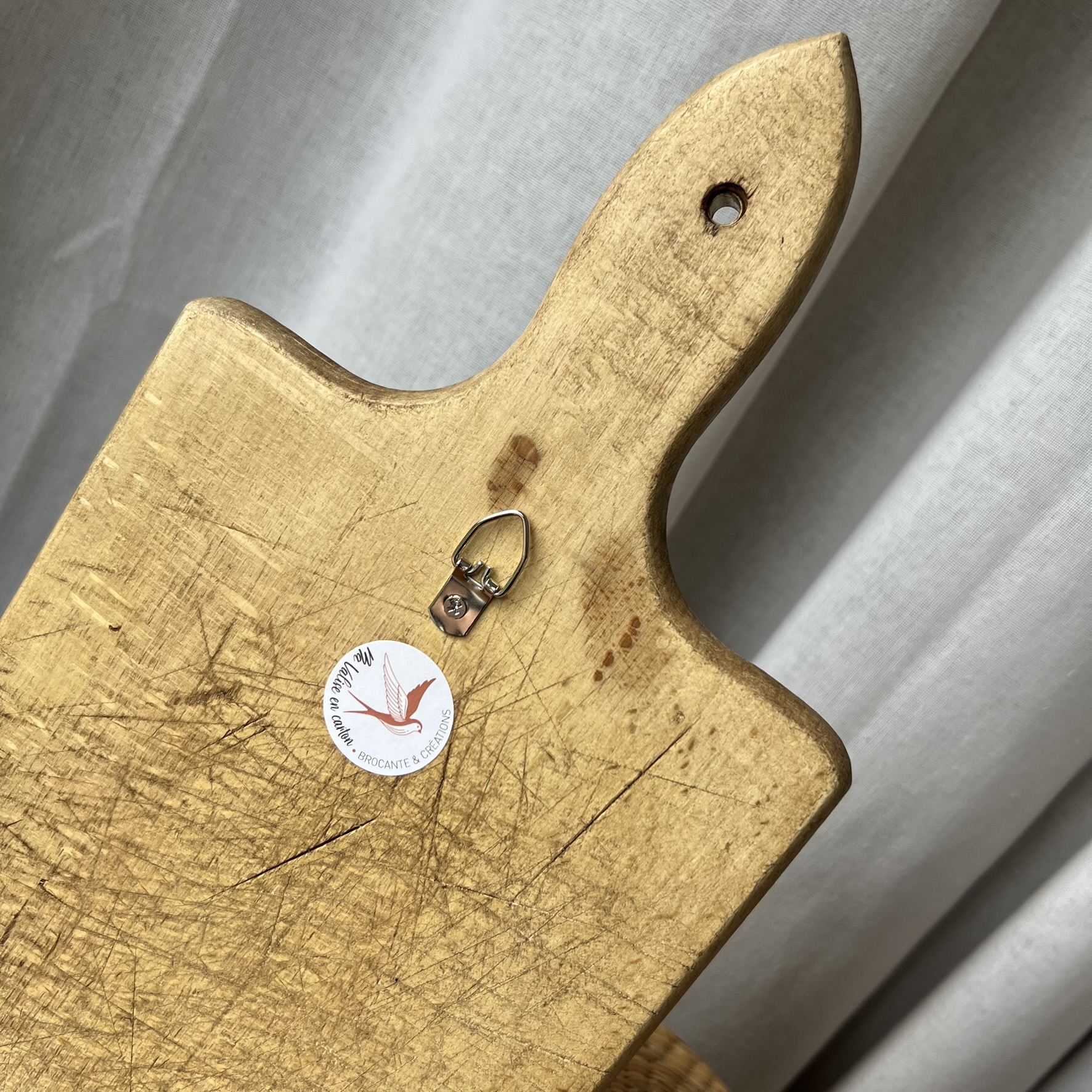 Ancienne planche à découper ayant déjà bien vécu, soigneusement poncée pour retrouver douceur et caractère.