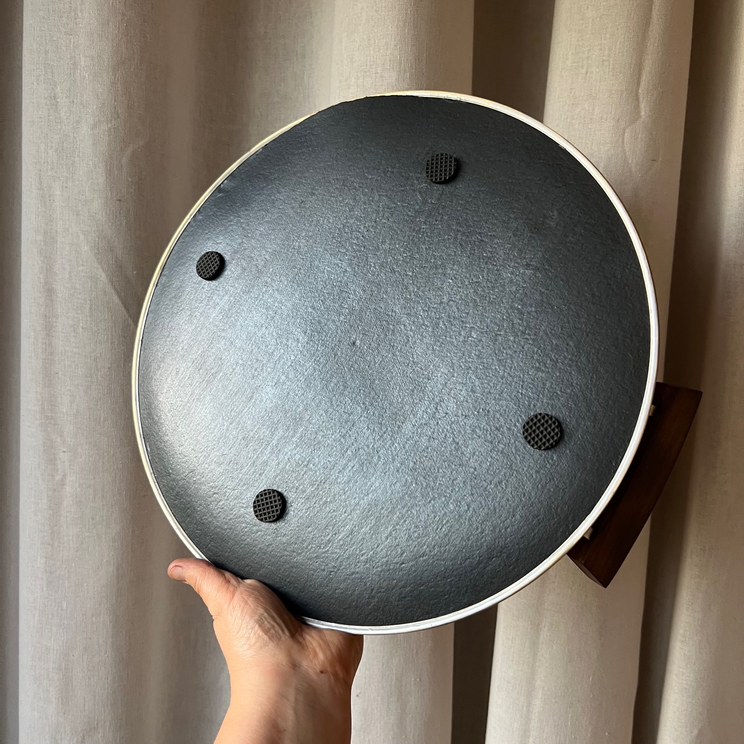 Le cerclage métallique, avec sa teinte mordorée entre l’or et l’argent, dialogue parfaitement avec les poignées en bois qui apportent chaleur et équilibre. Le dos a été entièrement repris : patine noire, finitions soignées et quatre petits patins pour que tout soit doux au contact des meubles.