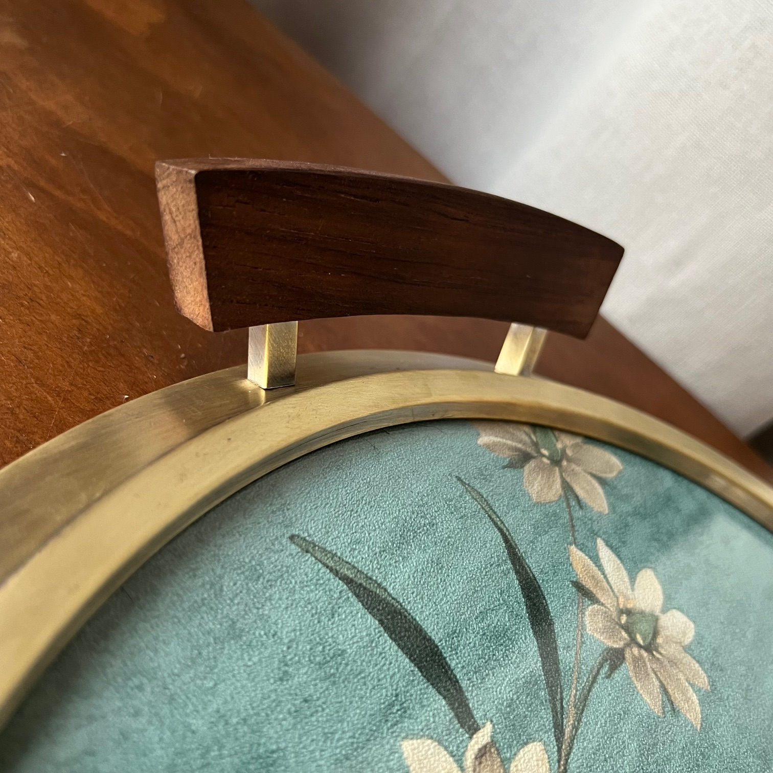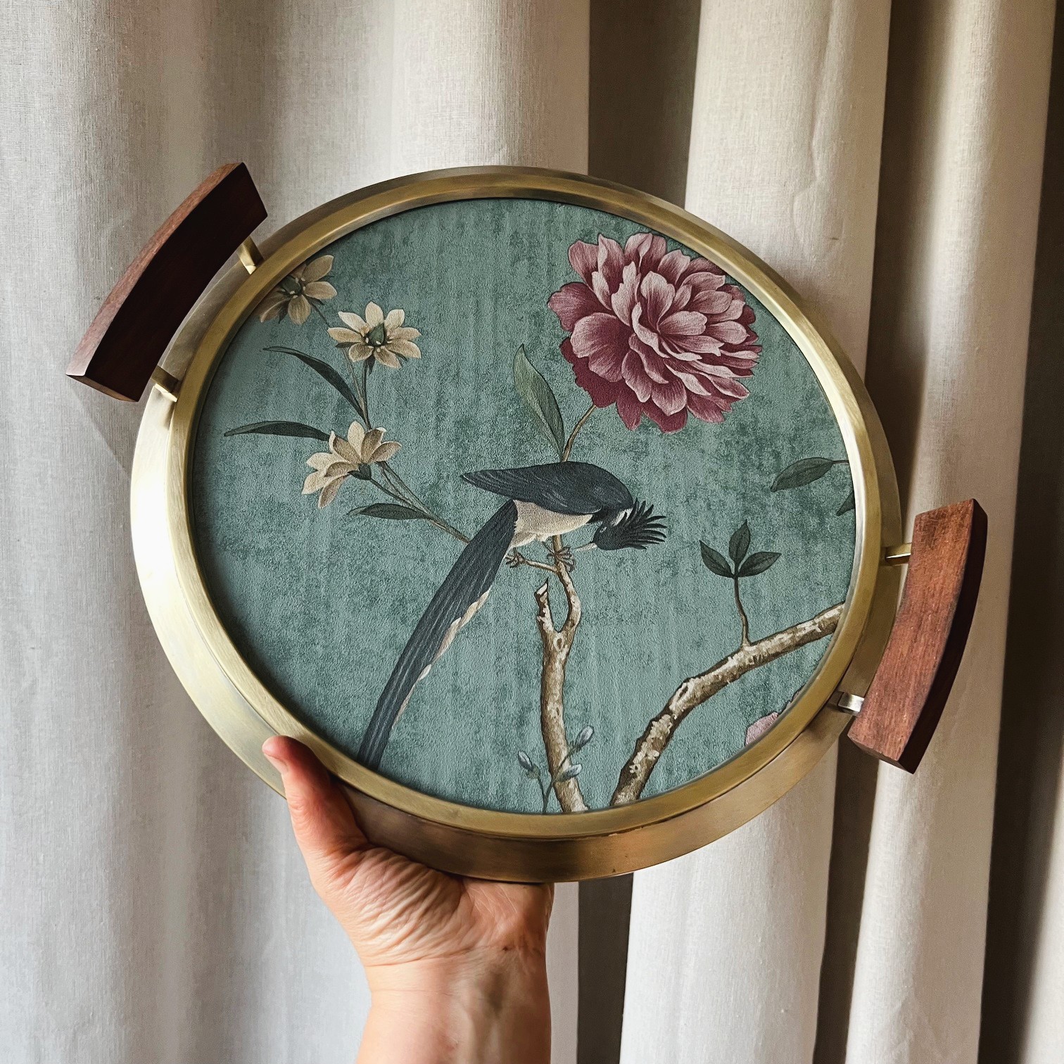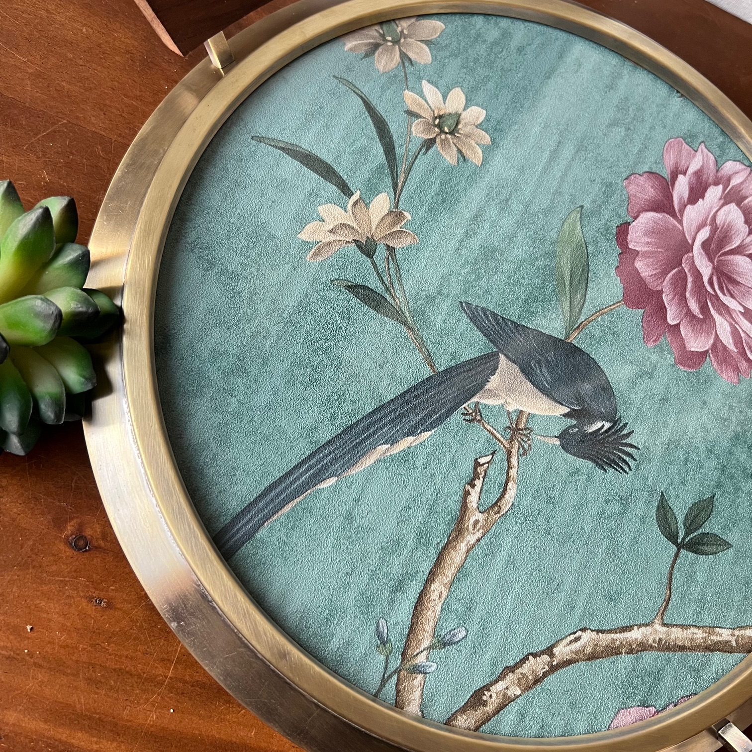 Après avoir retiré la partie argentée du miroir, il ne restait qu’une surface claire, idéale pour accueillir un décor. J’y ai glissé une chute de papier peint : un oiseau délicat, posé sur une branche, entouré de fleurs roses et ivoire sur un fond vert d’eau. Une scène douce, presque silencieuse, désormais protégée par le verre d’origine (avec ses quelques marques du temps… presque 100 ans !), comme un tableau sous verre.