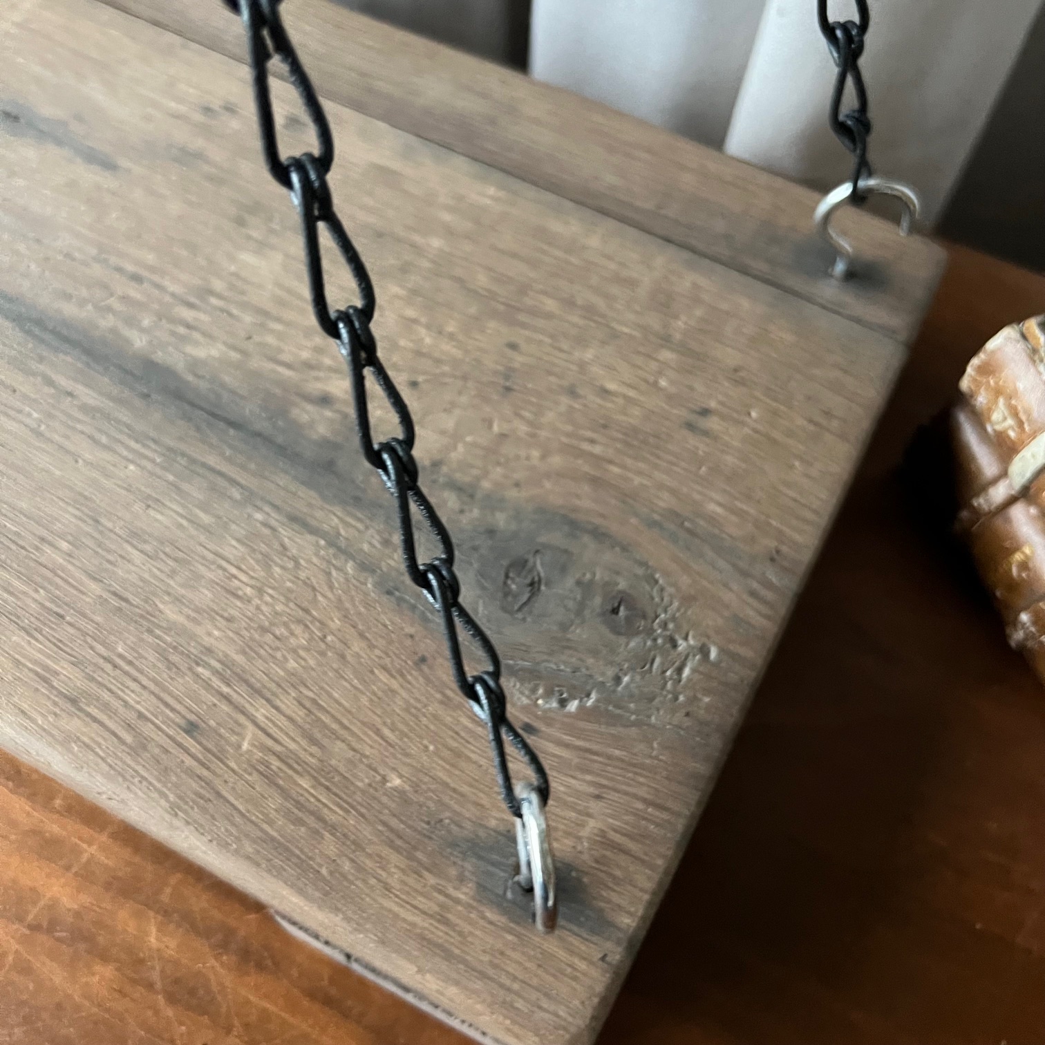 Un ancien plateau de balance revisité par le temps, suspendu par quatre belles chaînettes terminées par une boucle solide.
