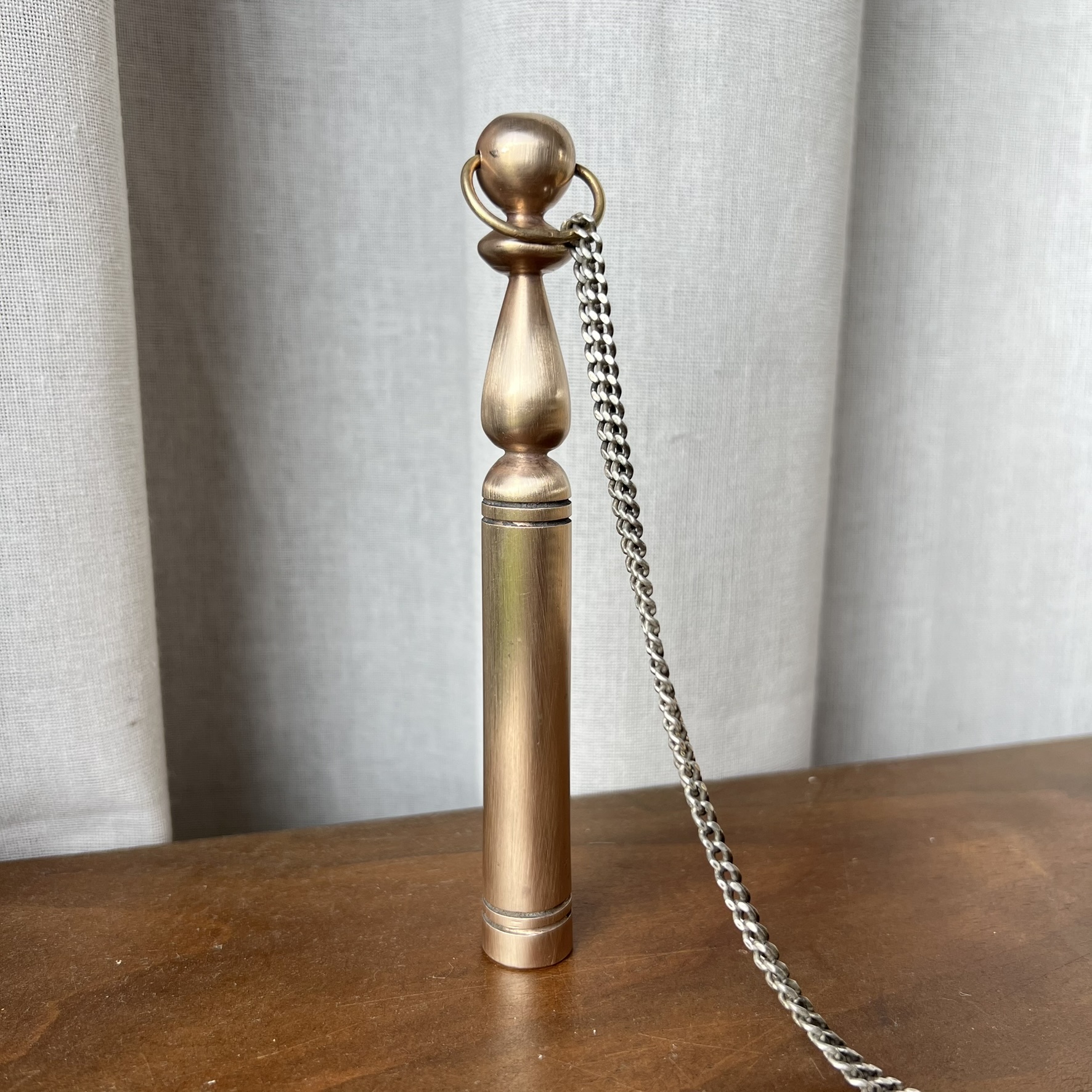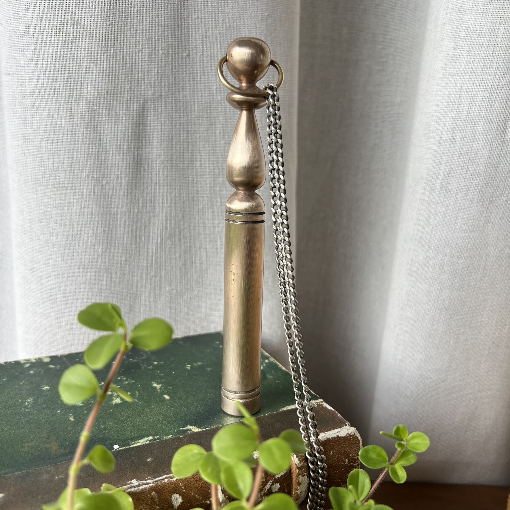 Celle-ci est en laiton massif, 15 cm de hauteur, belle présence, belle densité. Elle est lourde en main. Stable. Avec sa chaînette argentée qui lui donne ce petit détail presque cérémonial.