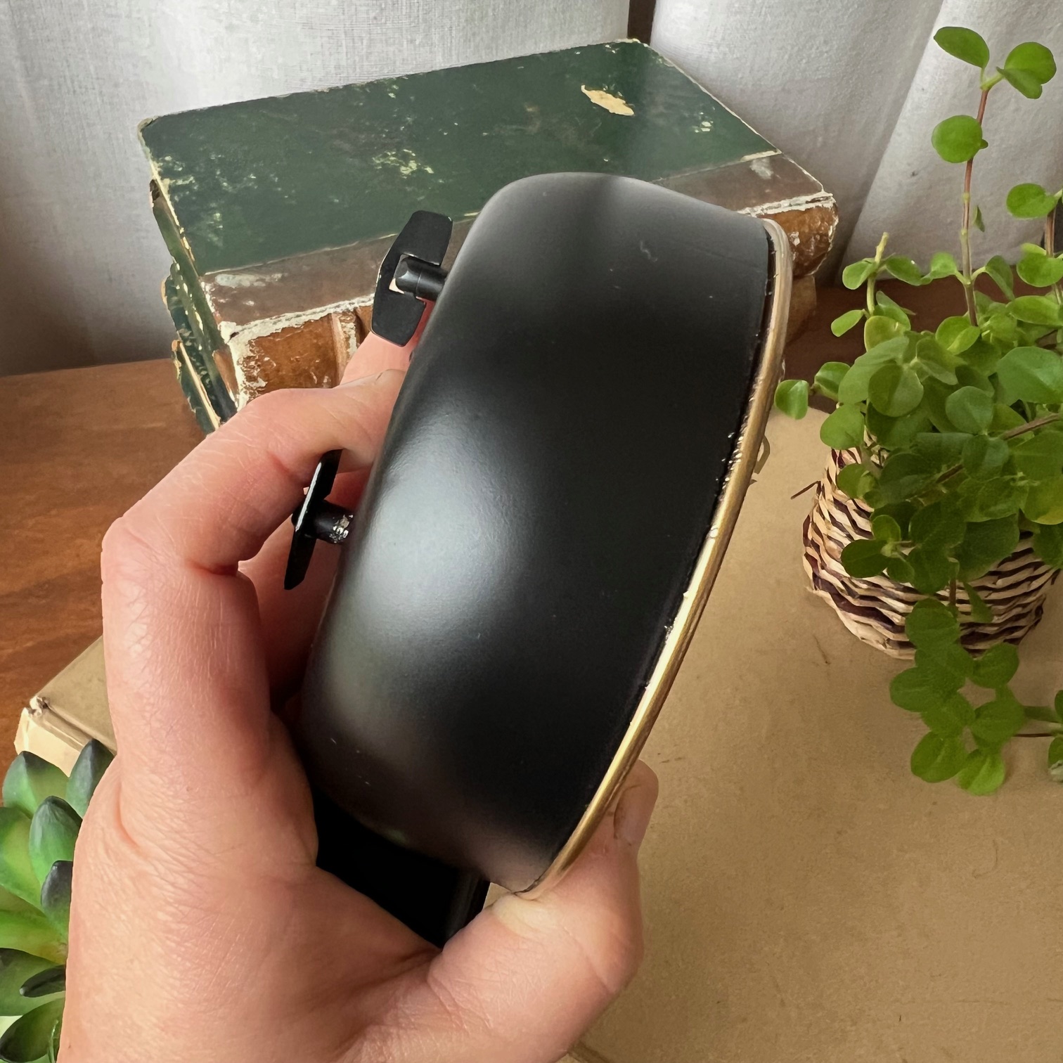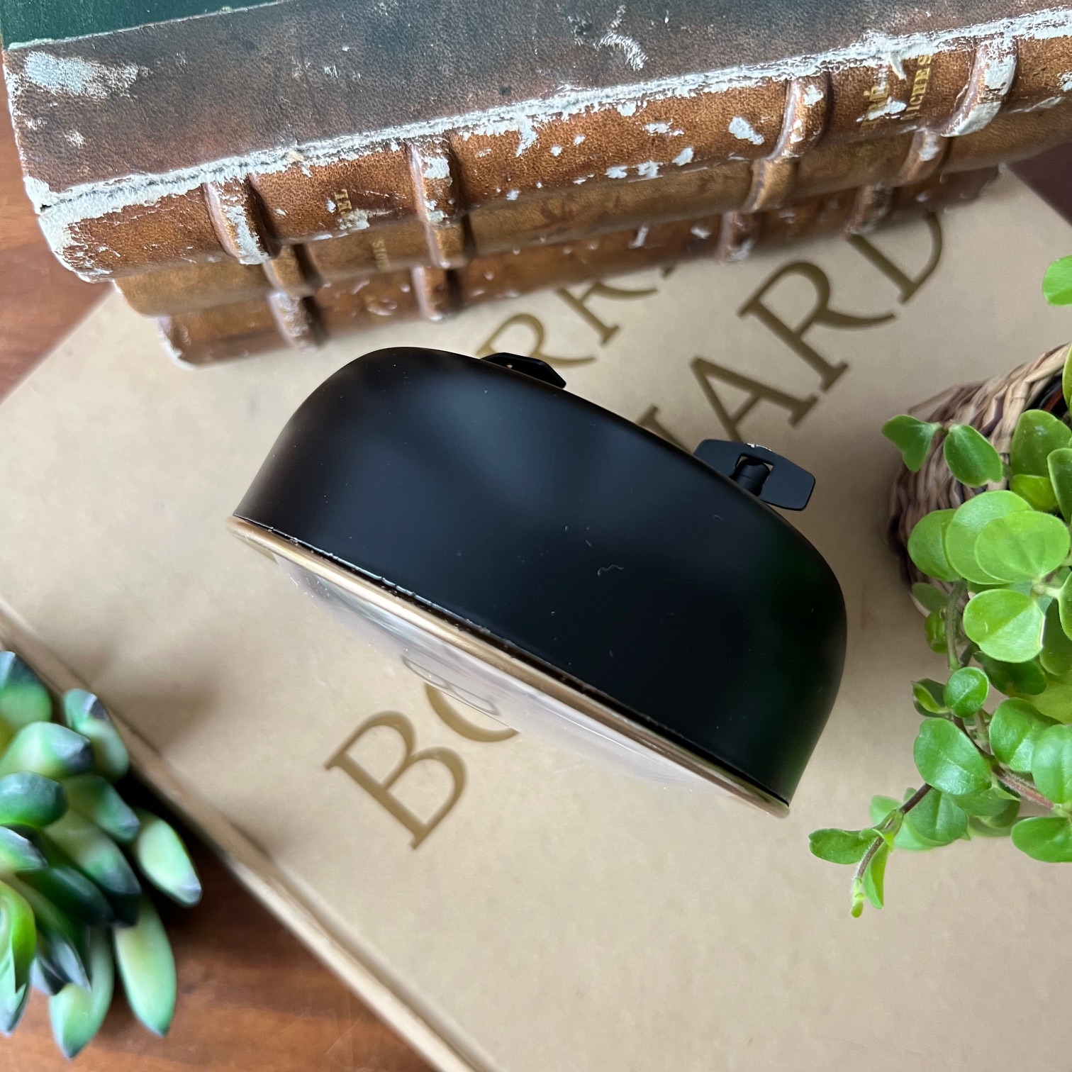 Un réveil tout en nuances, entre métal noir et doré patiné, où chaque reflet semble raconter une nuit passée ou un matin à venir. Son cadran bombé capture la lumière avec douceur, comme un clin d’œil au temps qui file.