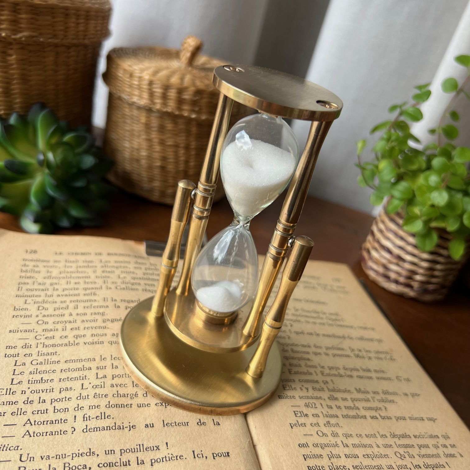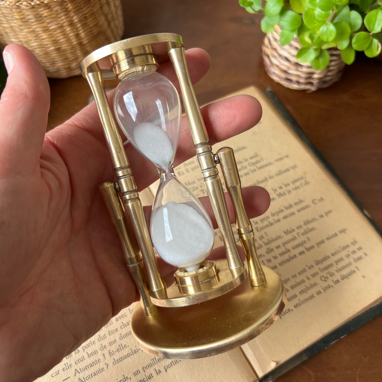Ce grand sablier au cadre en laiton et aux fioles de verre renferme un sable blanc fin, qui s’écoule en trois minutes… le temps parfait pour un œuf à la coque !