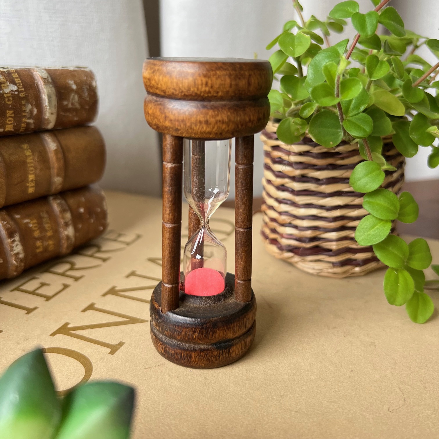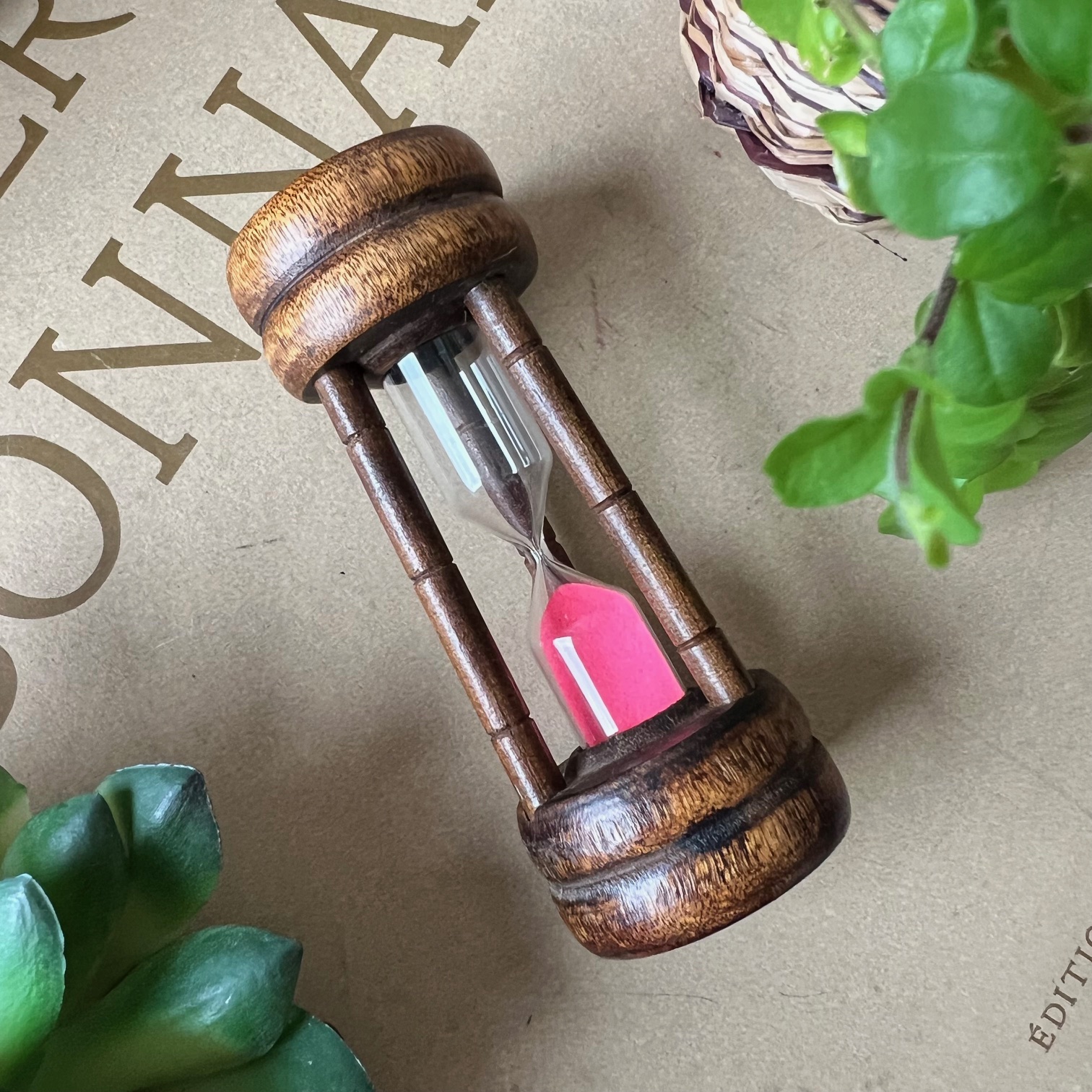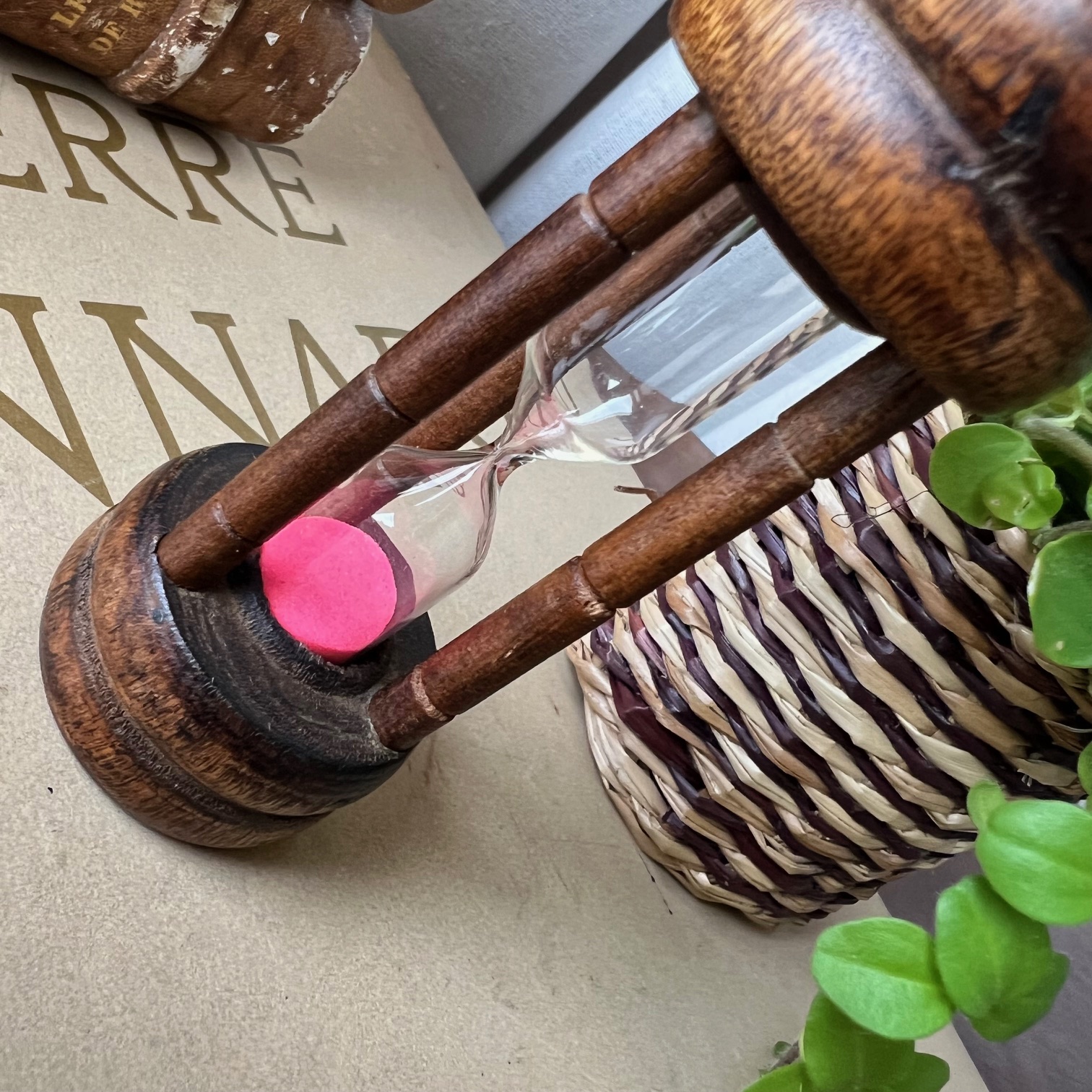 On croit toujours que le temps est beige ou gris… celui-ci dit exactement le contraire. Ce sablier en bois, avec sa partie centrale en verre, renferme un sable rose presque fluo. Une petite excentricité qui met de la joie partout où il passe.