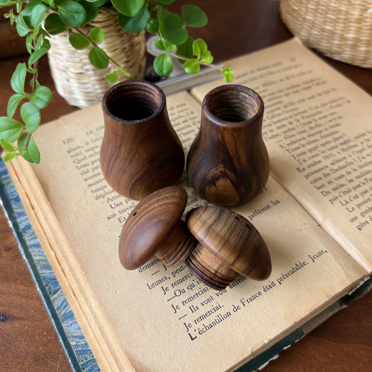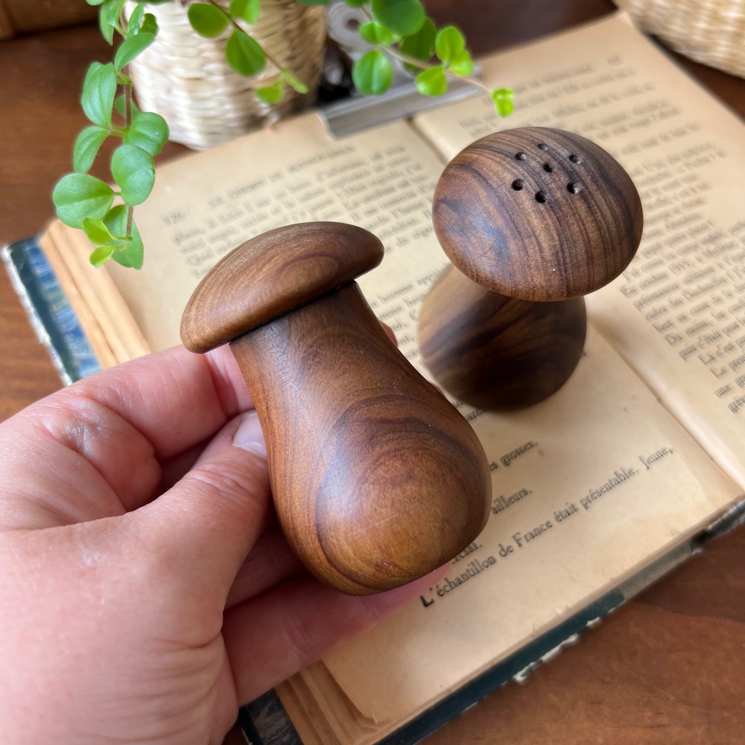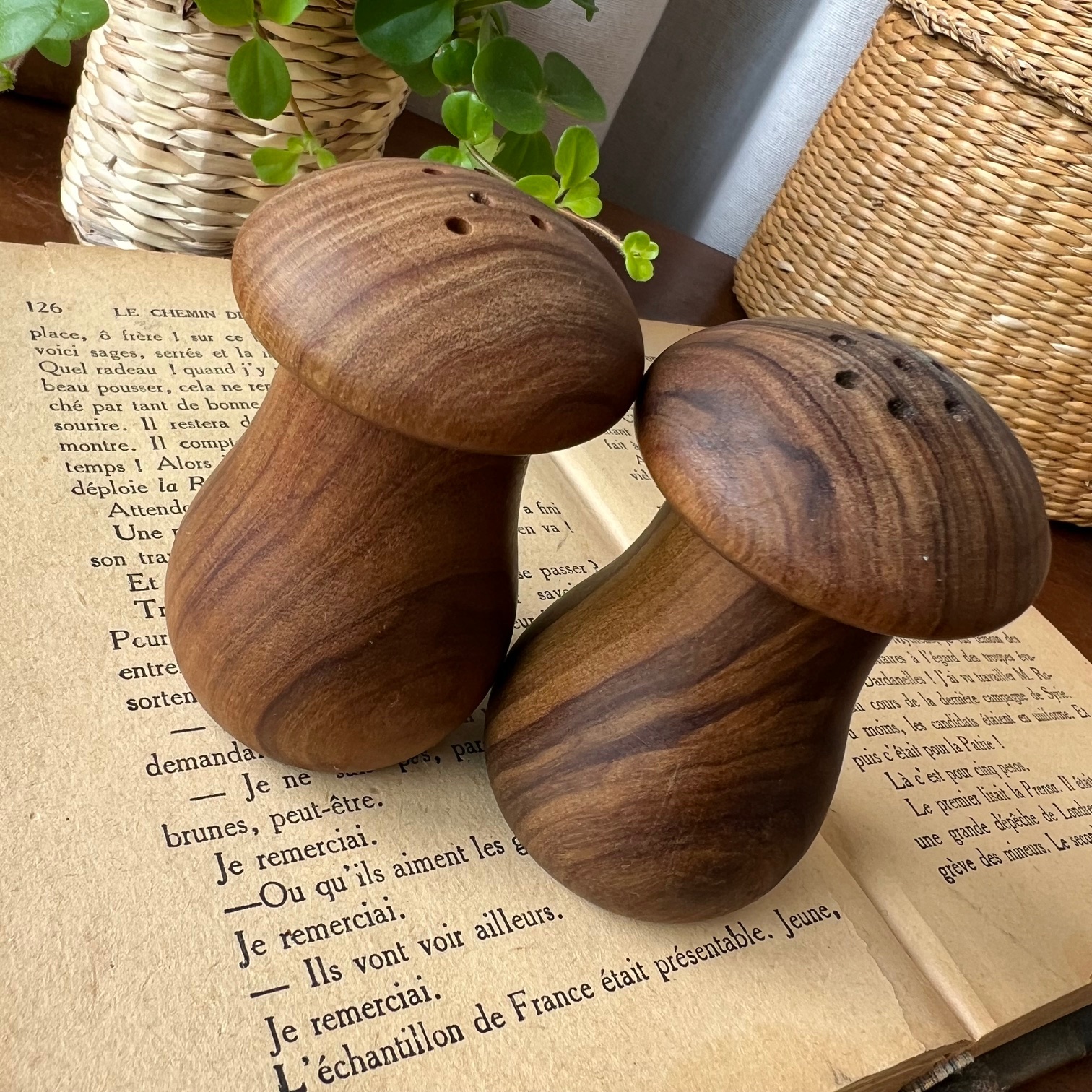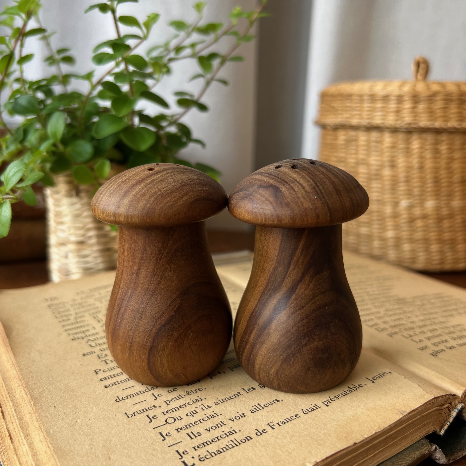Un duo plein de charme pour la cuisine ou la table : salière et poivrière en bois, en forme de champignons. Leur belle patine révèle le grain du bois et l’ingéniosité d’un design à la fois ludique et pratique : les têtes se dévissent pour un remplissage tout en simplicité.