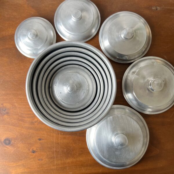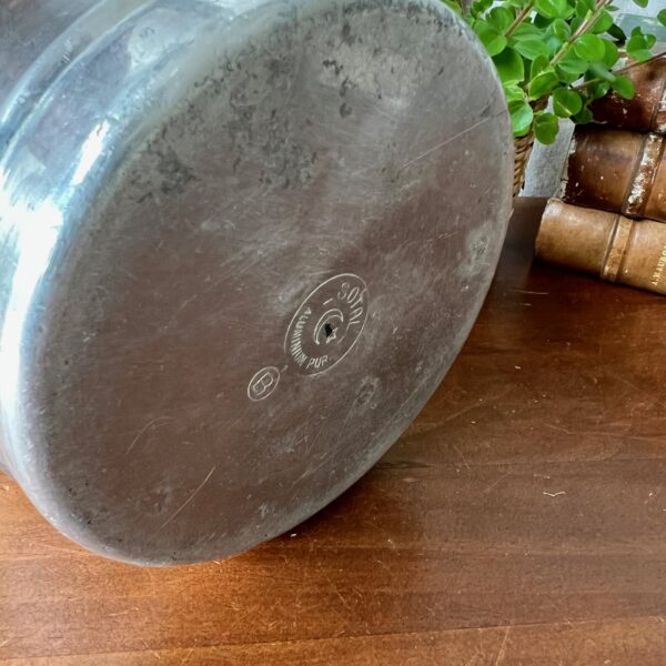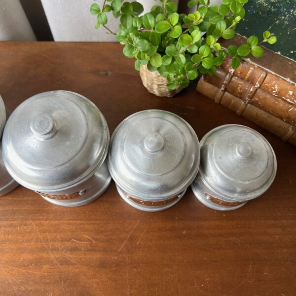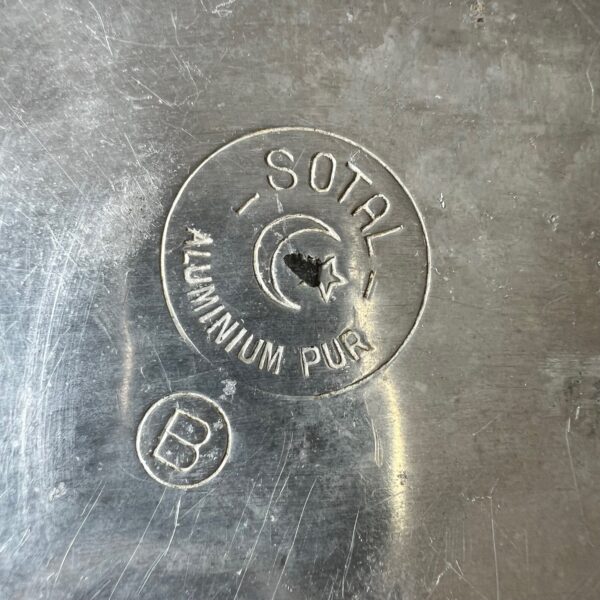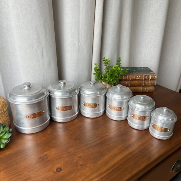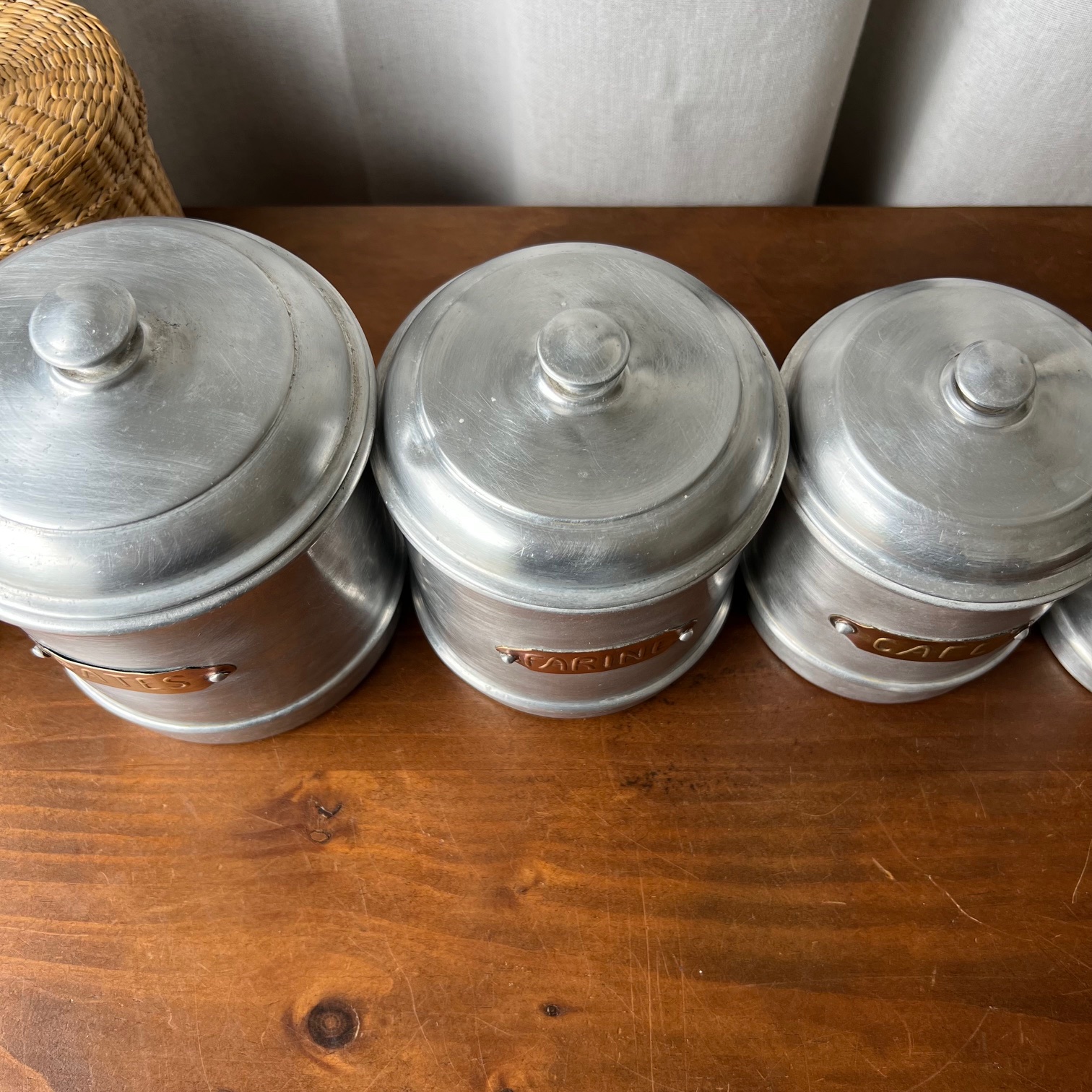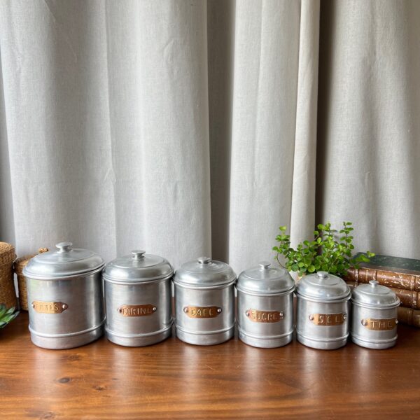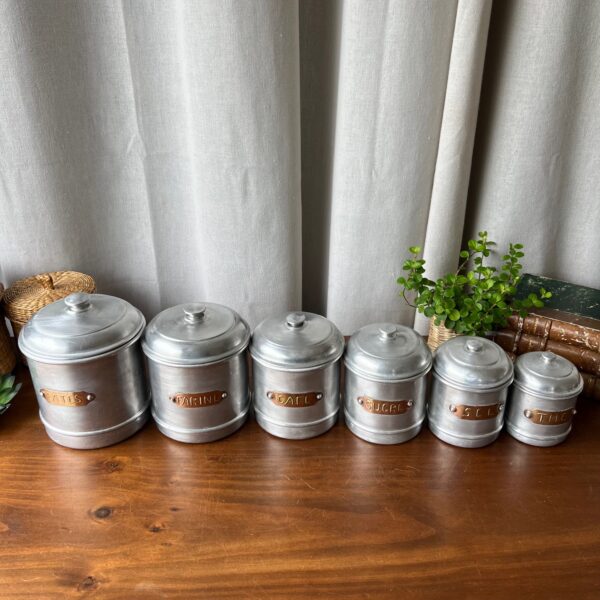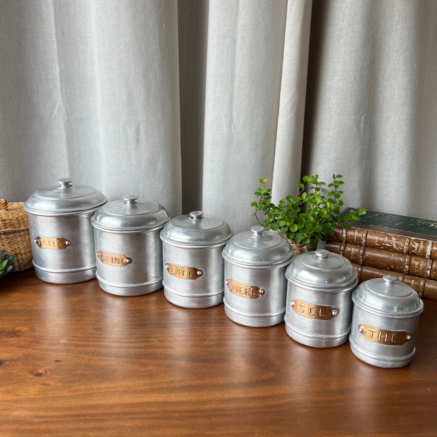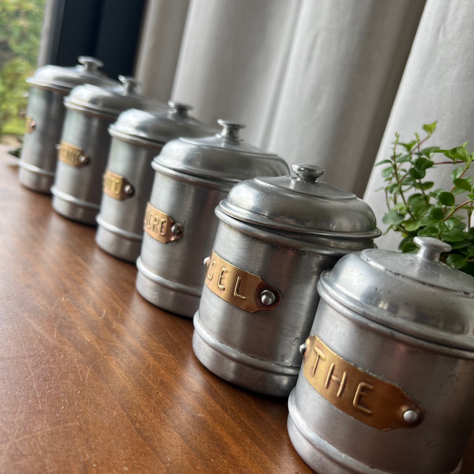 Jolie patine pour cette série de 6 pots à épices anciens en aluminium avec leur joli petite plaque en laiton doré : pâtes, farine, café, sucre, sel et thé ! Idéal pour l’usage ou en déco. Des marques du temps bien naturelles. On craque ! Les pots sont gigognes et se rangent dans le plus grand des pots, couvercles compris. Estampille en dessous « Sotal Aluminium pur ».
