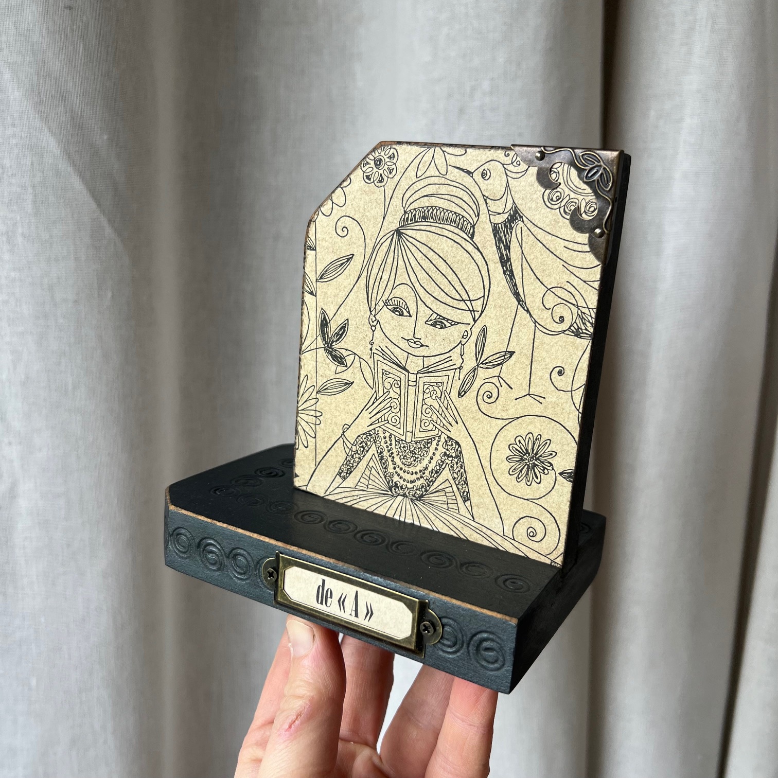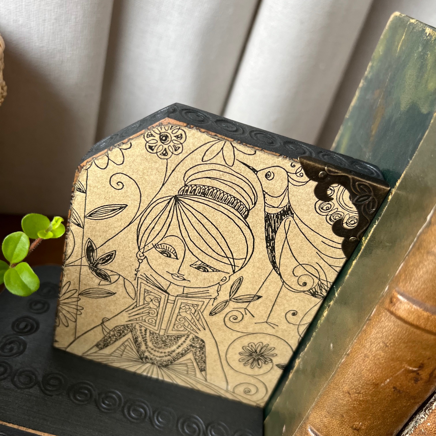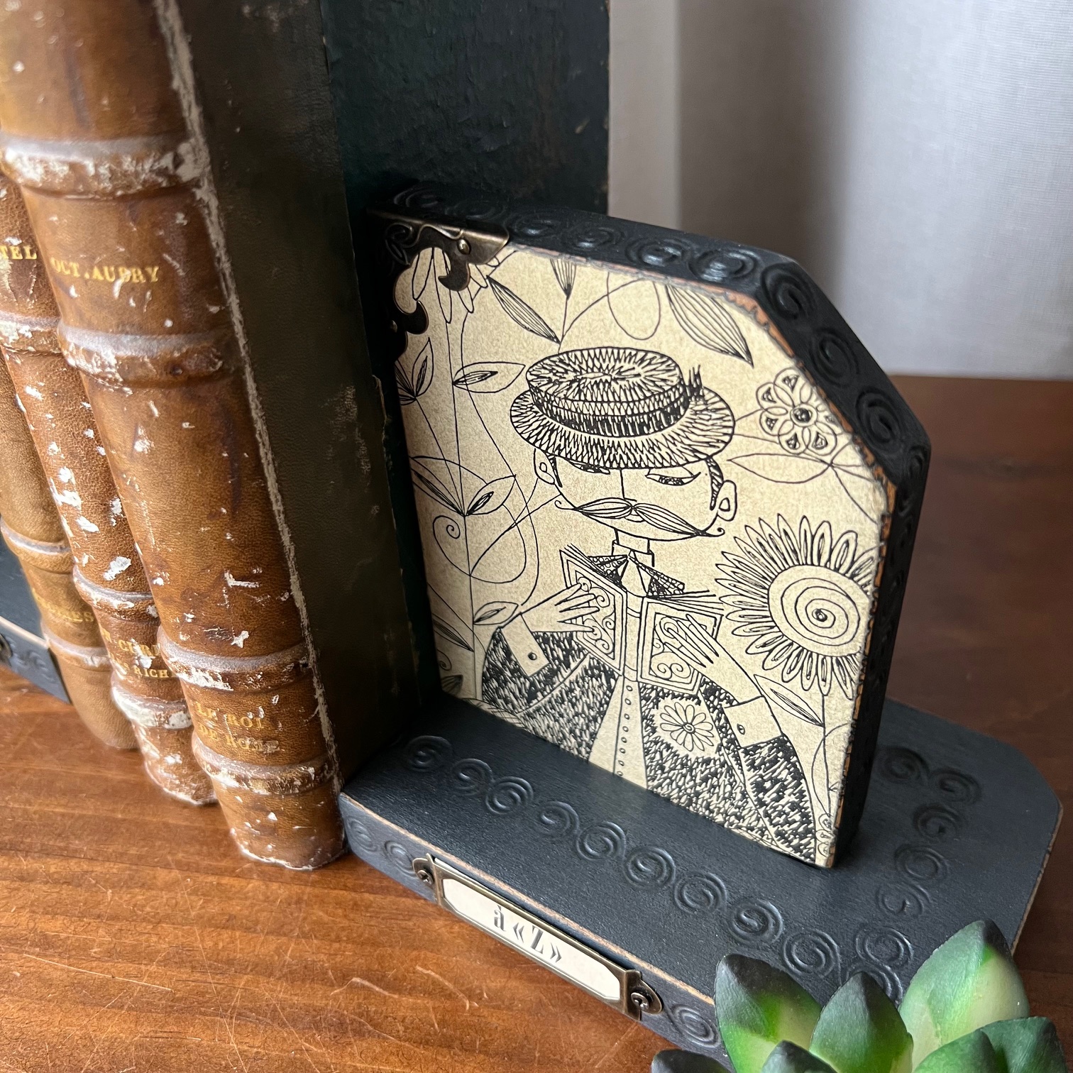 Ces serre-livres en bois accueillent d’anciennes illustrations, trouvées dans un vieux livre, contre-collées avec soin puis protégées par un vernis discret. Des images d’un autre temps, où lire était déjà un refuge, un voyage, une échappée.