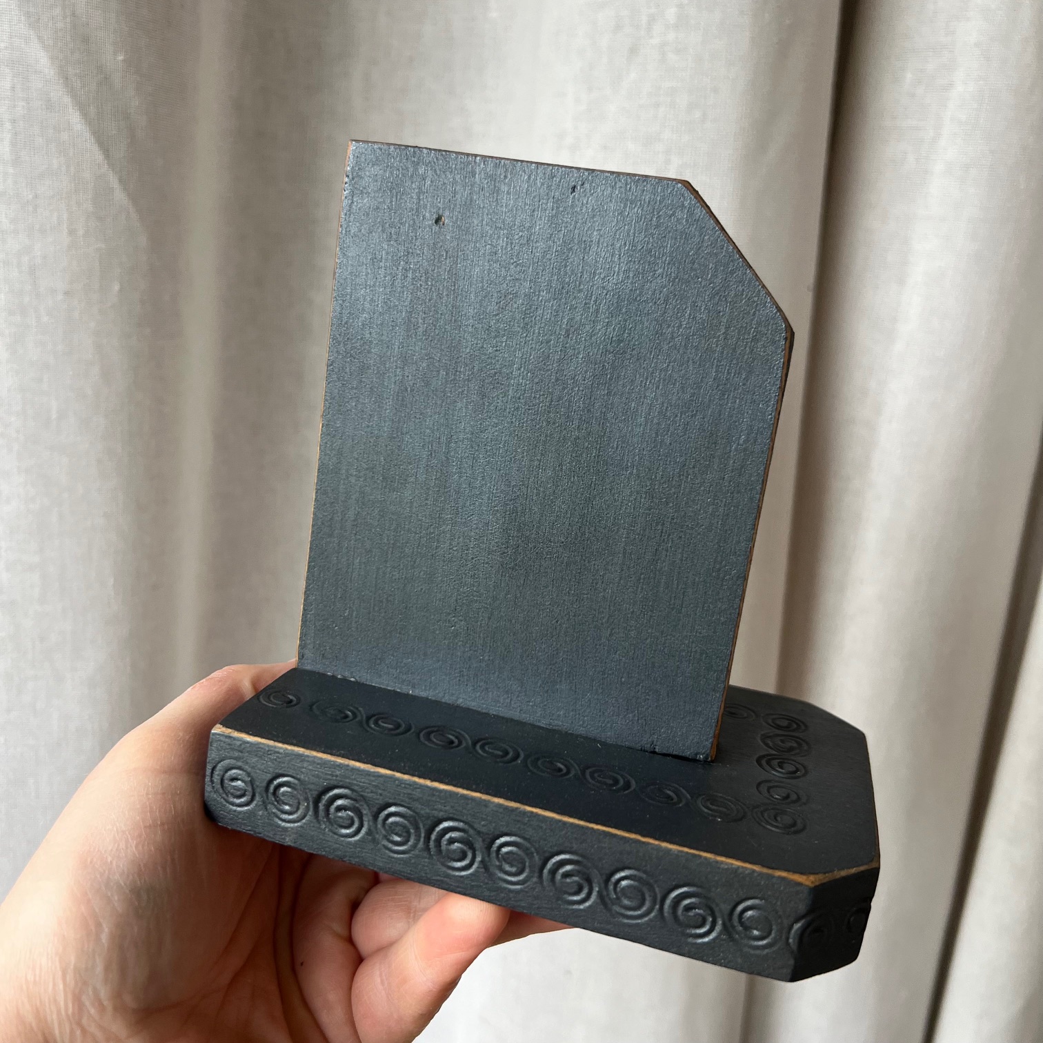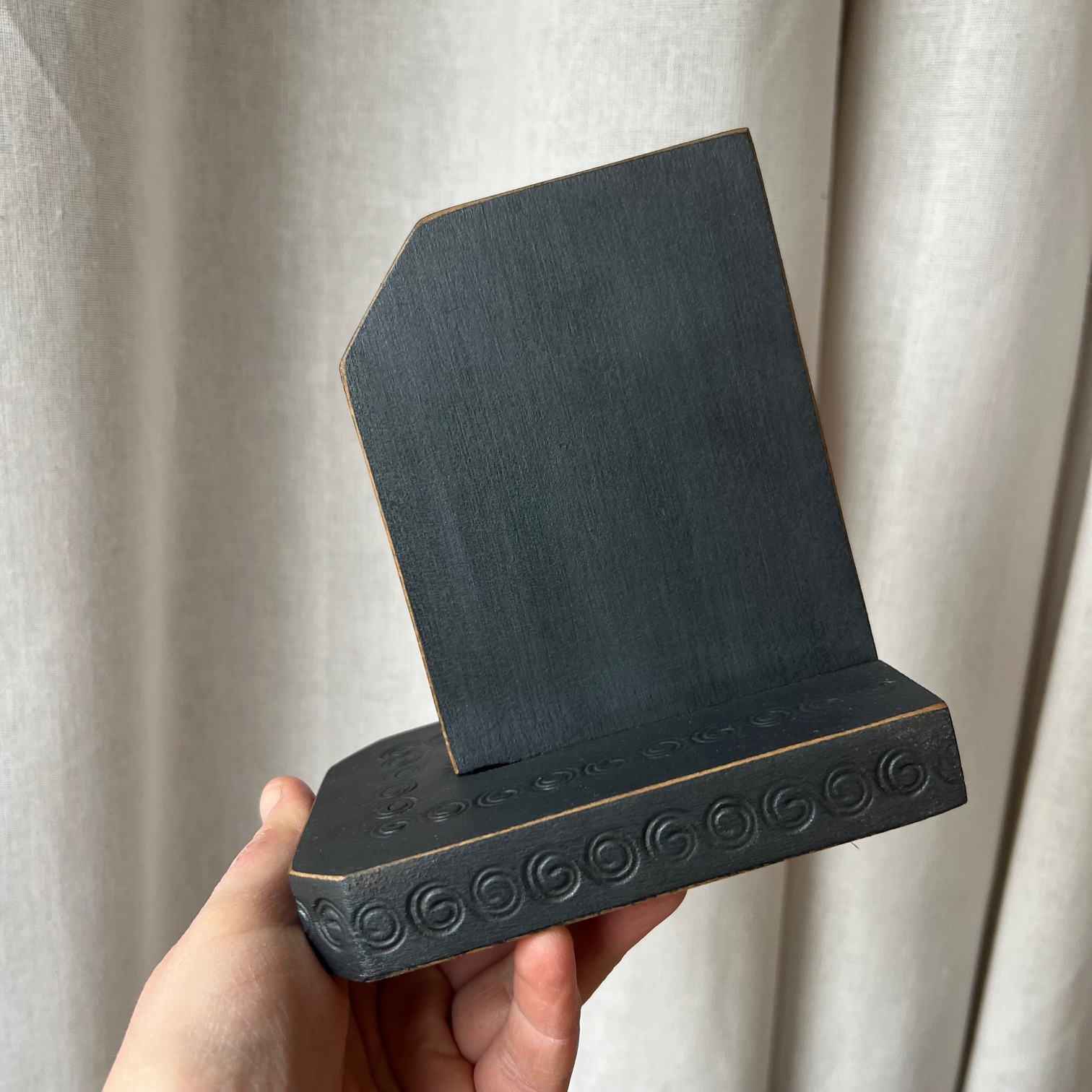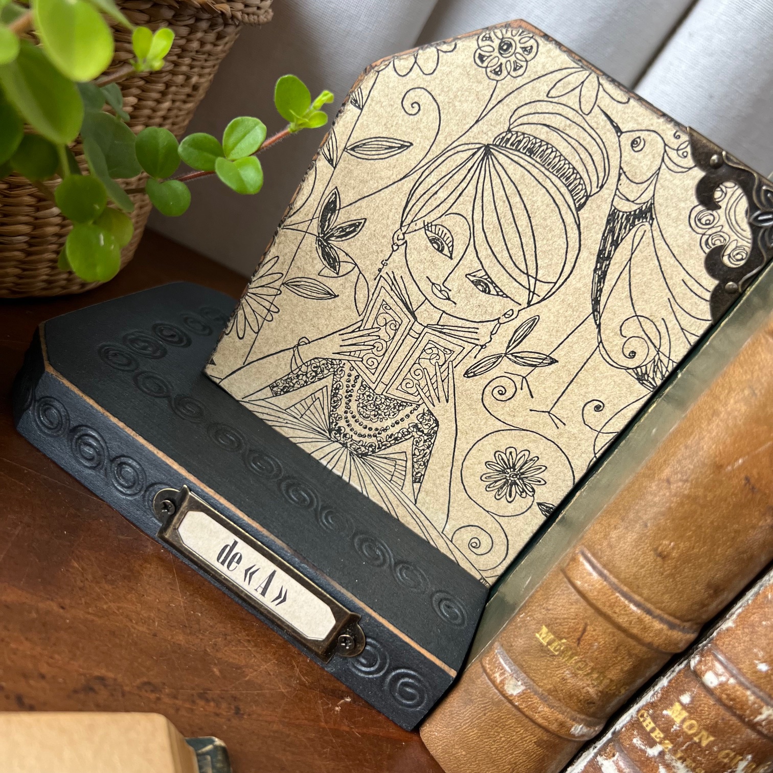 Ces serre-livres en bois accueillent d’anciennes illustrations, trouvées dans un vieux livre, contre-collées avec soin puis protégées par un vernis discret. Des images d’un autre temps, où lire était déjà un refuge, un voyage, une échappée.