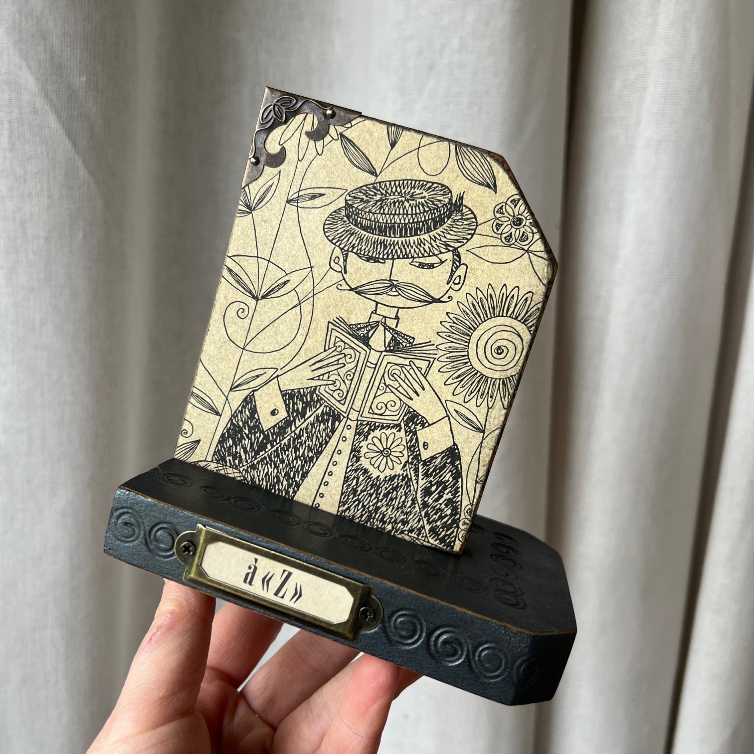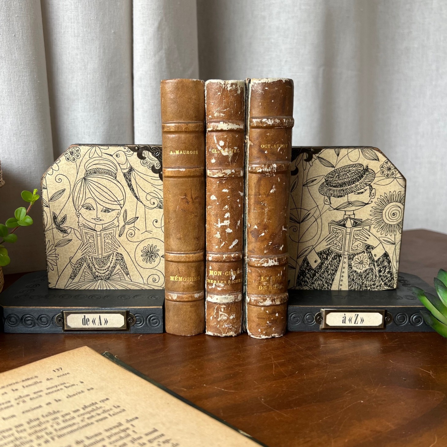 Sur le socle, un détail qui change tout : un porte-étiquette en métal doré, marqué « de A » pour l’un, « à Z » pour l’autre. Comme une promesse silencieuse : celle d’embrasser toute une bibliothèque, du premier au dernier mot.